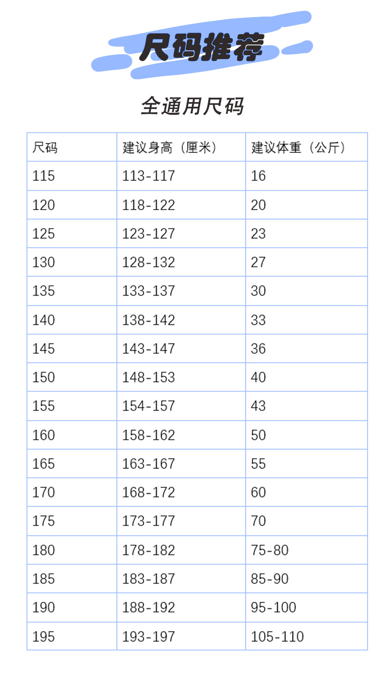 120cm; 125cm; 130cm; 135cm; 140cm; 145cm; 150cm; 155cm; 160cm; 165cm; 170cm