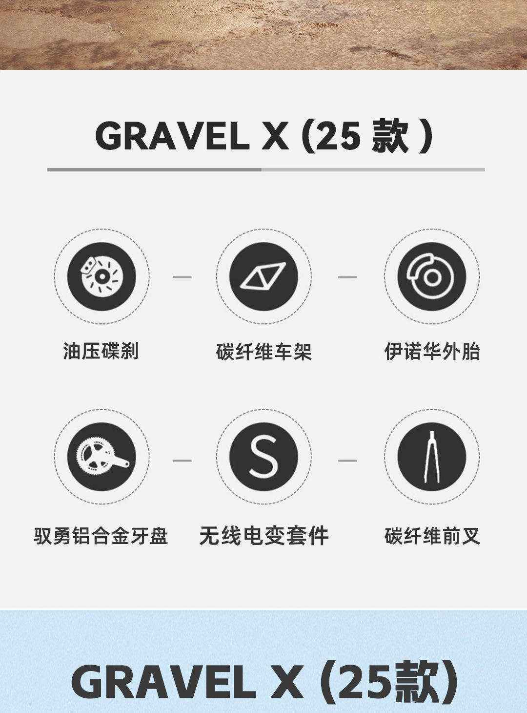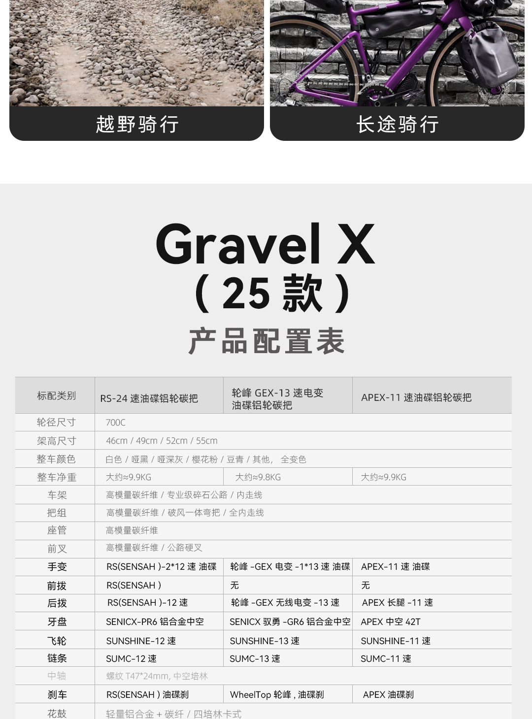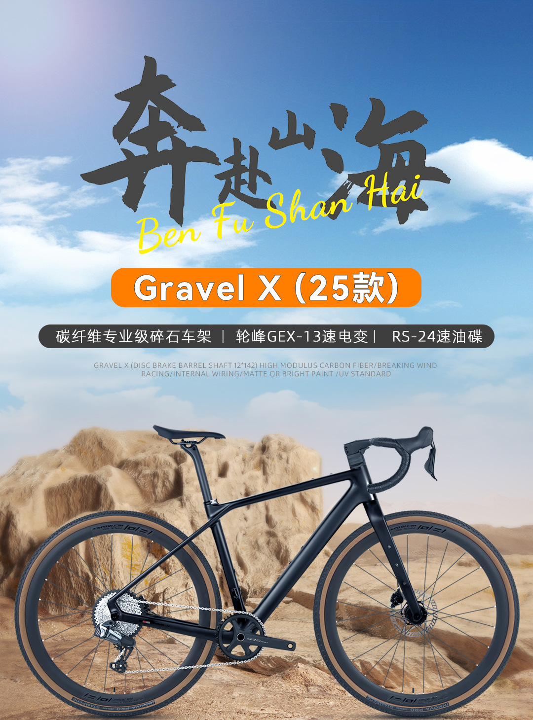 【车架】:Gravel X(碟刹桶轴12*142) 高模量碳纤维/专业级碎石公路/内走线
