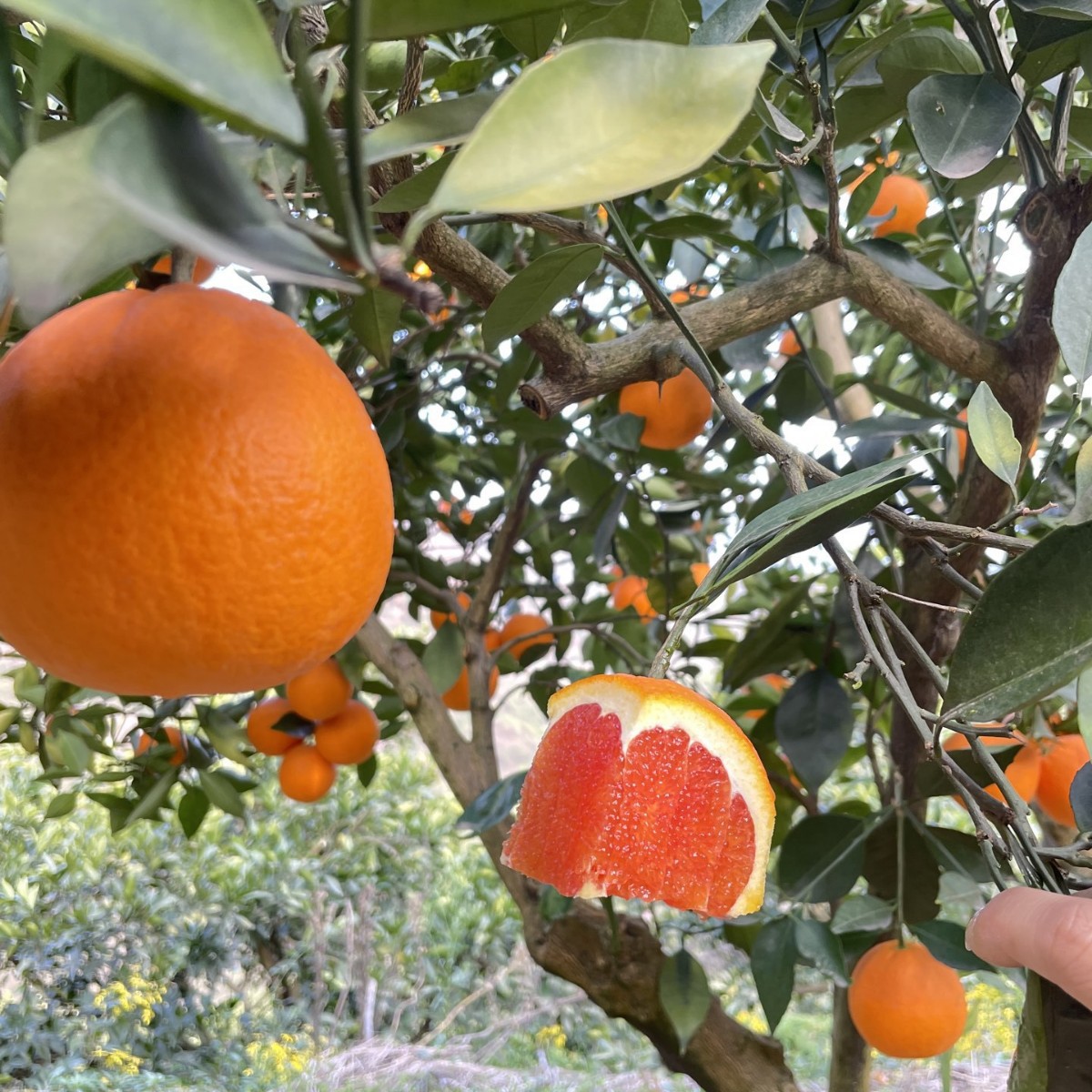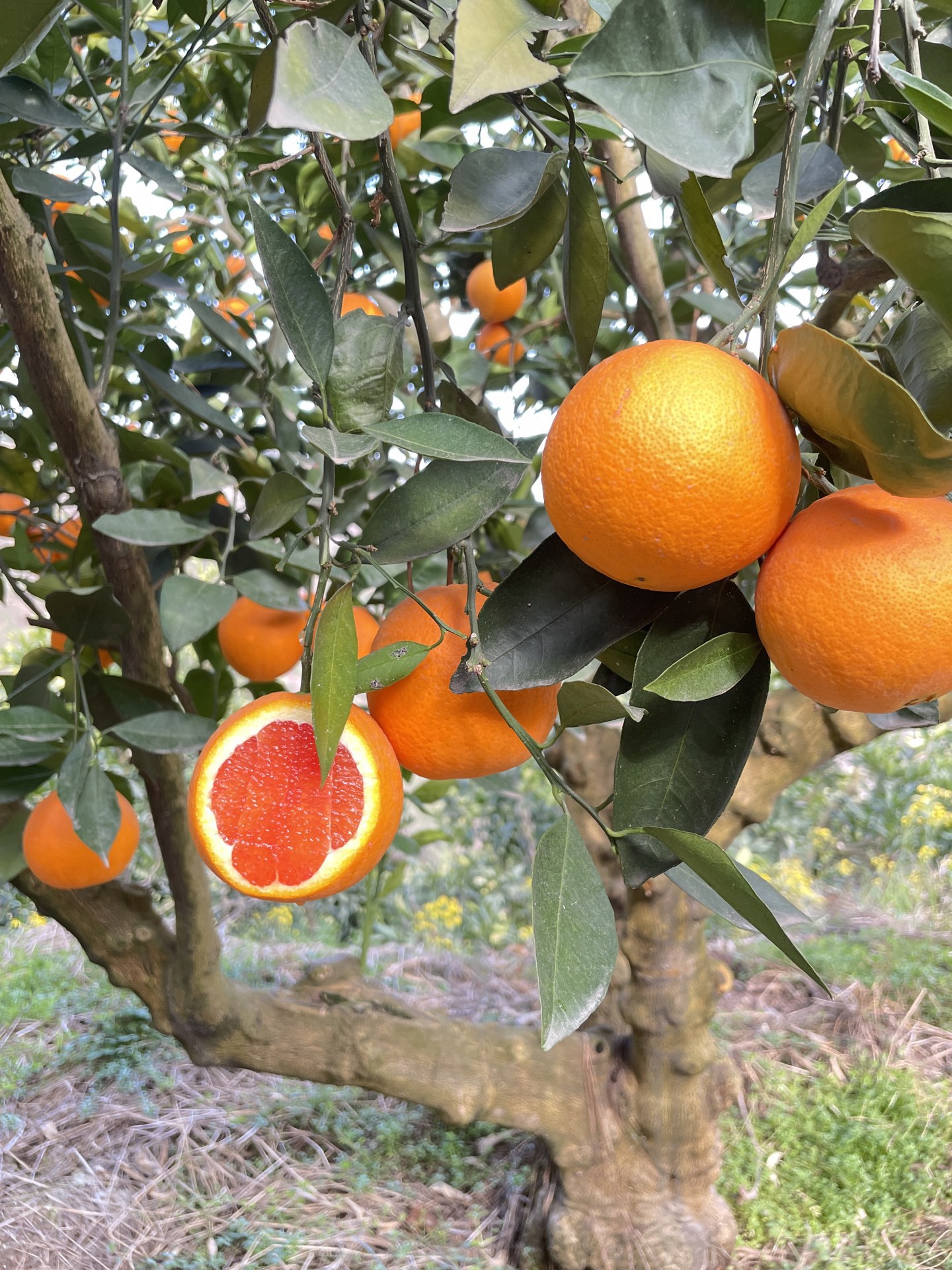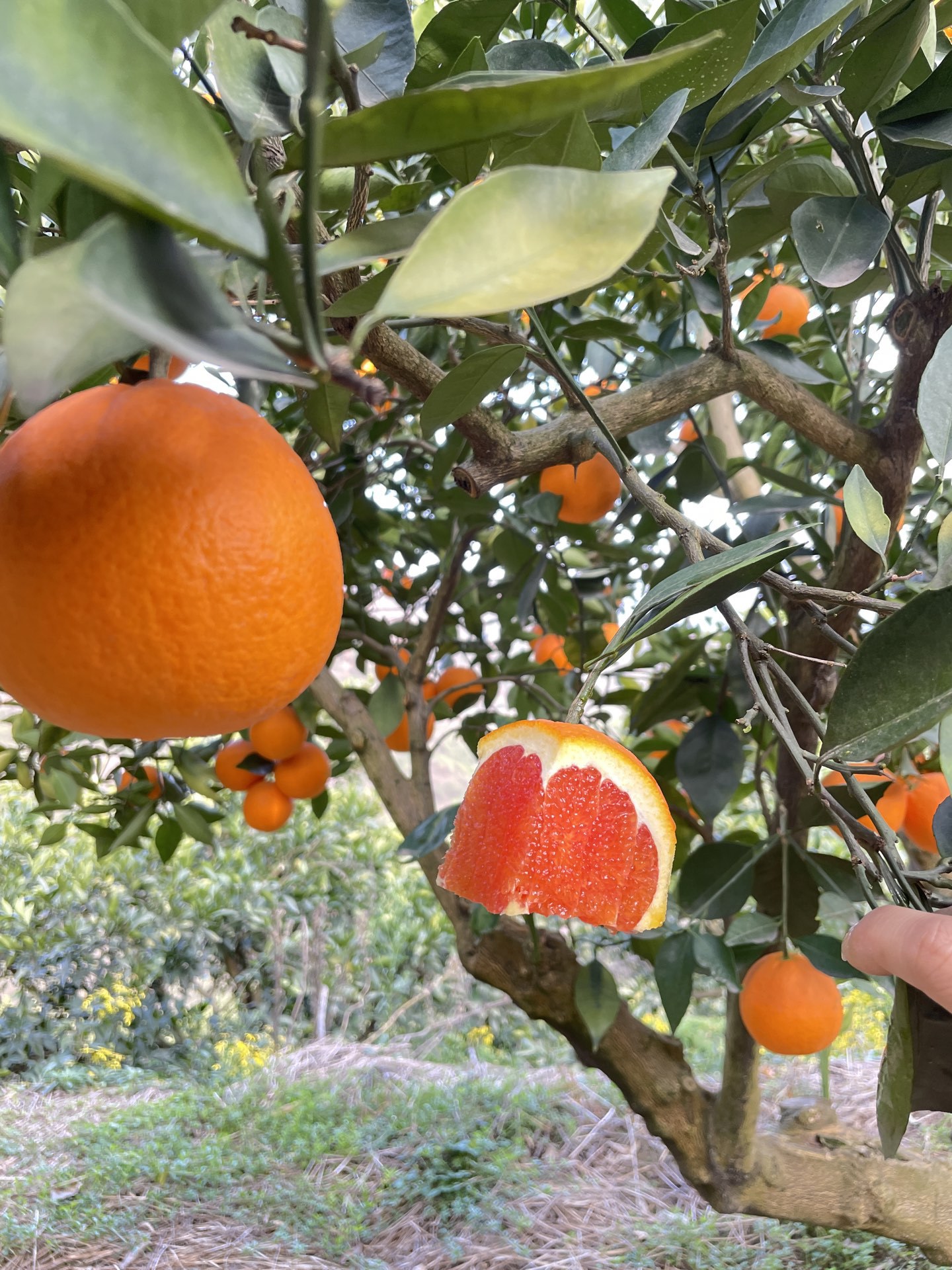我们自家有2000棵橙子树,有夏橙,爱媛,九月红,长红,园红,血橙,伦晚这些橙子品种。