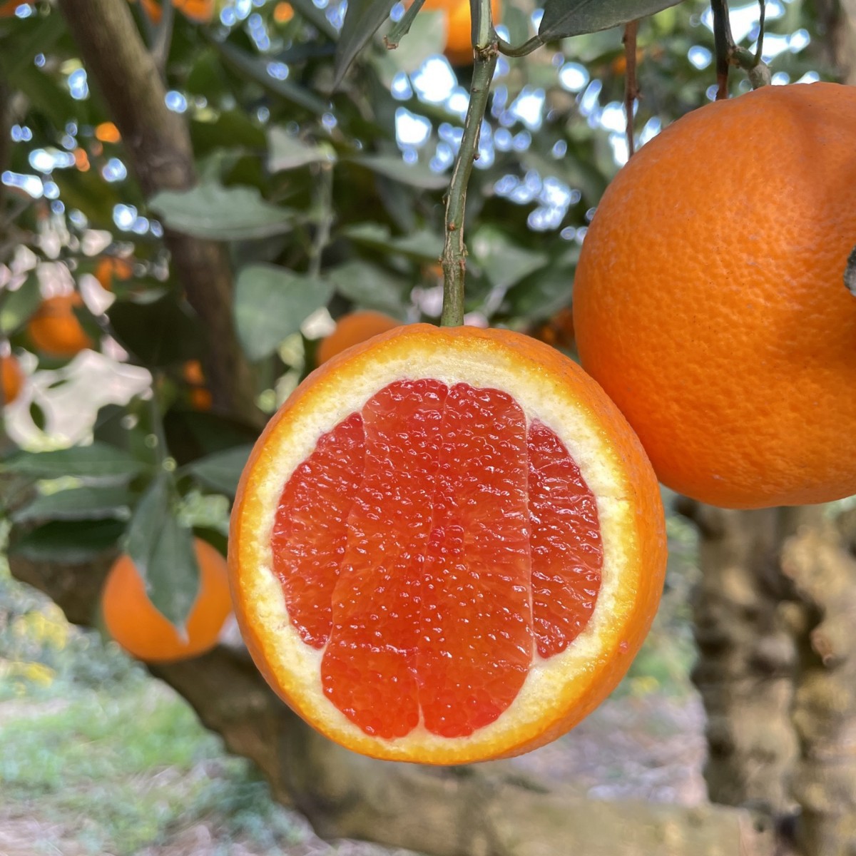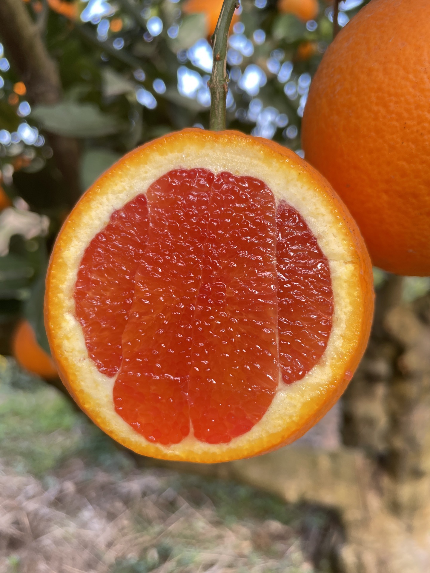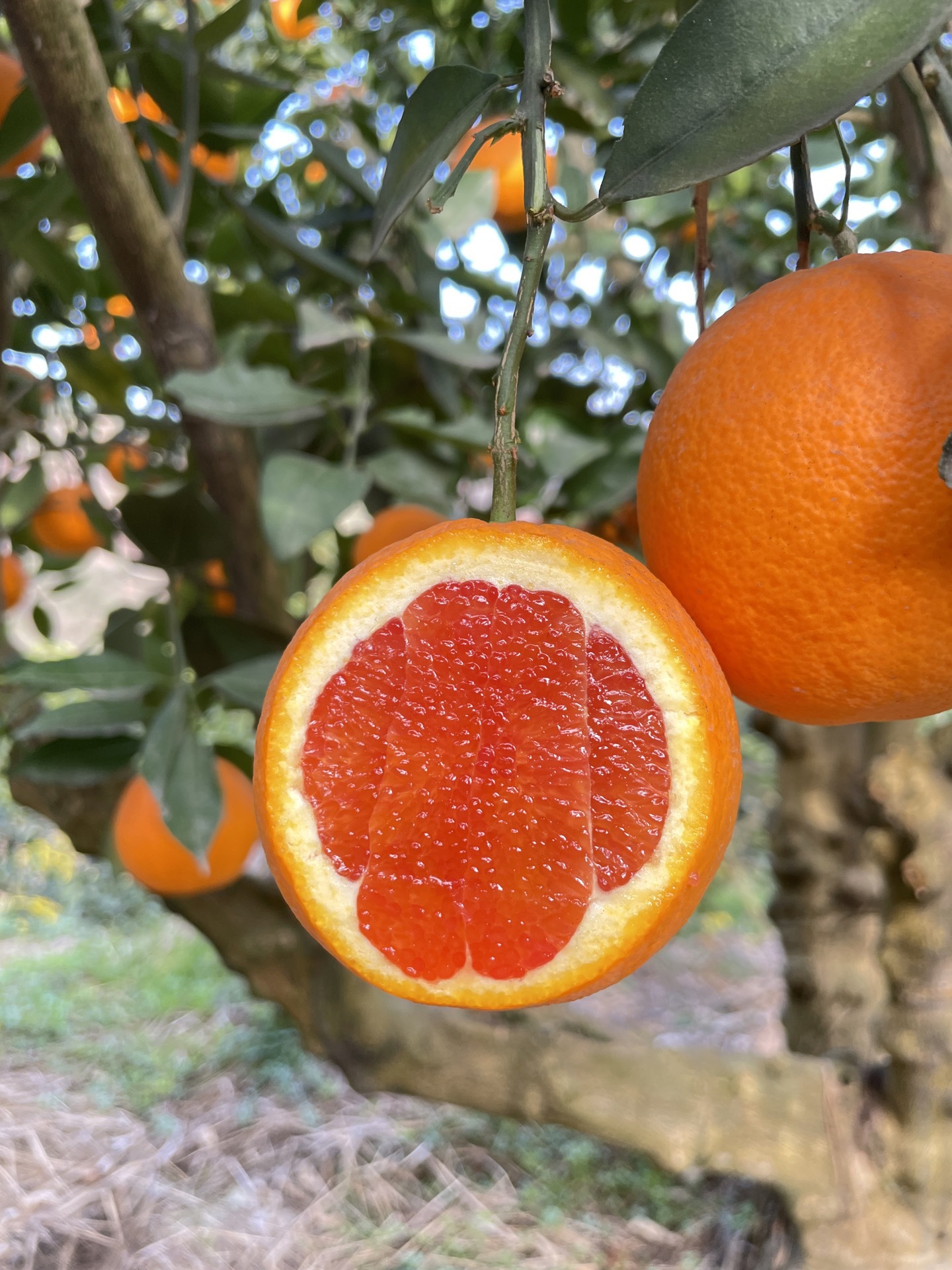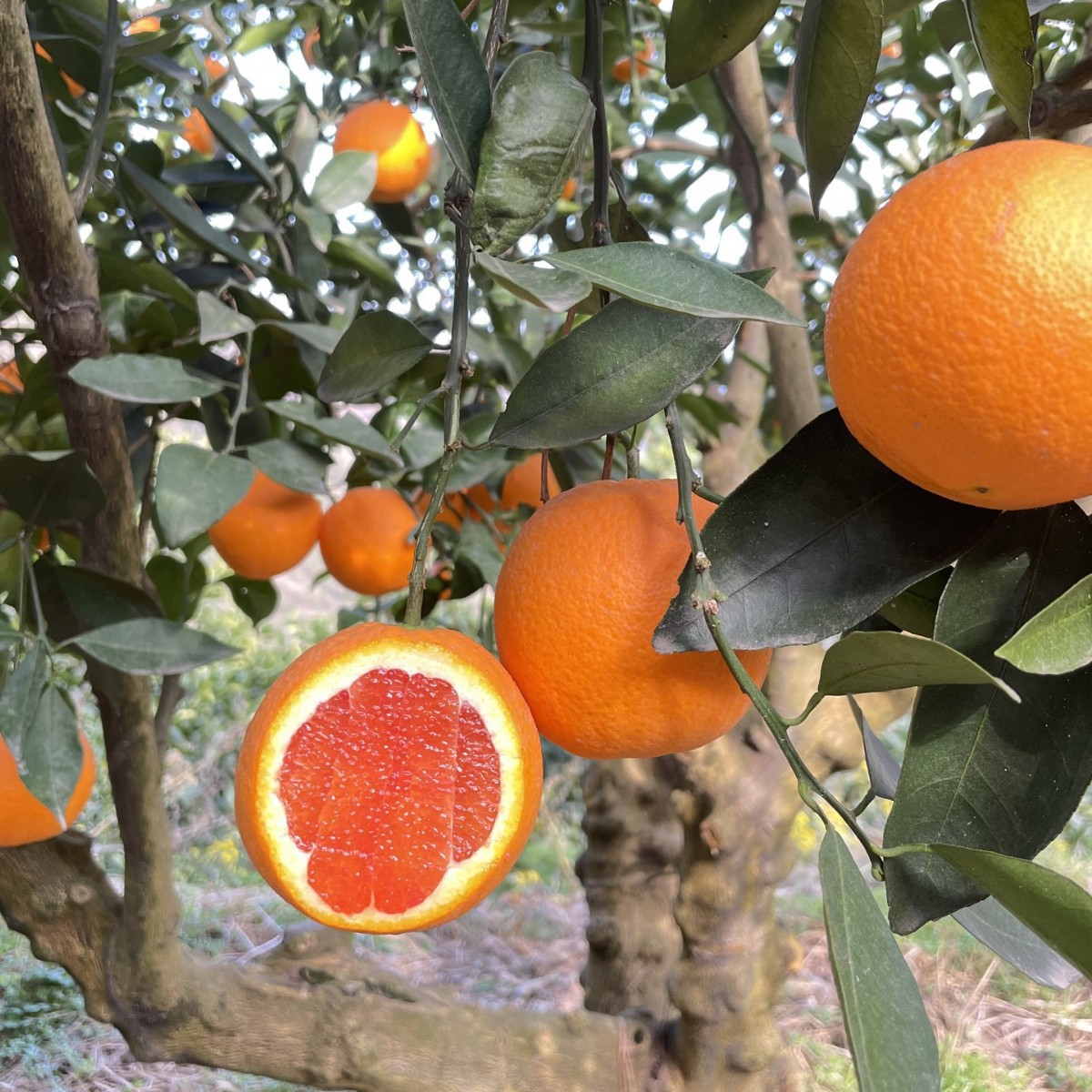 我们自家有2000棵橙子树,有夏橙,爱媛,九月红,长红,园红,血橙,伦晚这些橙子品种。