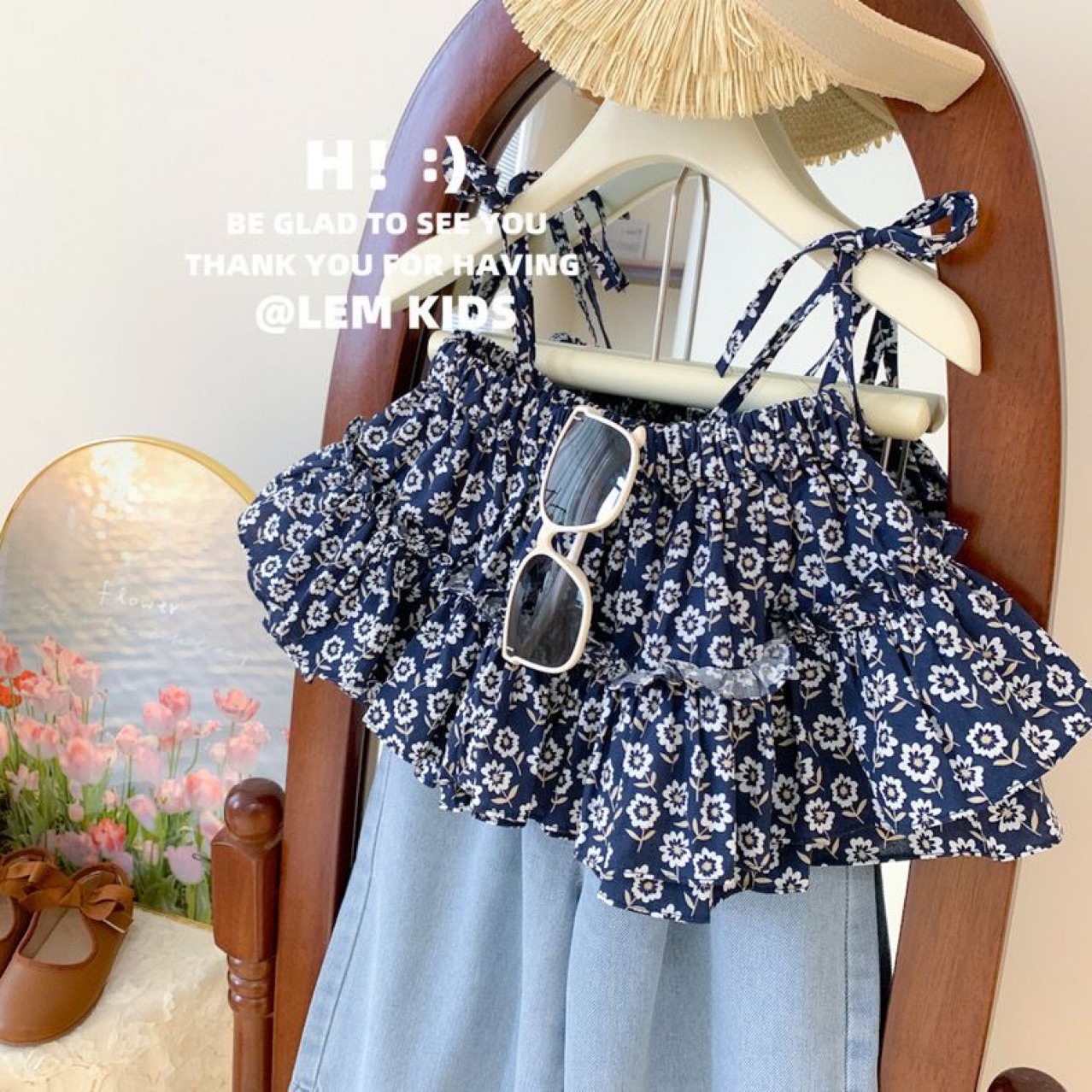 Подтяжки с цветочным принтом + джинсовые укороченные брюки; Одинарная подтяжка с цветочным принтом; джинсовые укороченные брюки