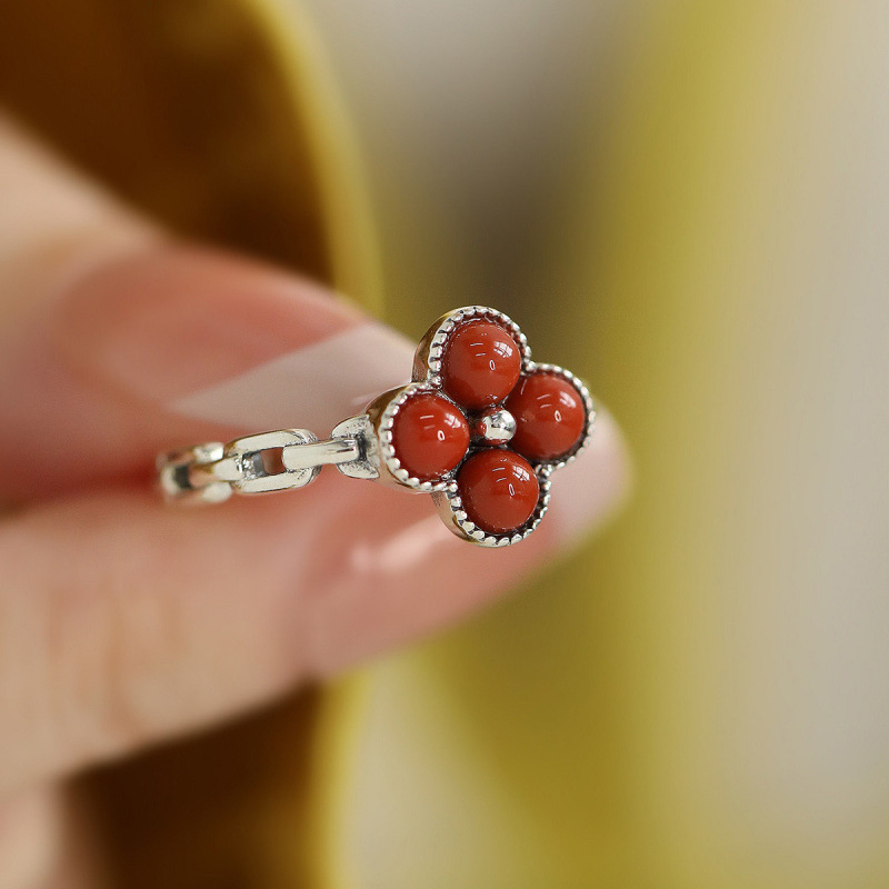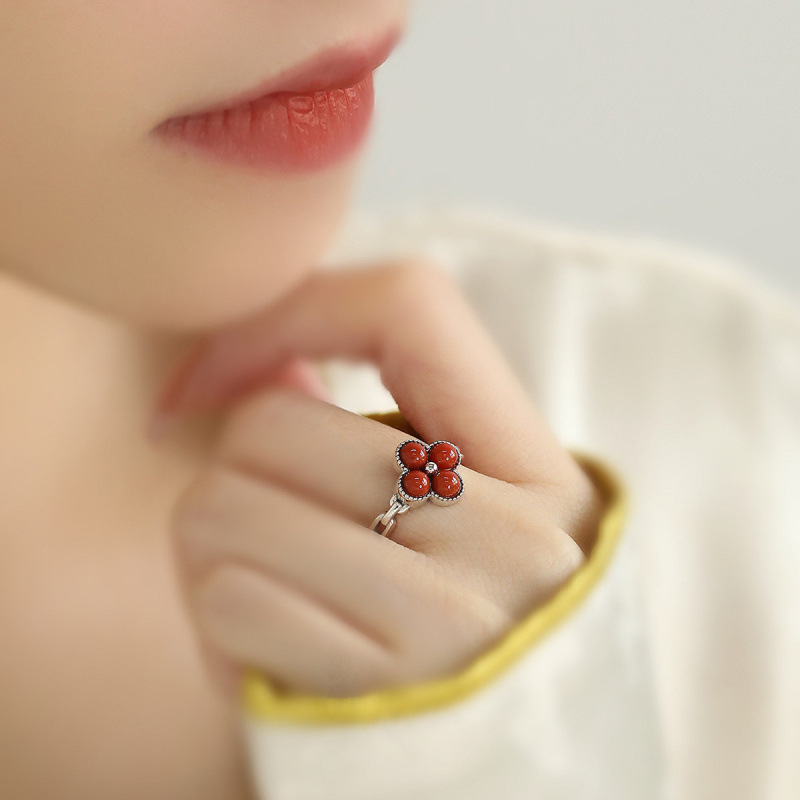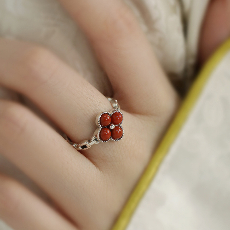 925 Серебряный Клевер Южный Красный Агат Кольцо Женский 2024 Регулируемое кольцо указательный палец высокого класса украшения