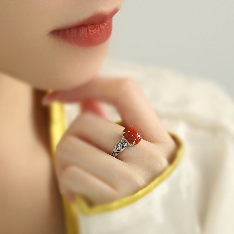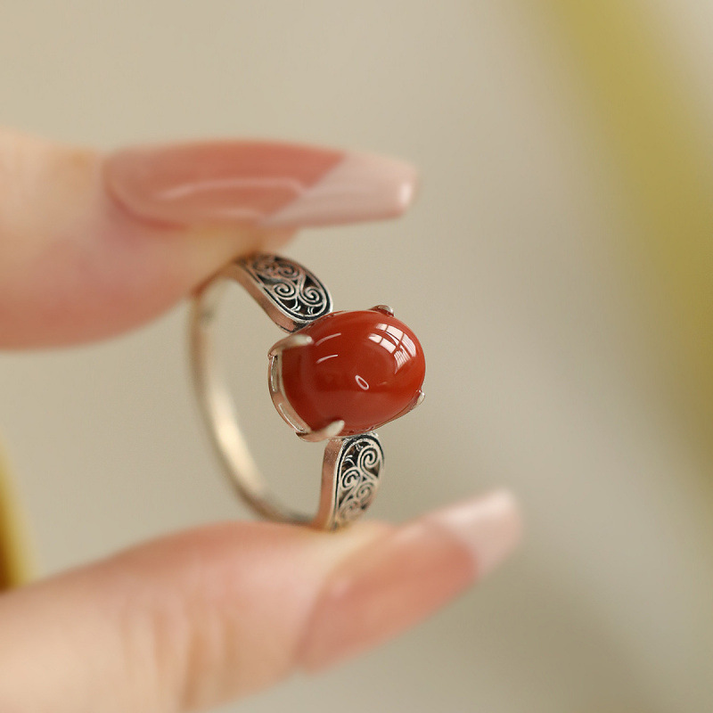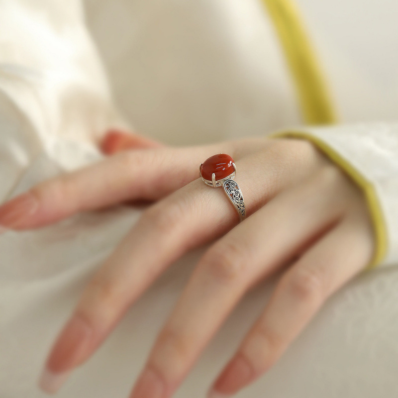 925 Серебряный Тан Трава Дан Форма Южный Красный Агат Кольцо Национальный Ветер Новый Китайский Регулируемый Кольцо