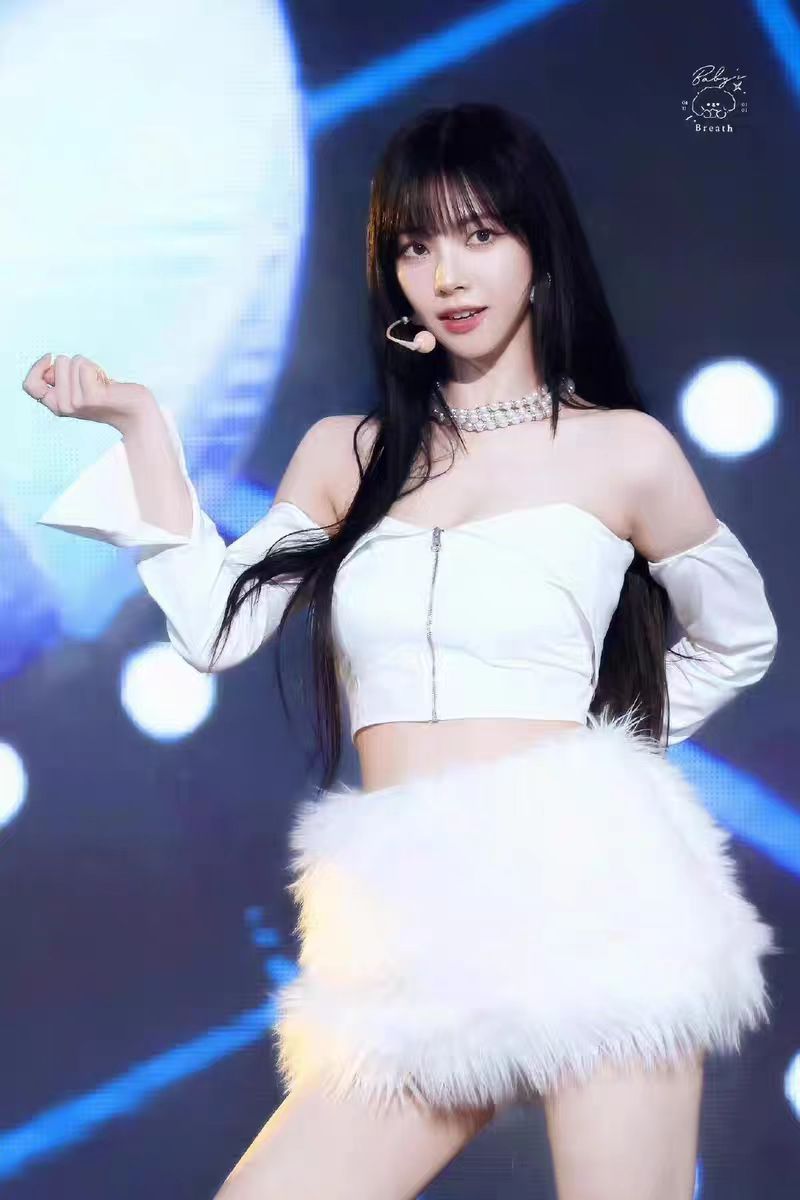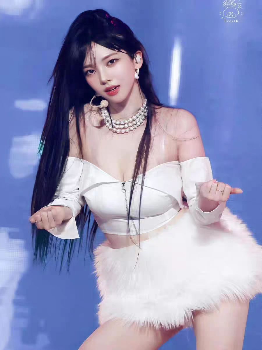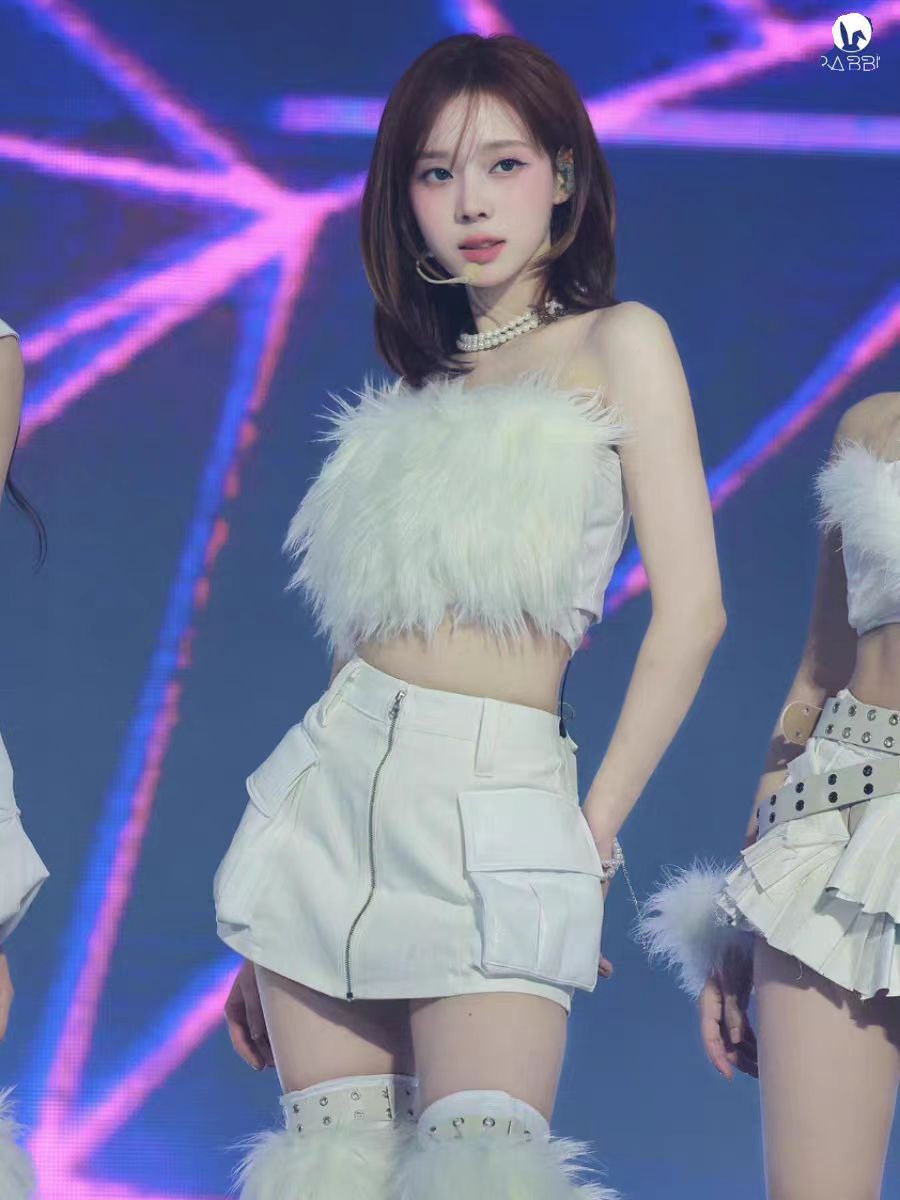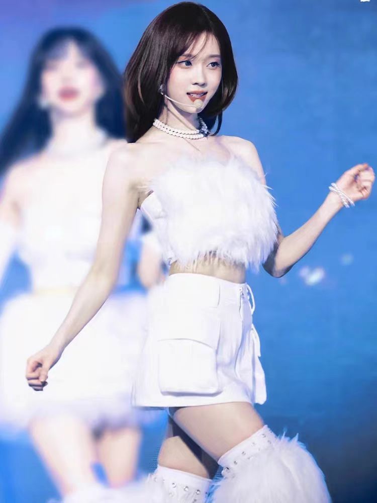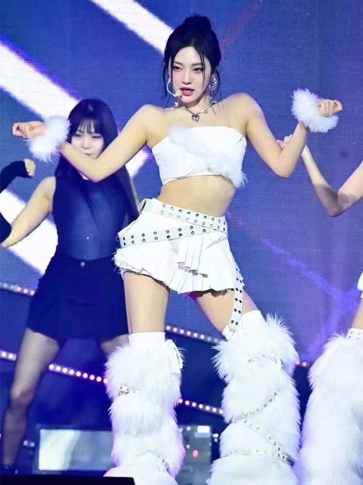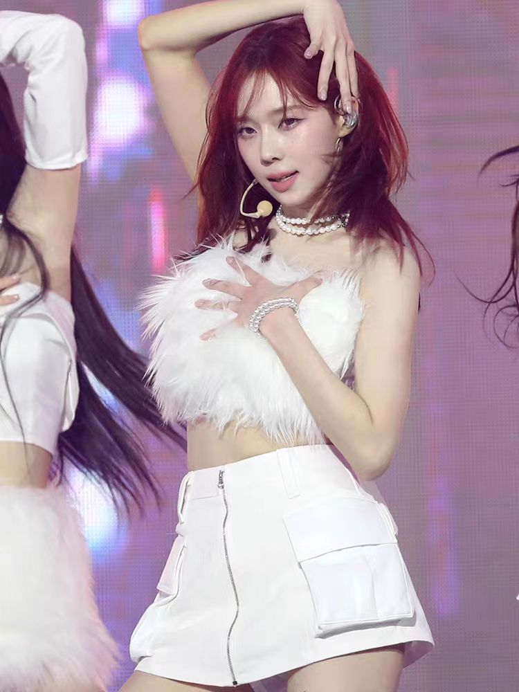 Сценический наряд для женской группы, сценический наряд в стиле Ли Джи-мин, корейский танцевальный белый меховой наряд для женщин с открытым плечом.