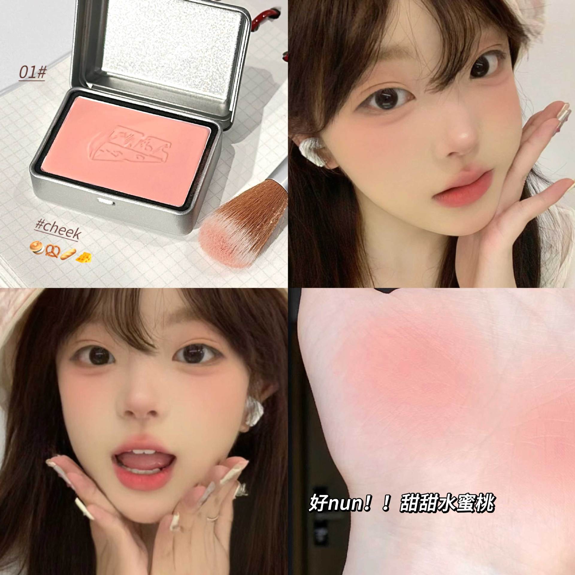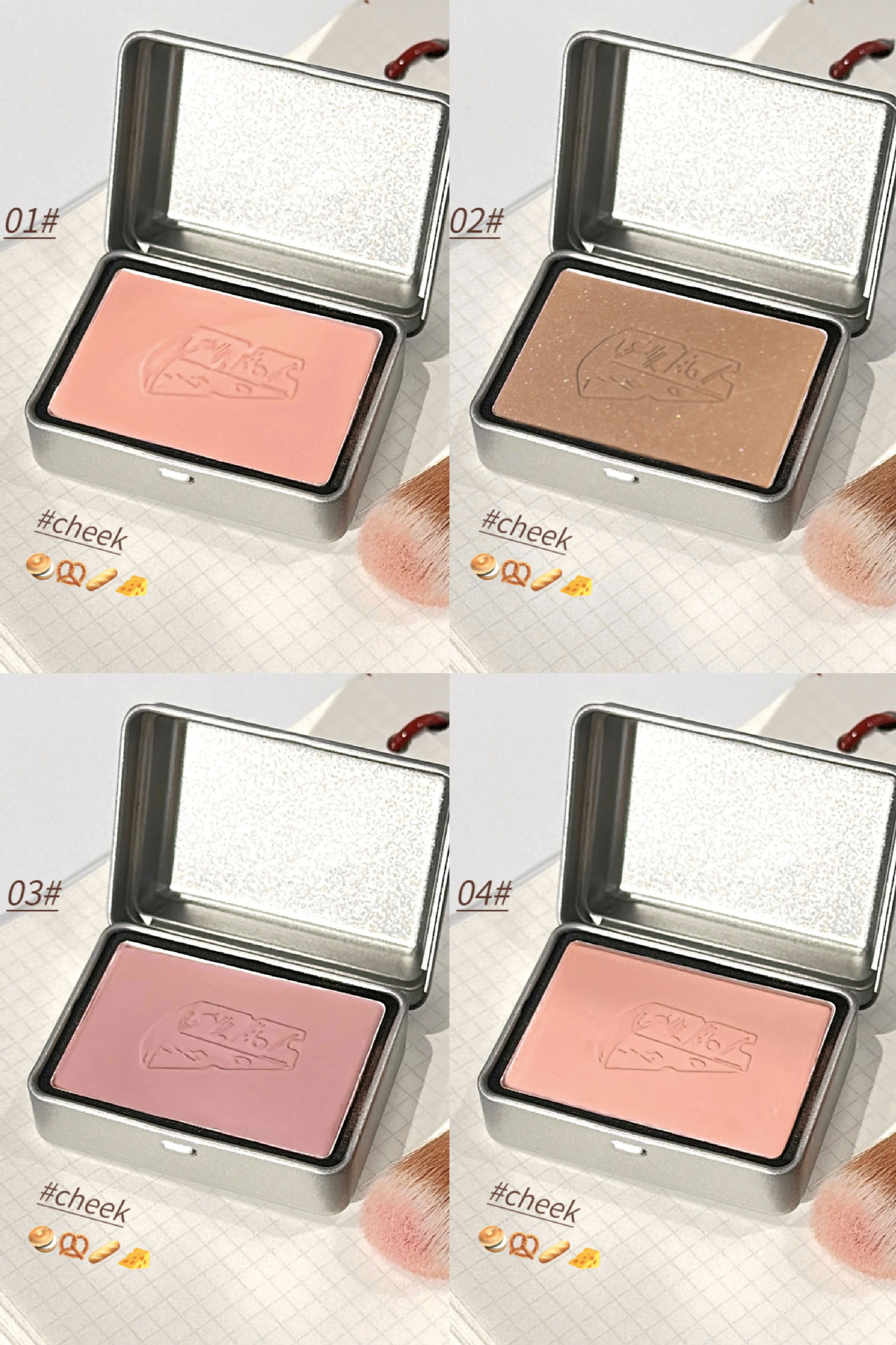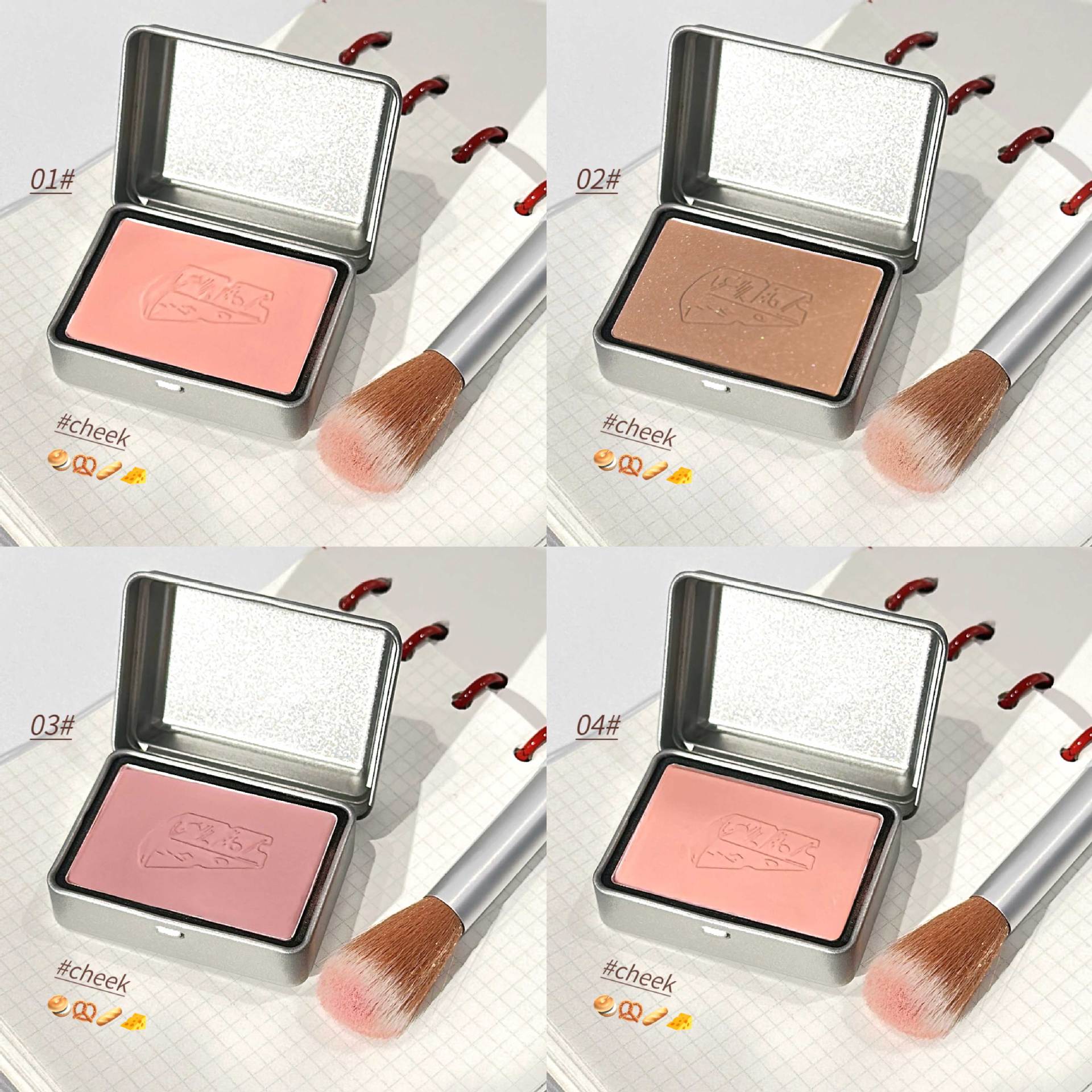 01#Персиковый порошок Swell; 02#Благосостояние и коричневый цвет корицы; 03#Благосостояние и холодные розы; 04#Ежедневный цвет Mommy; 01#Пудра Peach Swirl (включает мини-кисть); 02#Низкий уровень дохода и коричнево-коричневый цвет (в комплекте идет небольшая белая кисть); 03#Welfare и Cold Rose (в комплект входит бесплатная кисть для начинающих); 04#Ежедневный натуральный тон (включает кисть для начинающих)