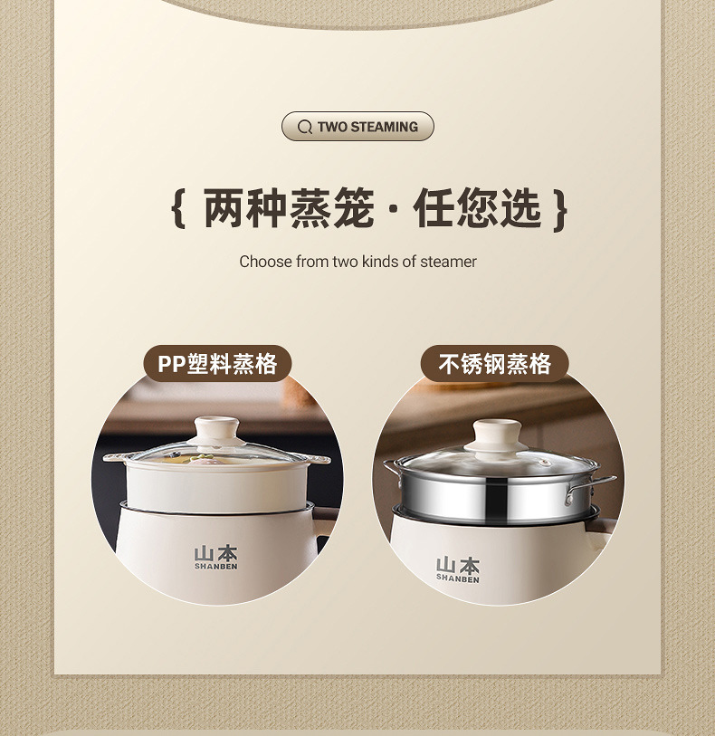 Одинарная кастрюля объемом 2,0 л [внутренняя кастрюля с антипригарным покрытием], 1.5m провода; Одинарная кастрюля объемом 2,0 л + пароварка из полипропилена [внутренняя кастрюля с антипригарным покрытием] 1.5m провода; Одинарная кастрюля объемом 2,0 л + пароварка из нержавеющей стали [внутренняя кастрюля с антипригарным покрытием] 1.5m провода