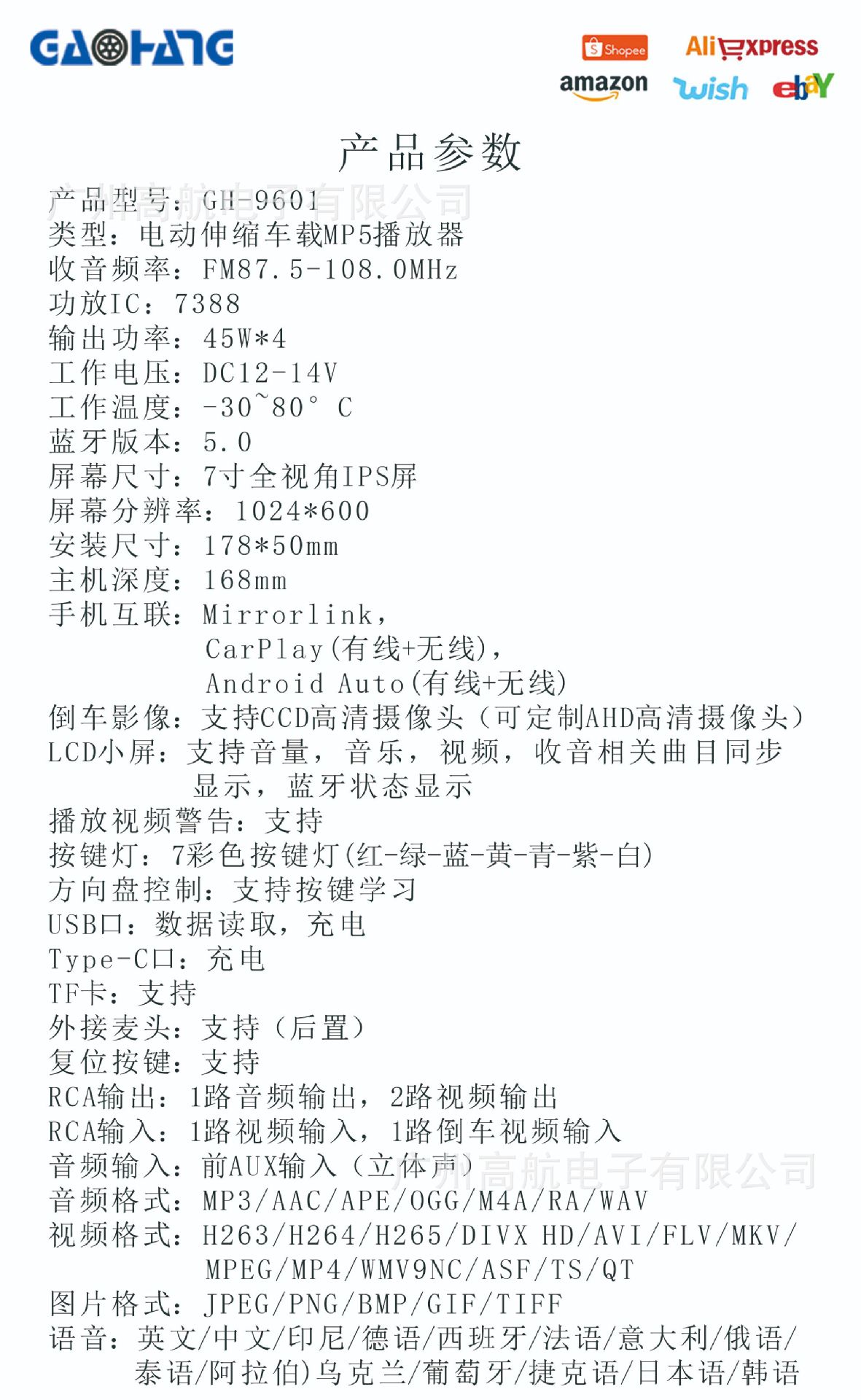 7-дюймовый Carplay электрический телескопический универсальный автомобиль MP5 плеер MP3 карта радио аудио заднего хода приоритет