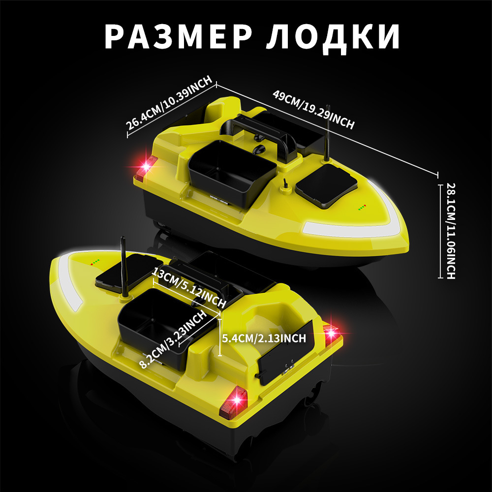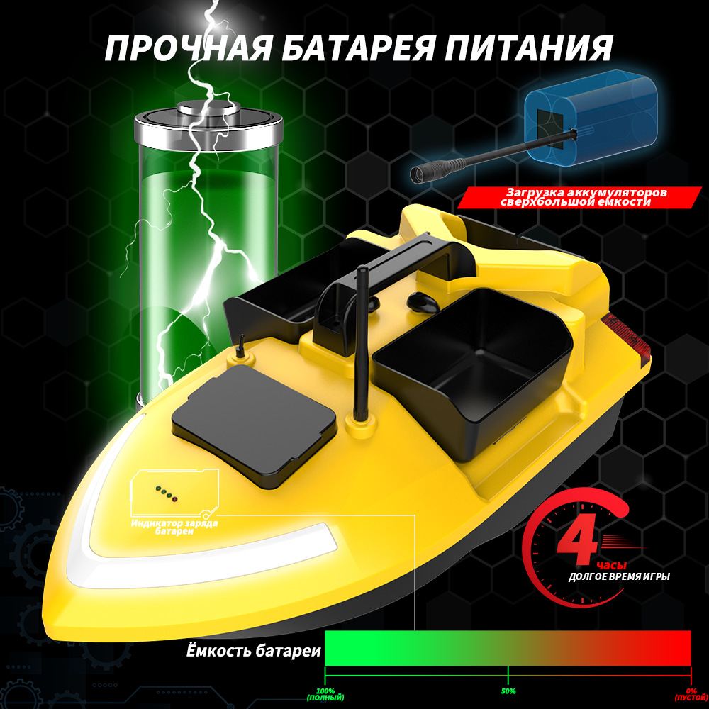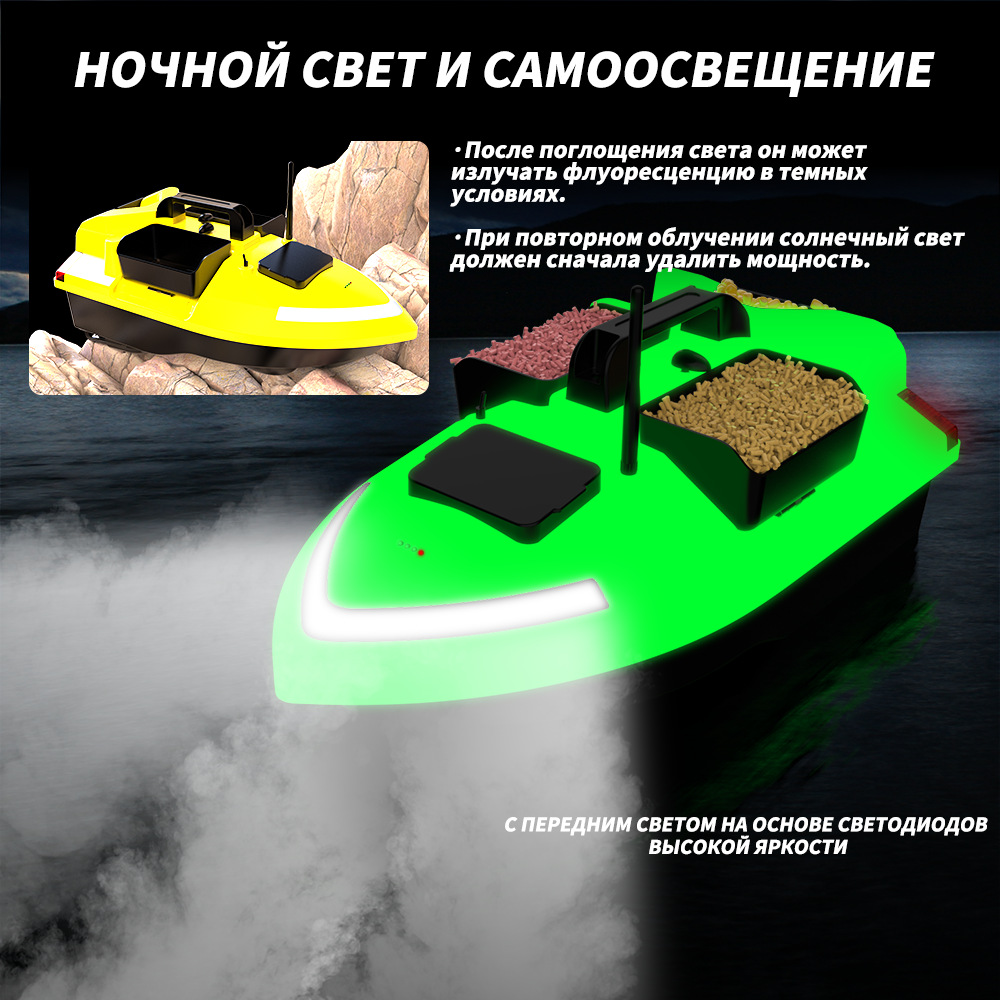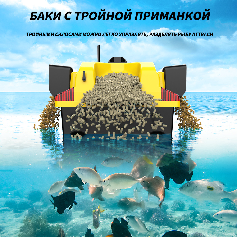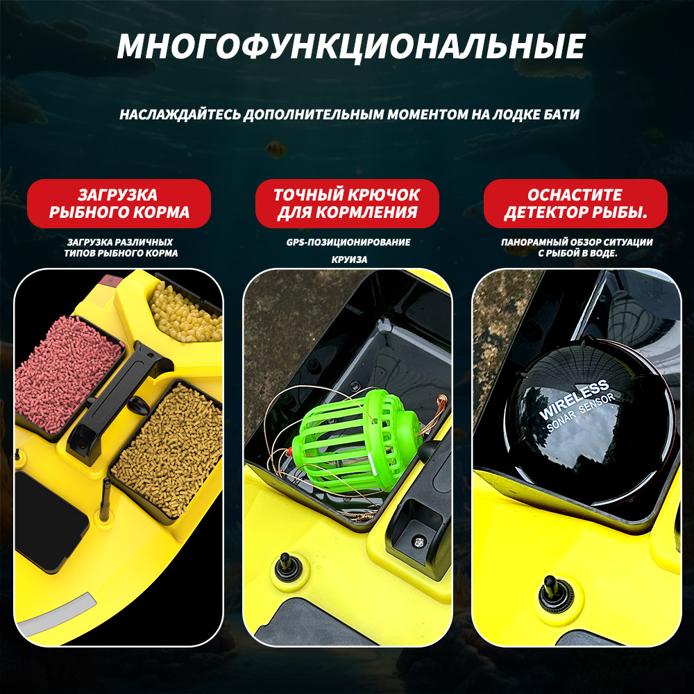 1. передний и задний ход, левый и правый поворот, огни для ночной рыбалки, 3-камерное гнездо, отправка крючков
