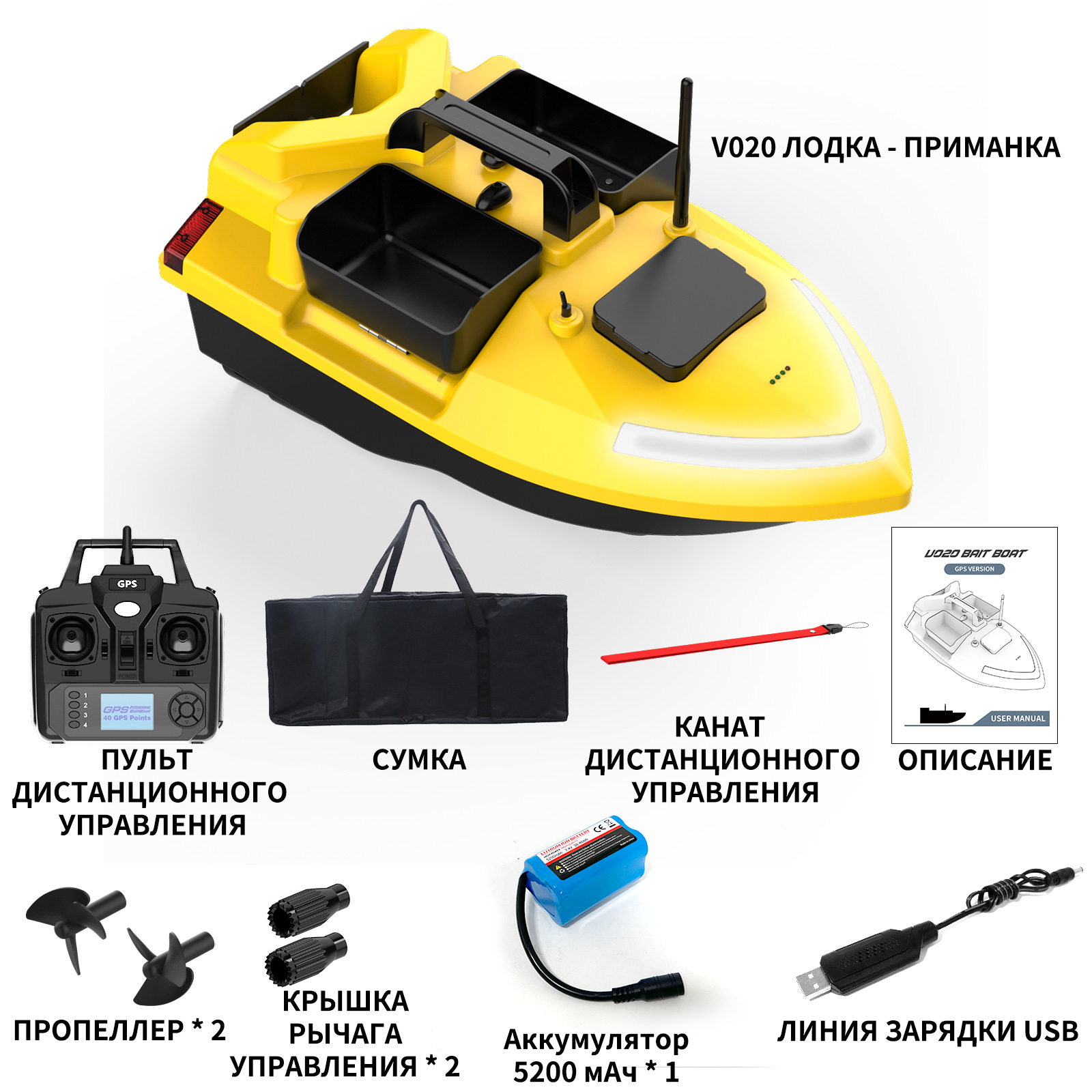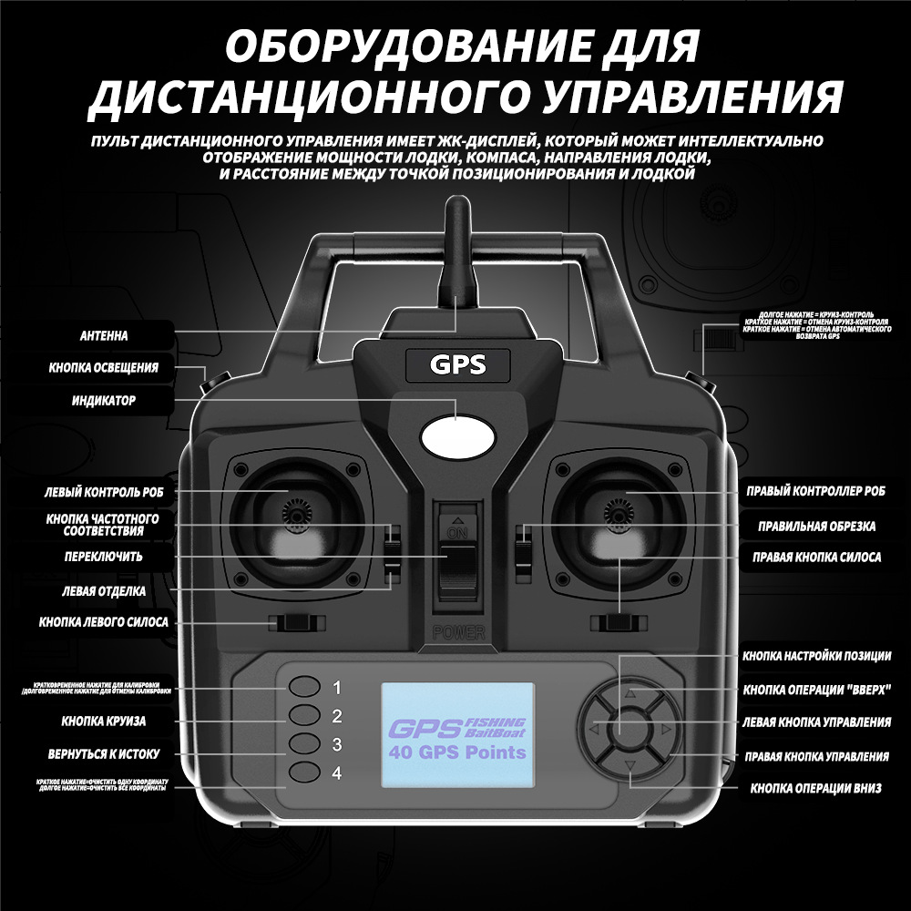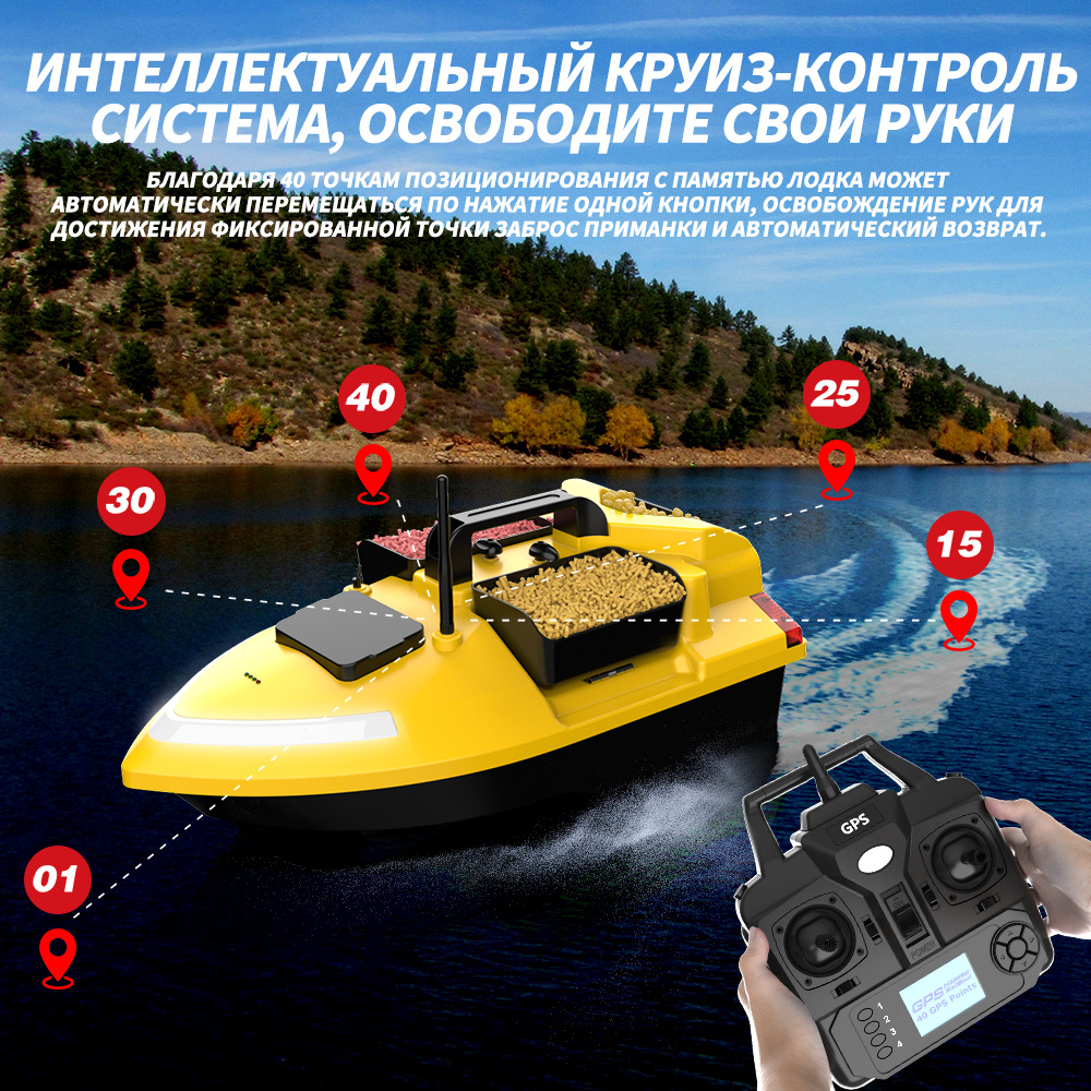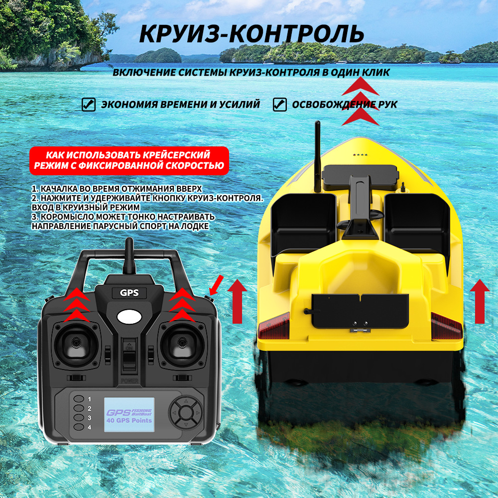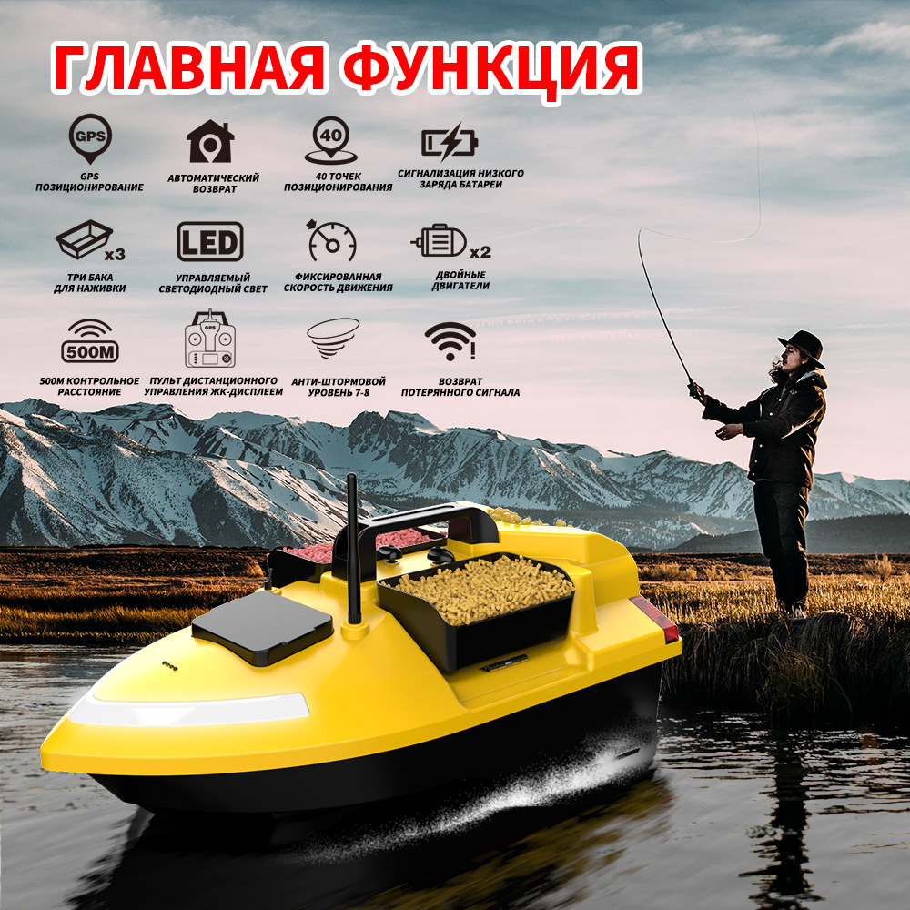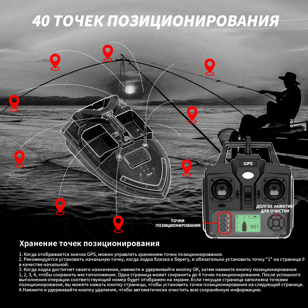 1. передний и задний ход, левый и правый поворот, огни для ночной рыбалки, 3-камерное гнездо, отправка крючков