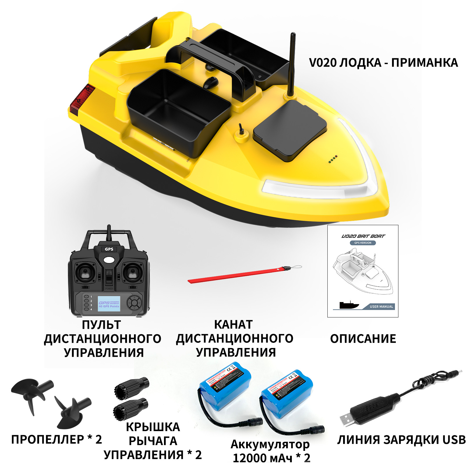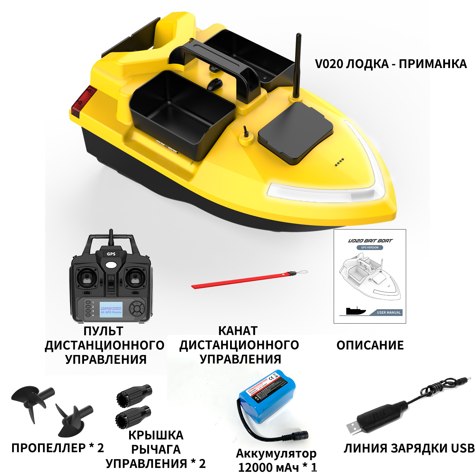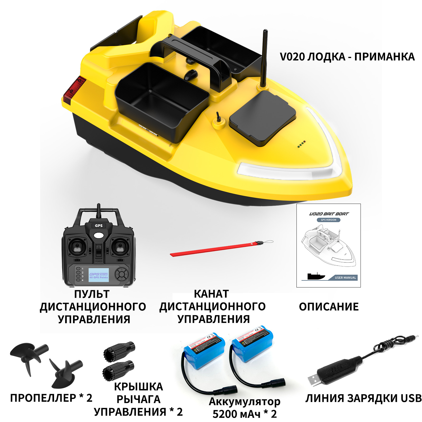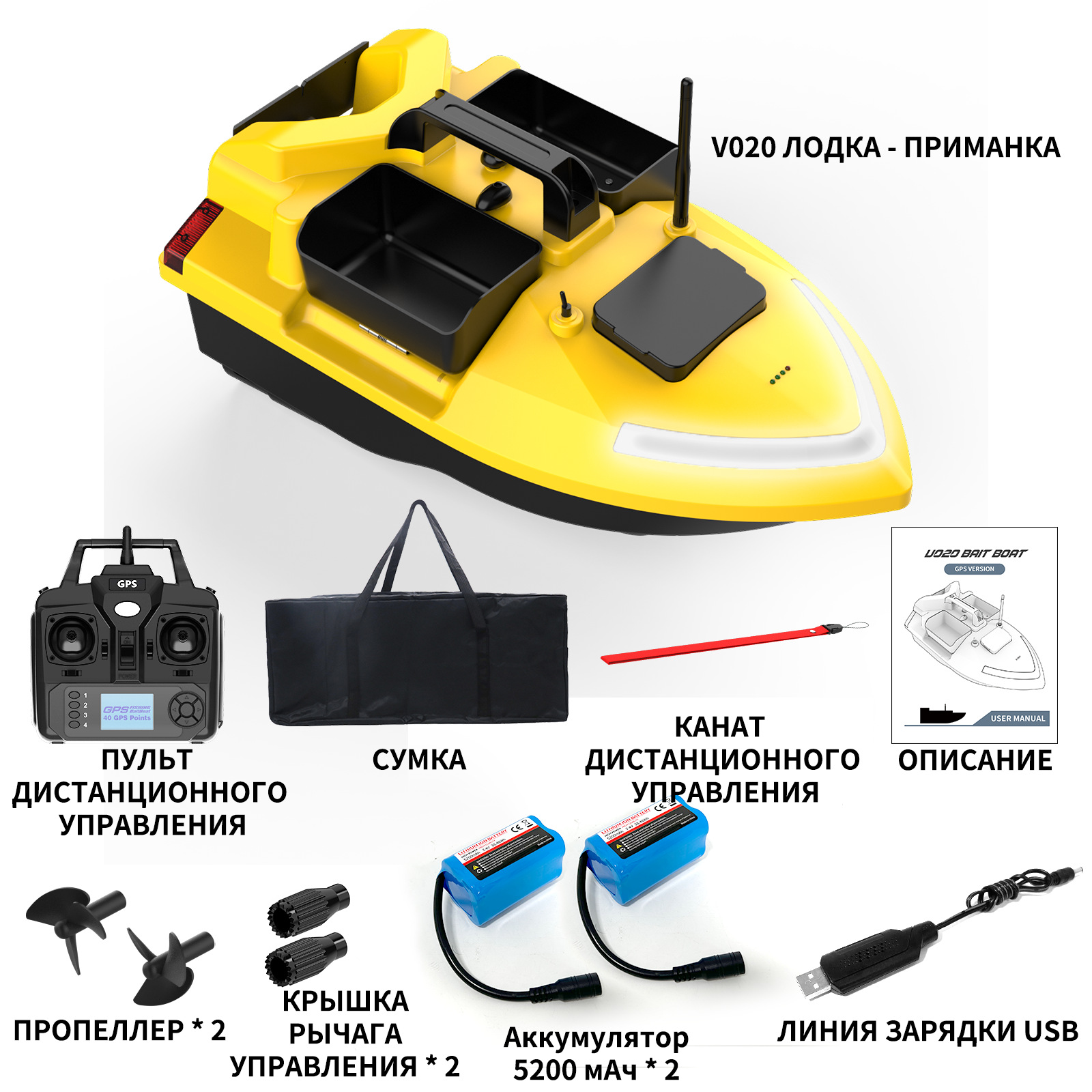 1. передний и задний ход, левый и правый поворот, огни для ночной рыбалки, 3-камерное гнездо, отправка крючков