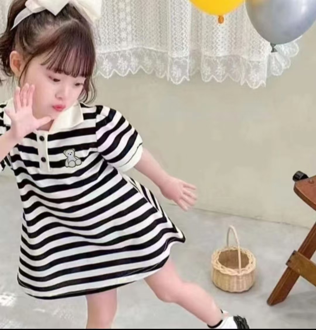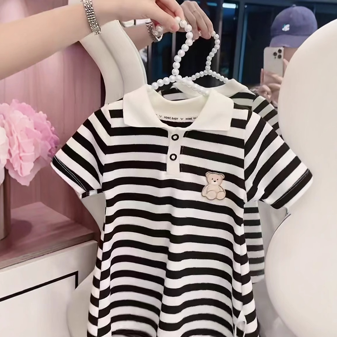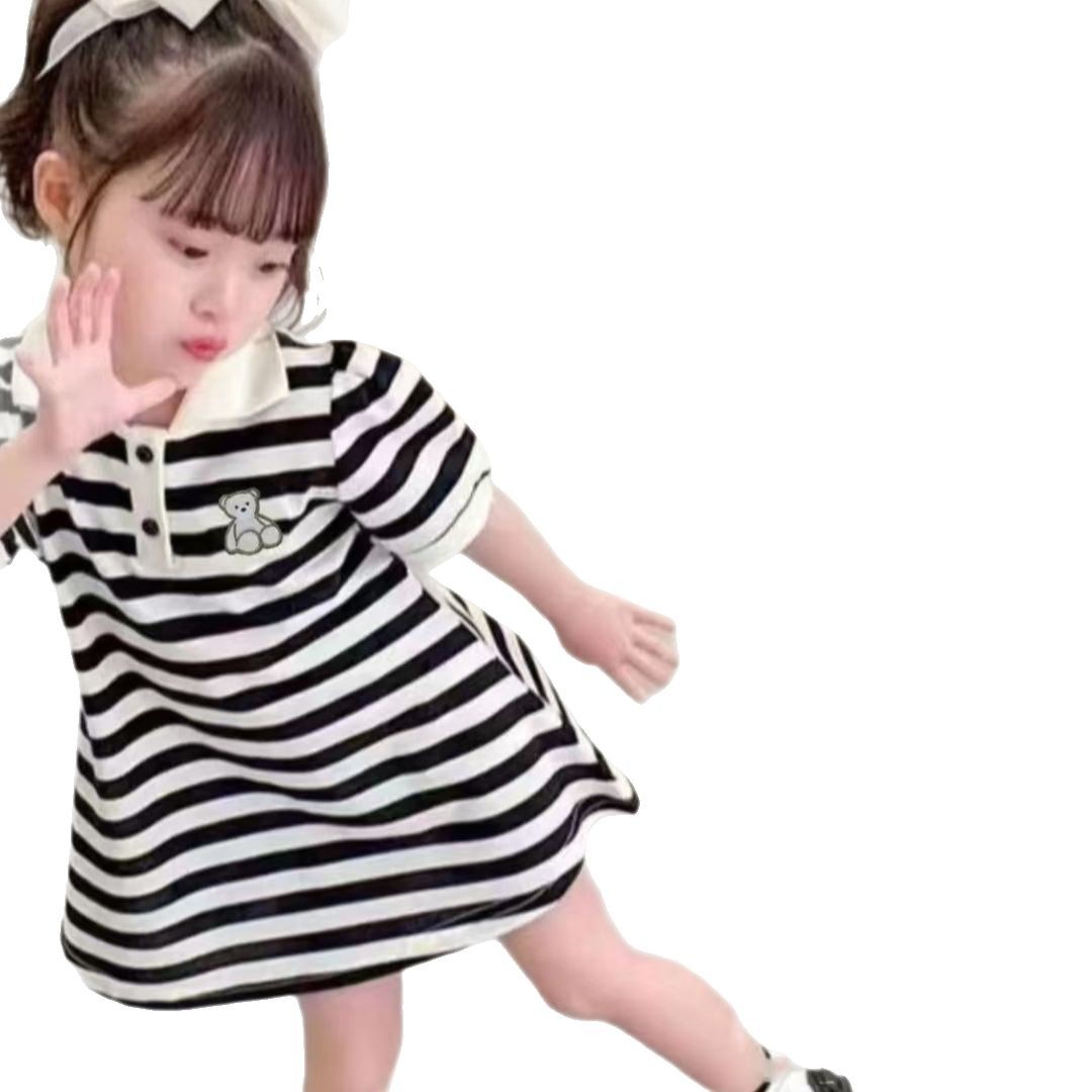 Для девочек Внешняя торговля 2025 юбок с короткими рукавами Летнее платье черно-белое полосатое платье с вышивкой средней длиной платье