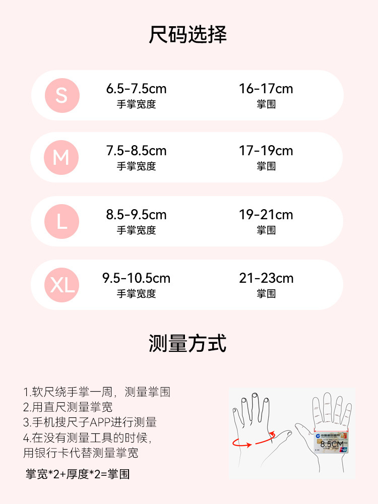 S [Рекомендуемая ширина ладони 6,5-7,5 см, окружность ладони 16-17 см]; M [рекомендуемая ширина ладони 7,5-8,5 см, окружность ладони 17-19 см]; L【Рекомендуемая ширина ладони 8,5-9,5 см, окружность ладони 19-21 см】; XL [рекомендуемая ширина ладони 9,5-10,5 см, окружность ладони 21-23 см]