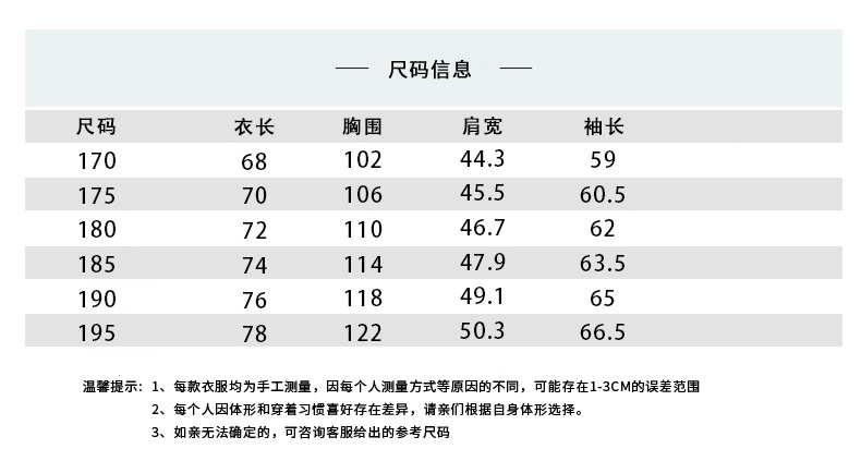 170/M; 175/L; 180/XL; 185/XXL; 190/3XL; 195/4XL