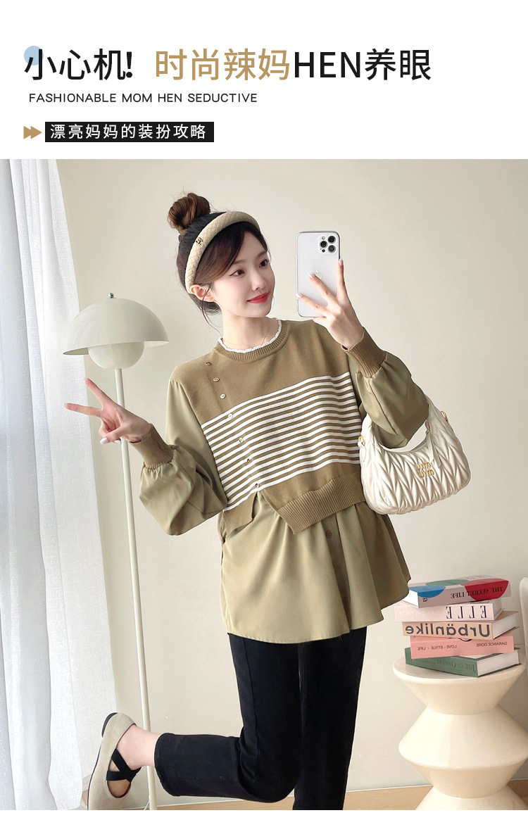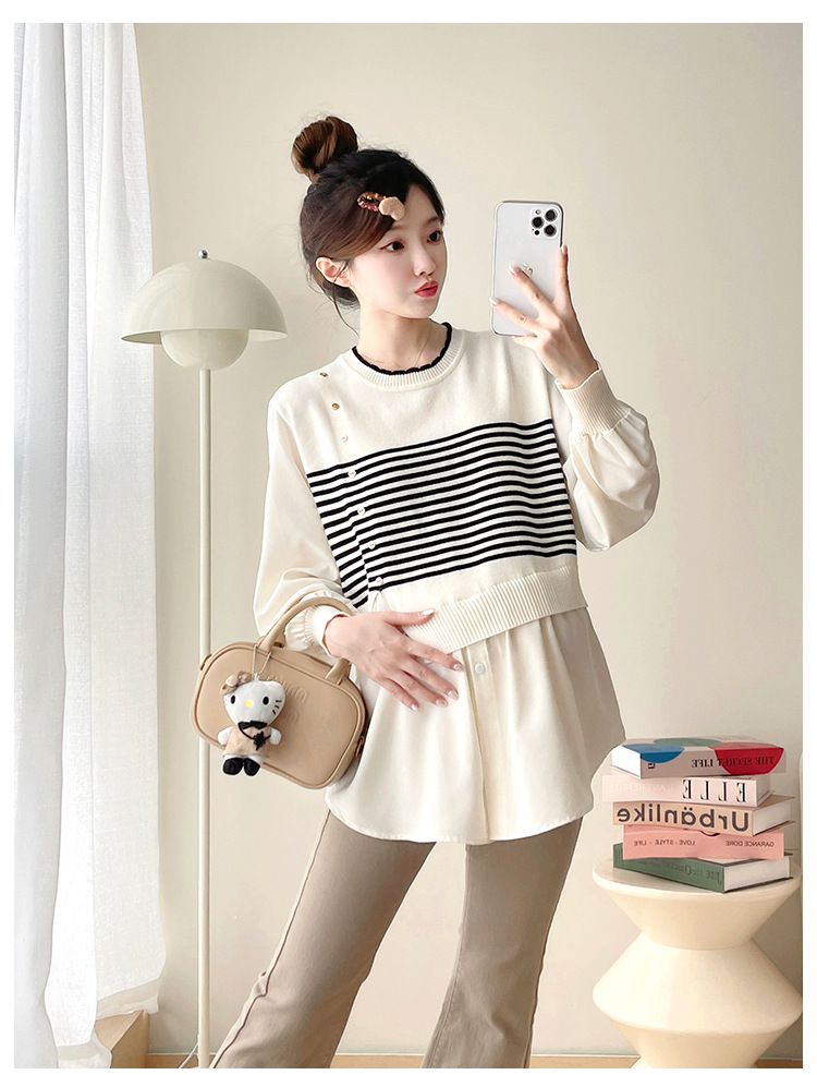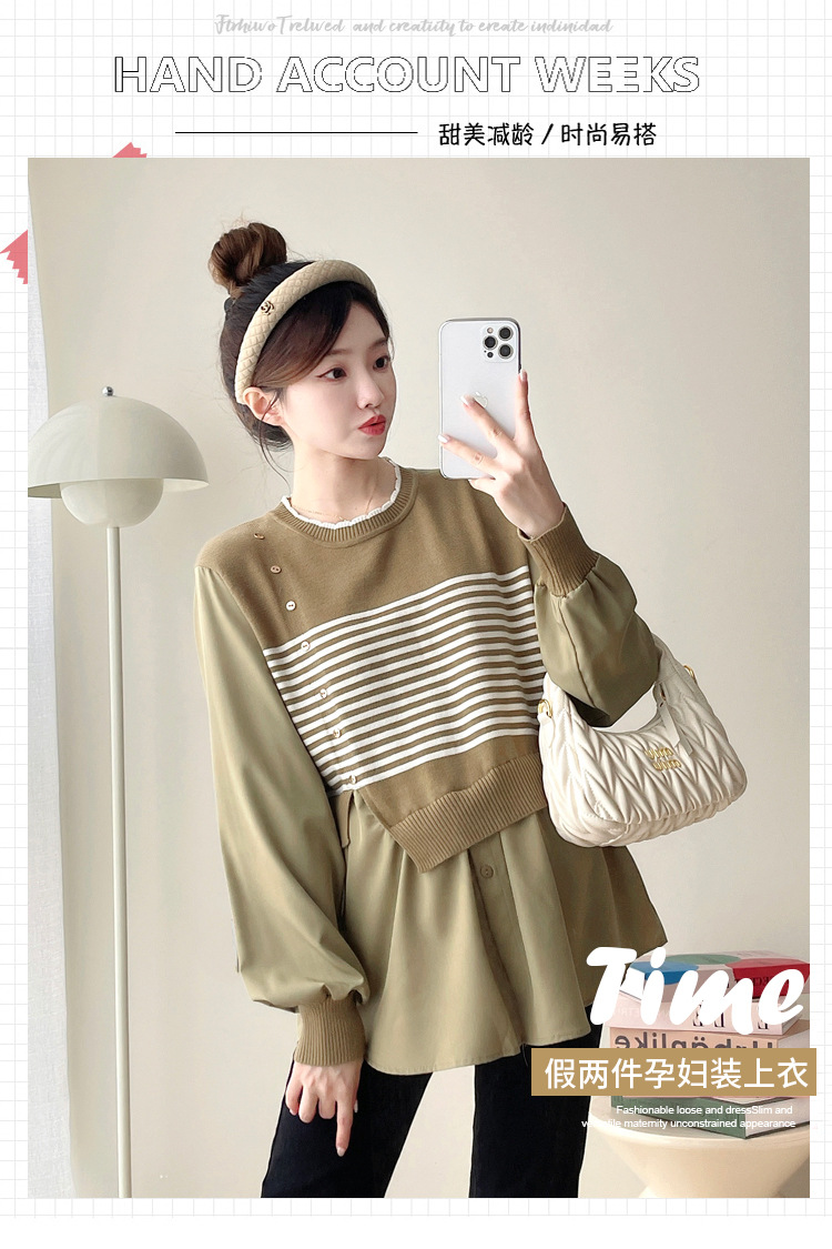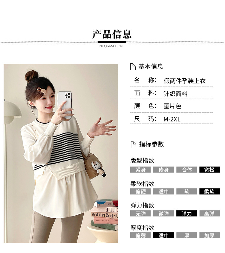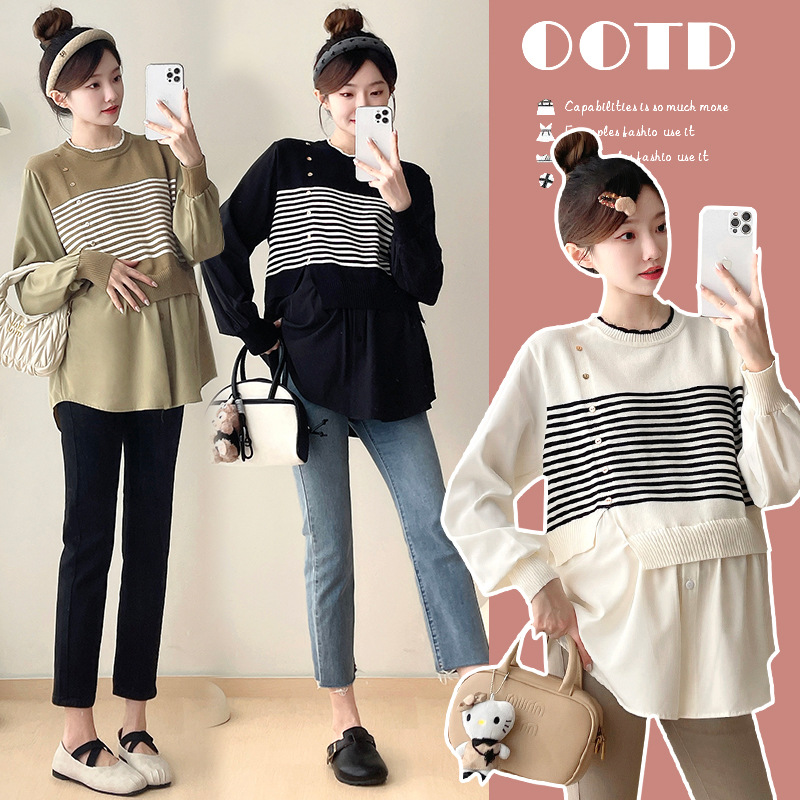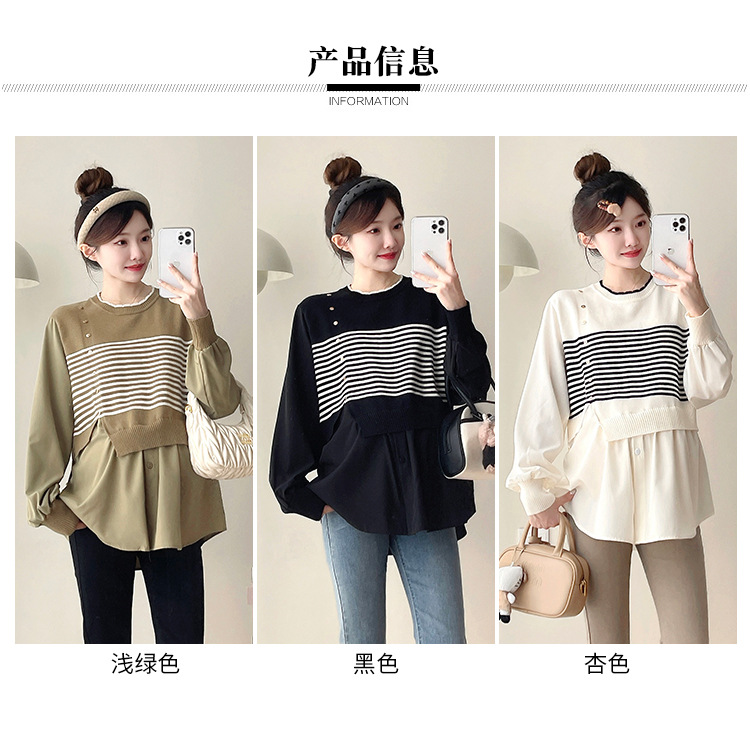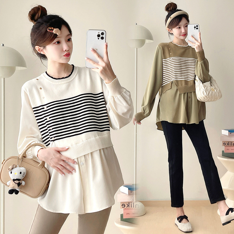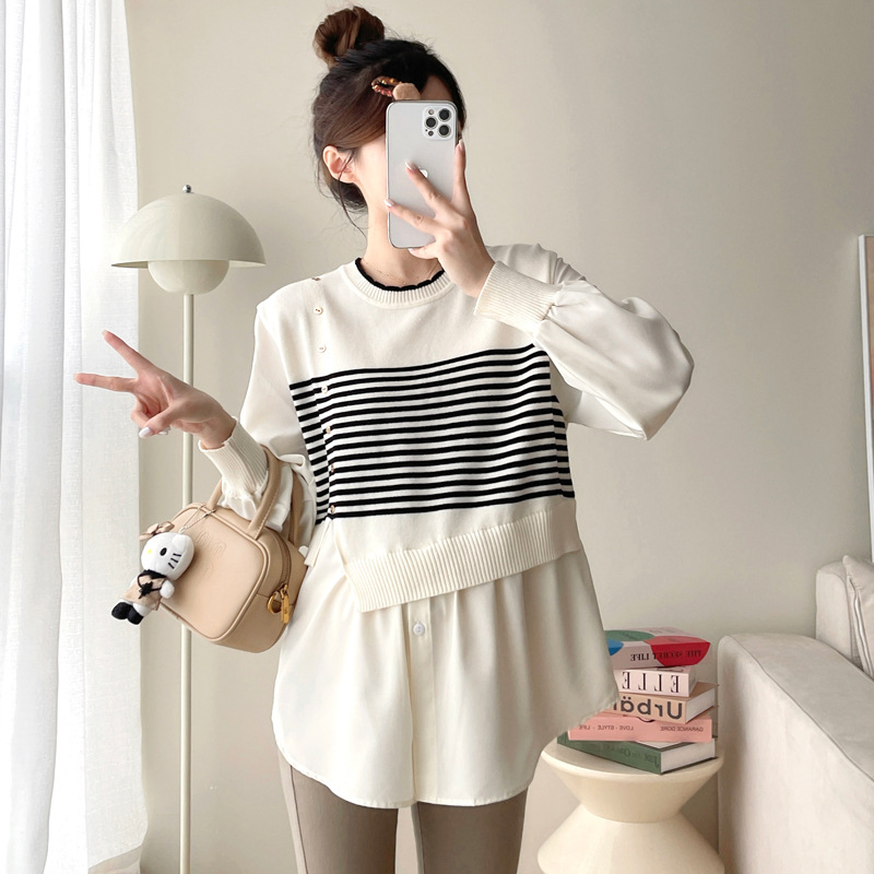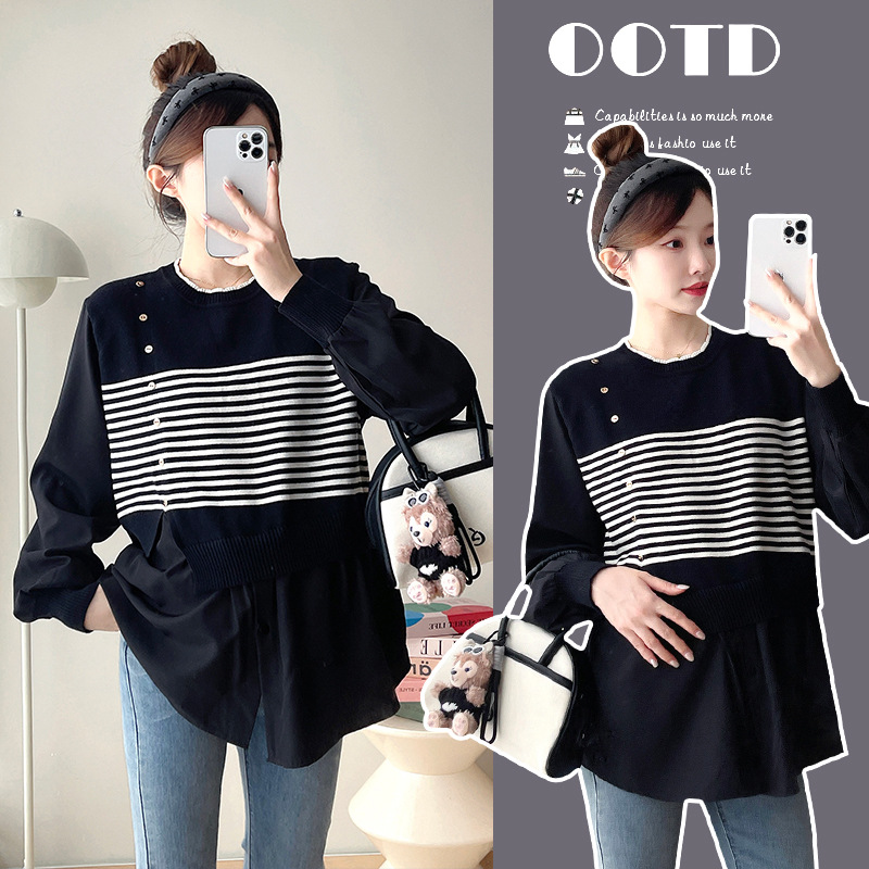 Реальный выстрел 2025 весна и осень новая полоска поддельные две трикотажные рубашки для беременных рубашки большого размера для беременных топ
