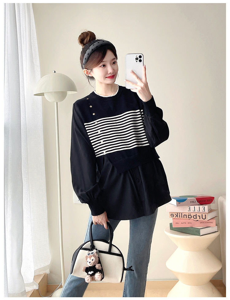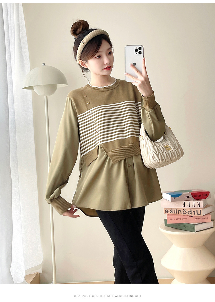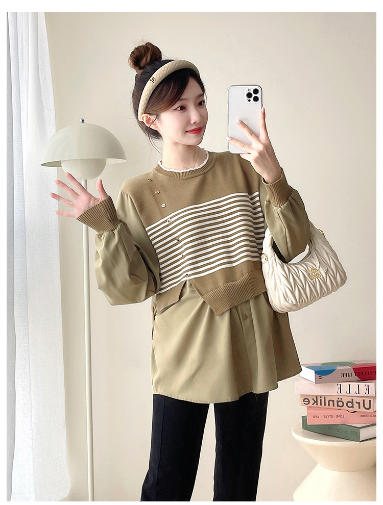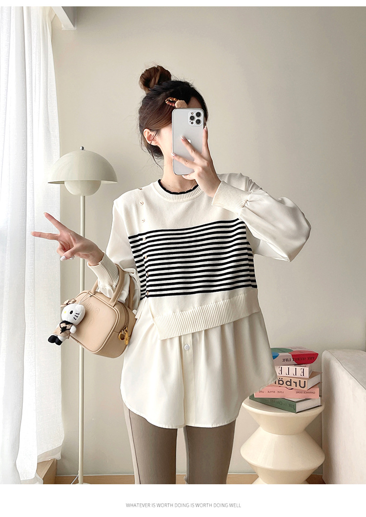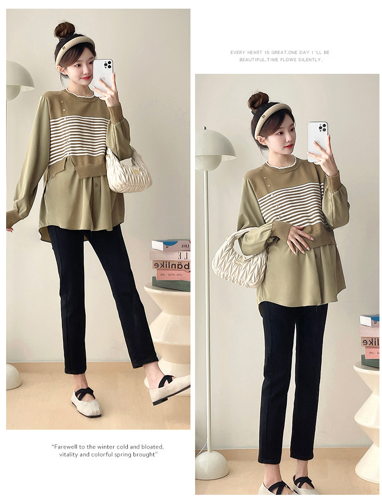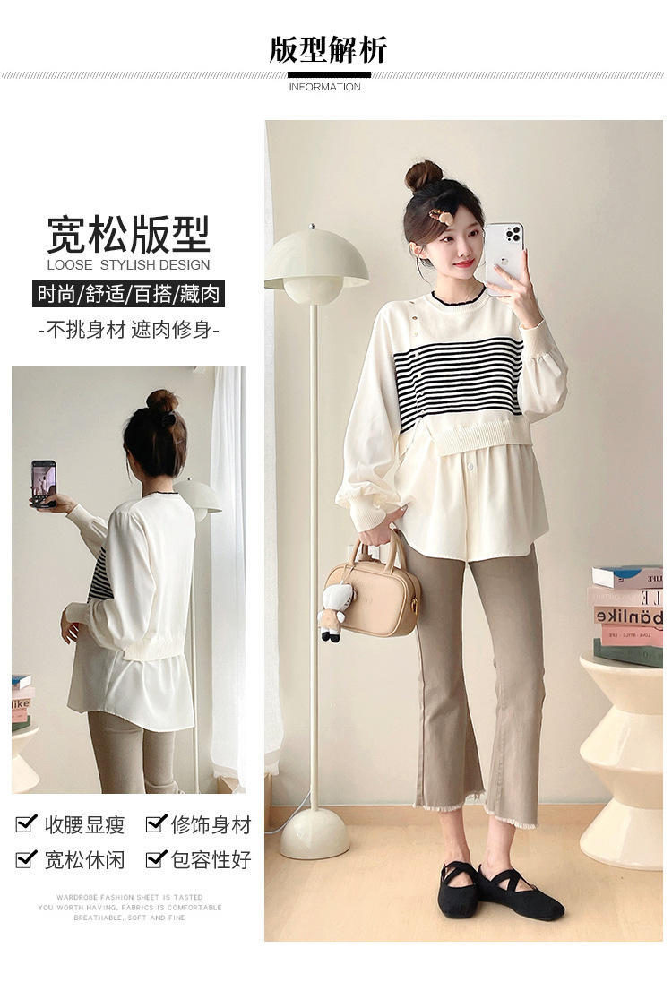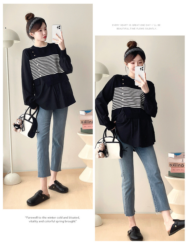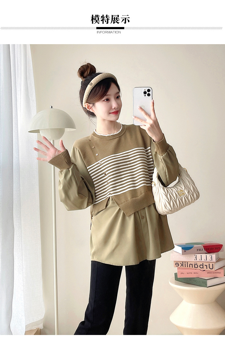 Реальный выстрел 2025 весна и осень новая полоска поддельные две трикотажные рубашки для беременных рубашки большого размера для беременных топ