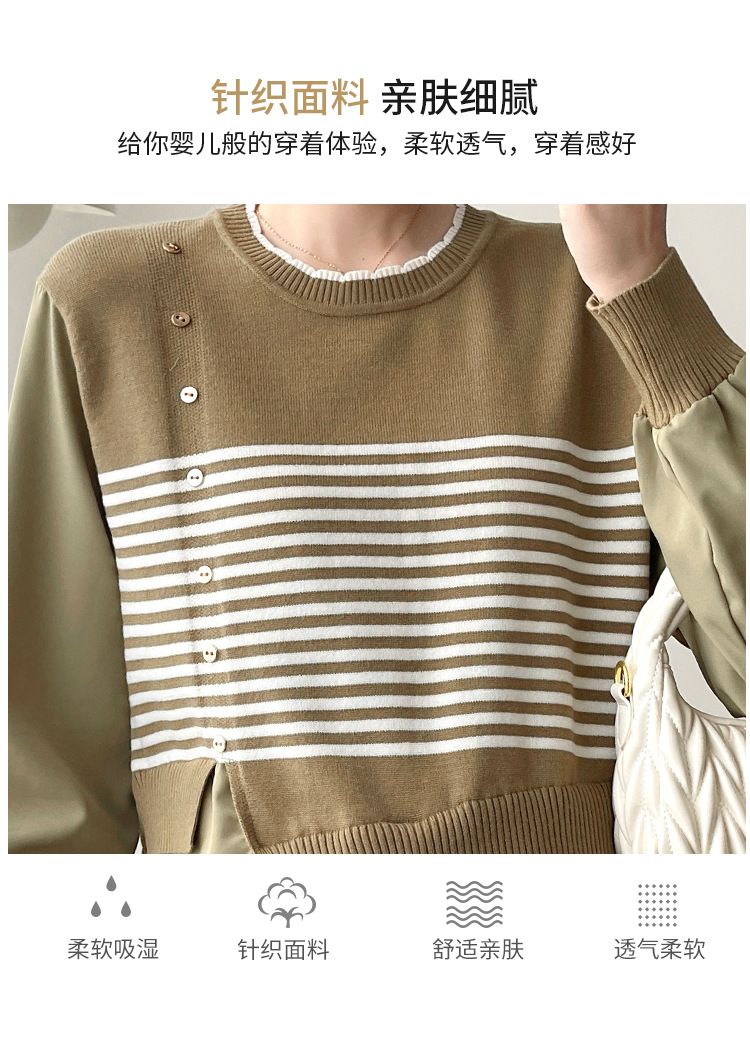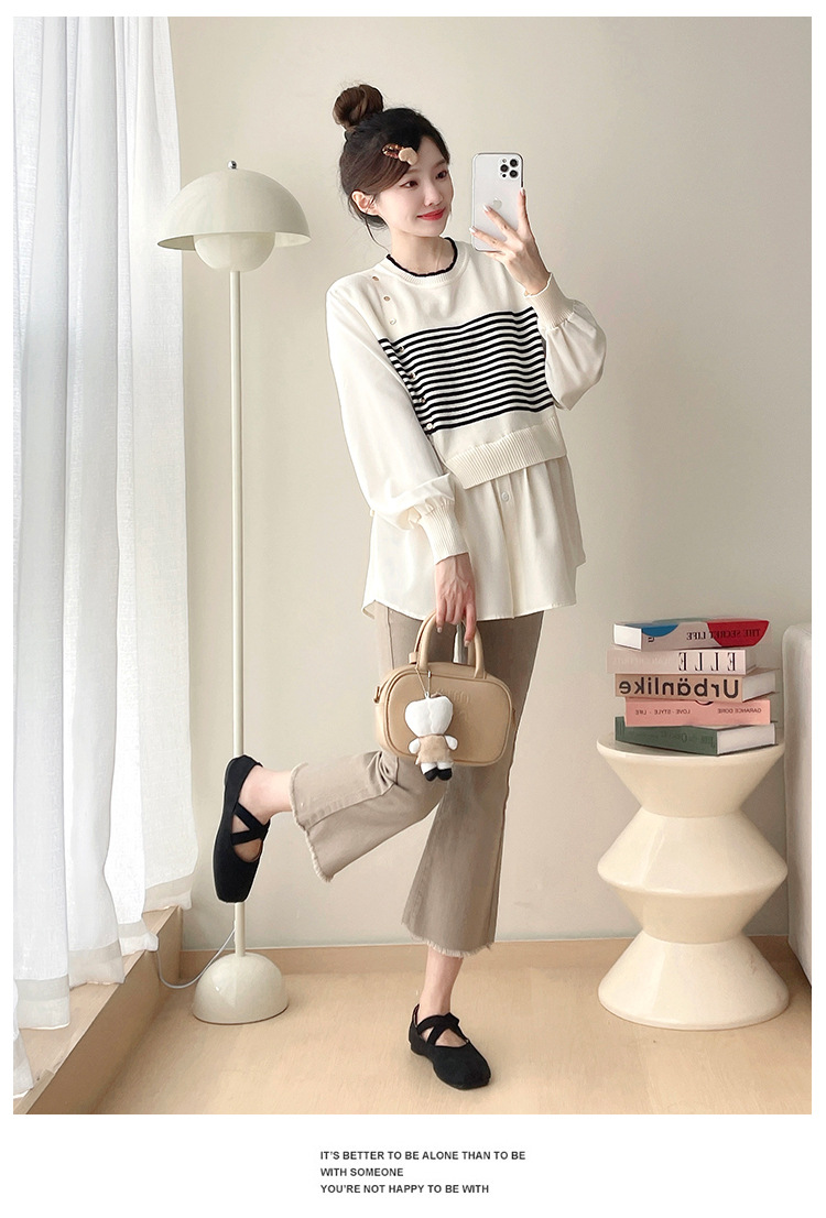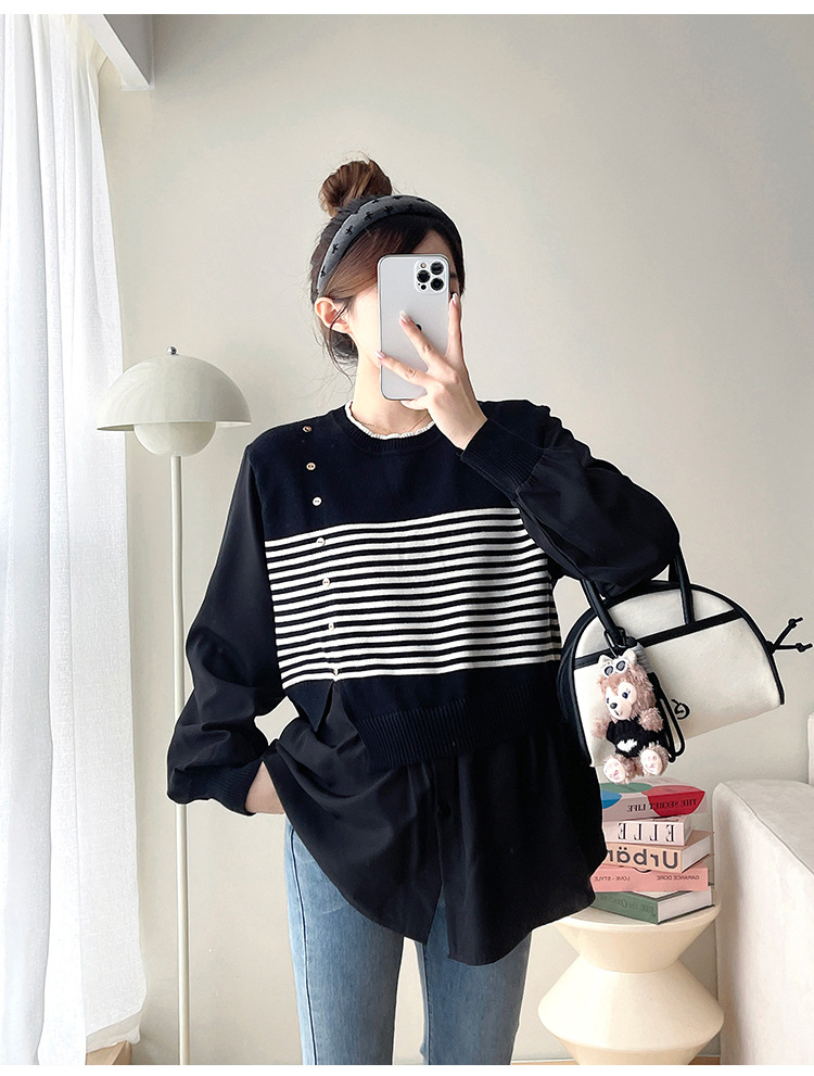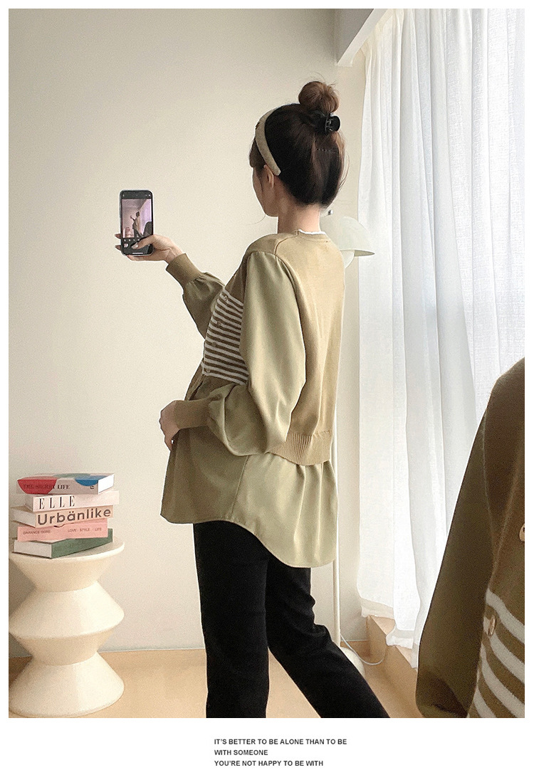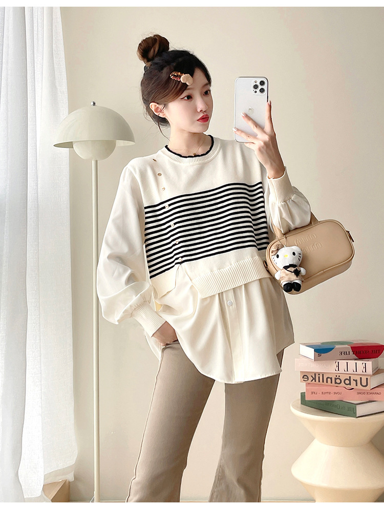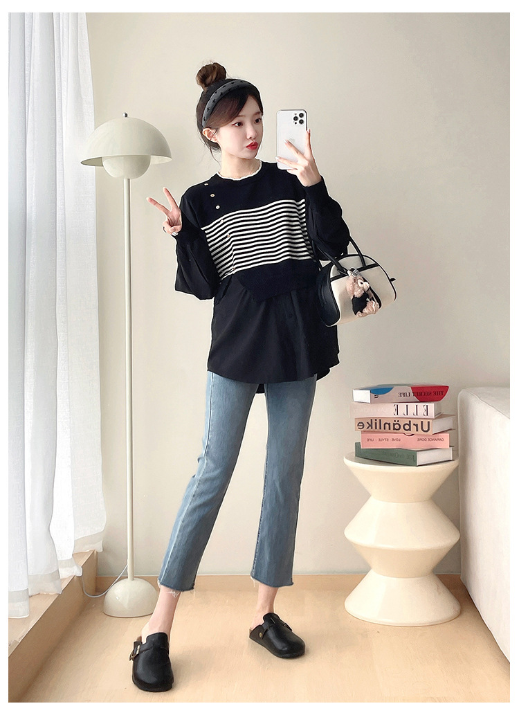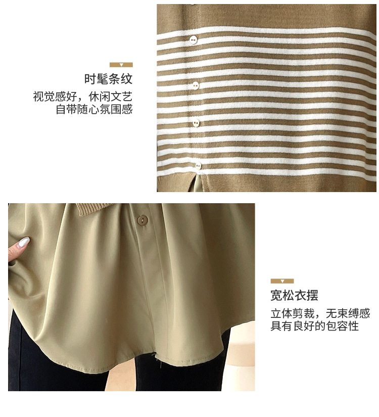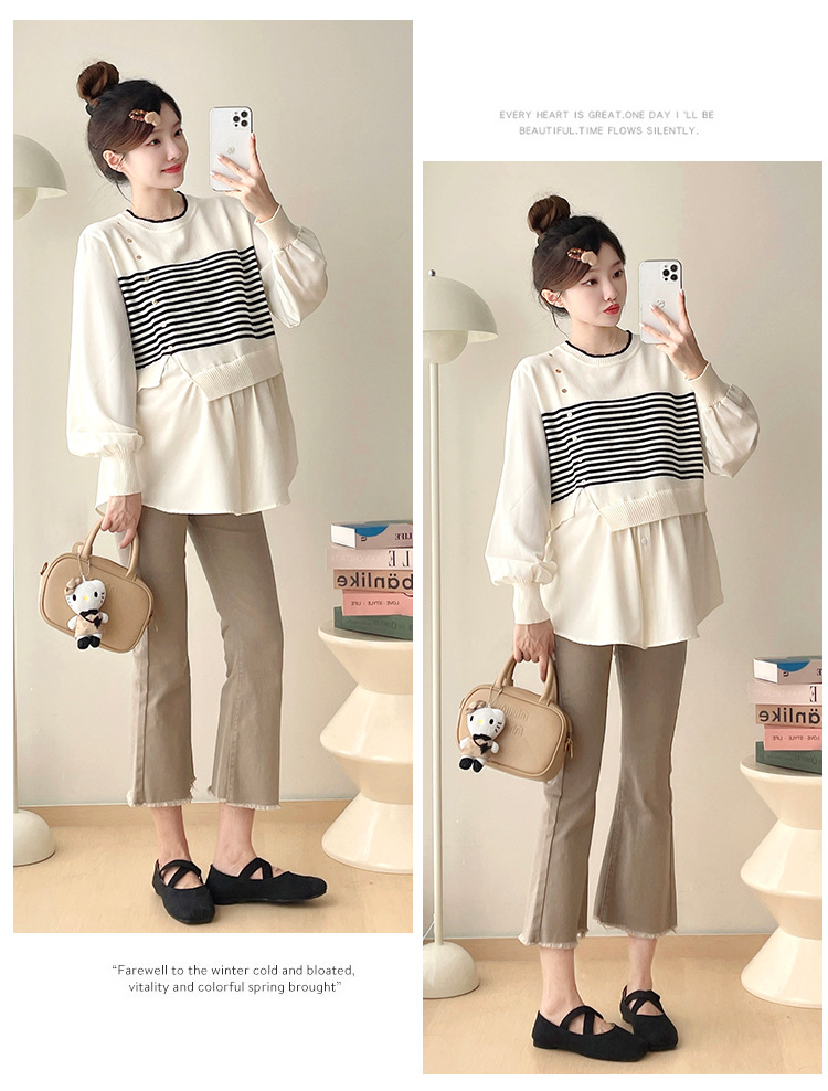 Реальный выстрел 2025 весна и осень новая полоска поддельные две трикотажные рубашки для беременных рубашки большого размера для беременных топ