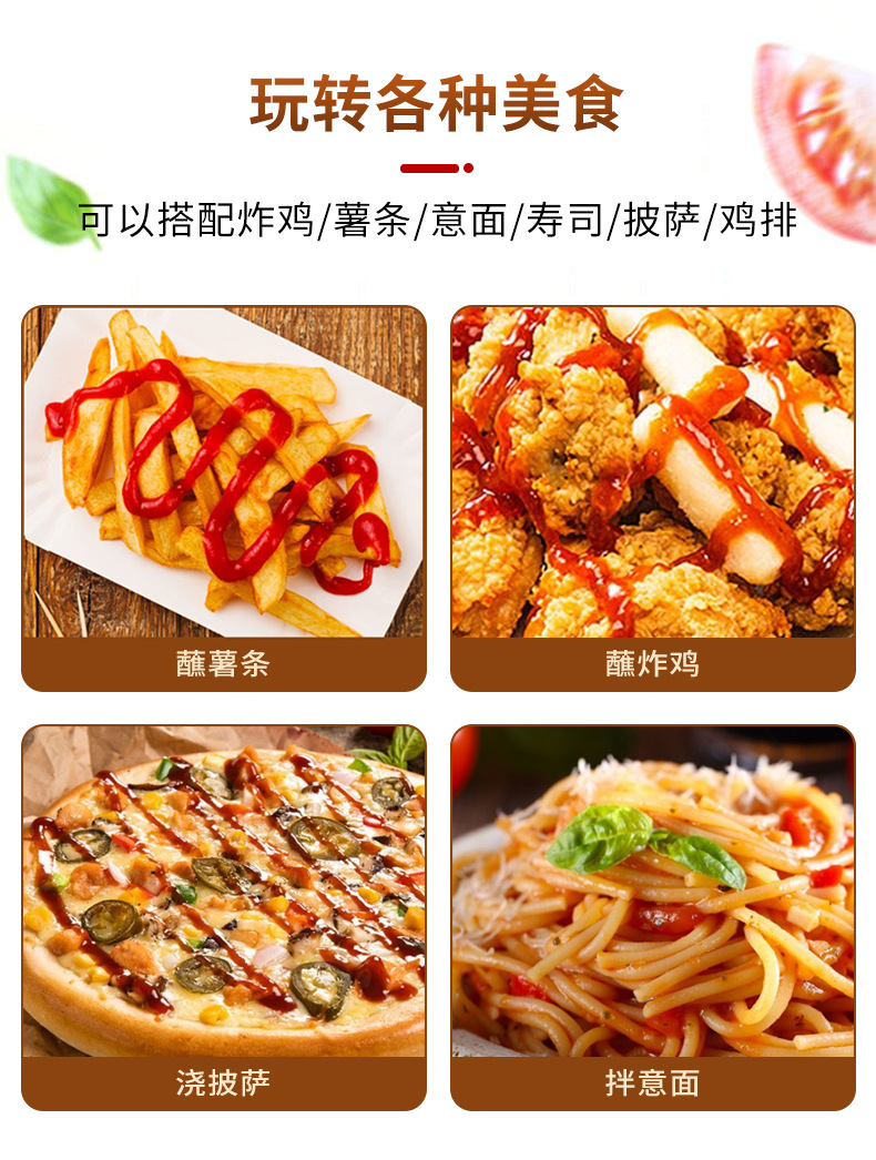 Соусы: томатный соус, соус для бургеров, соус для жареной курицы, соус для пиццы, соус для куриных рулетов, соус для картофеля фри, соус для блинчиков, соус для пасты, обезжиренный соус.