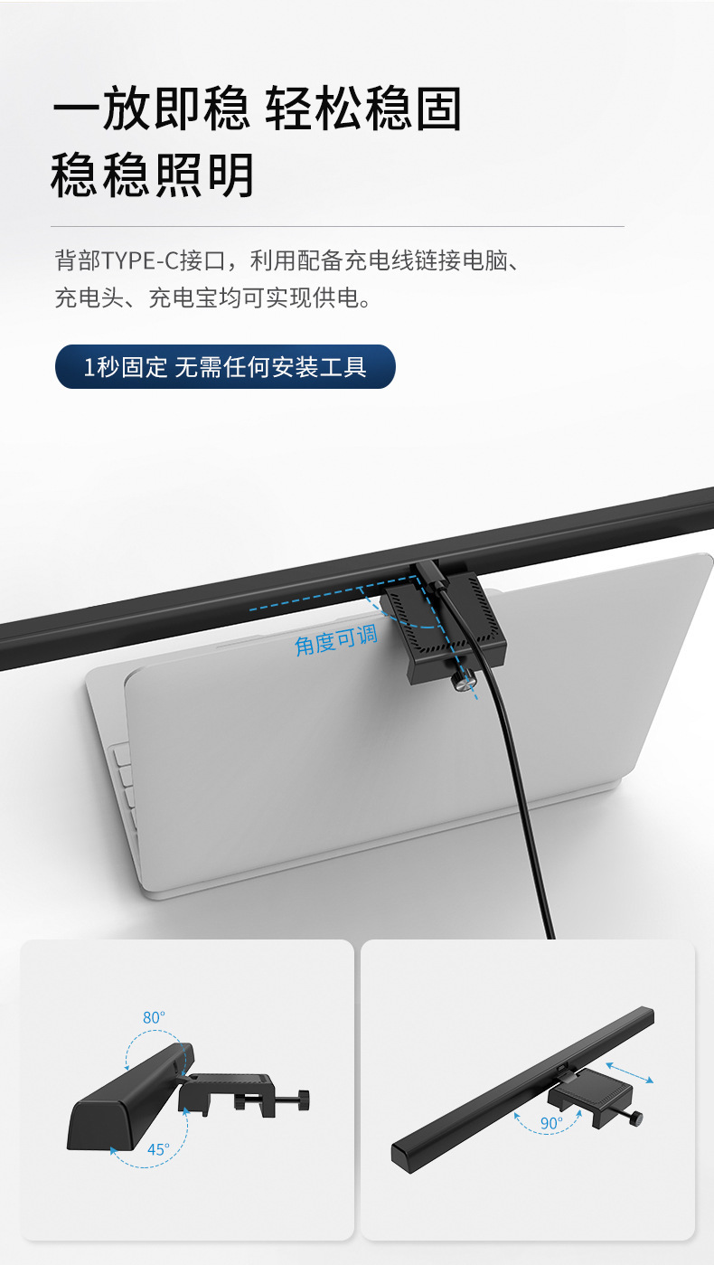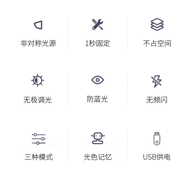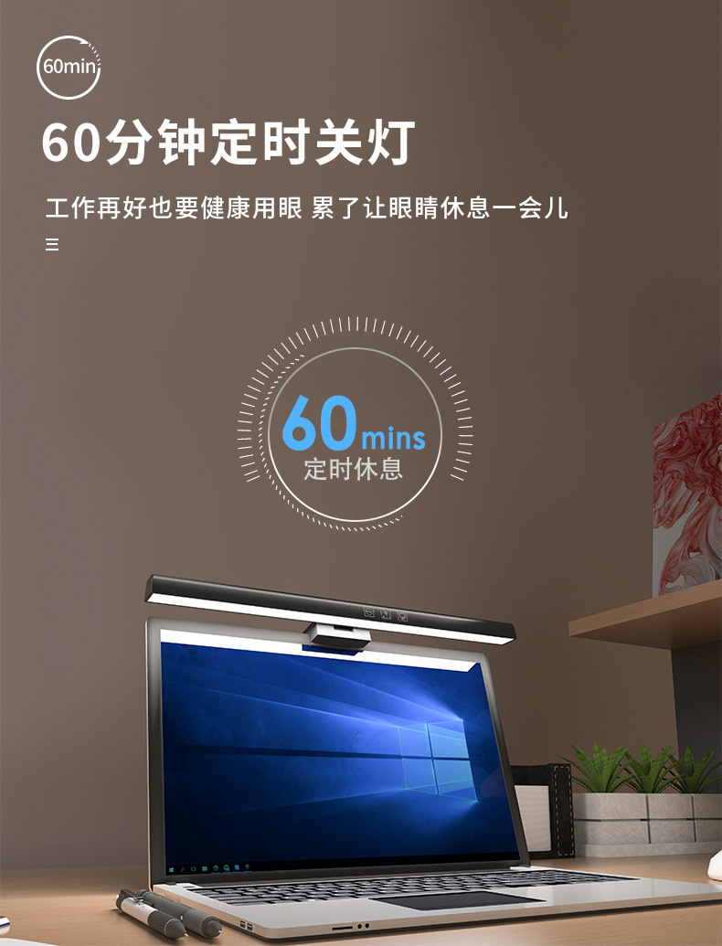 功能特点:定时60分钟关灯功能,无极调光,快捷阅读模式,三色温调节,非对称光源