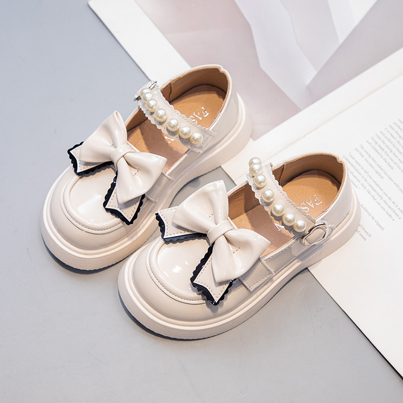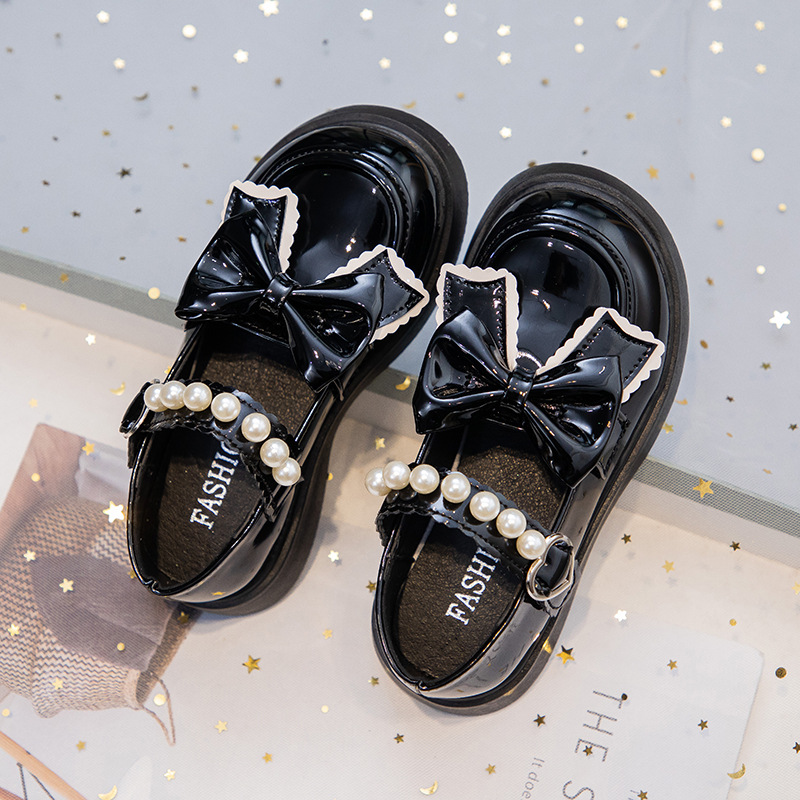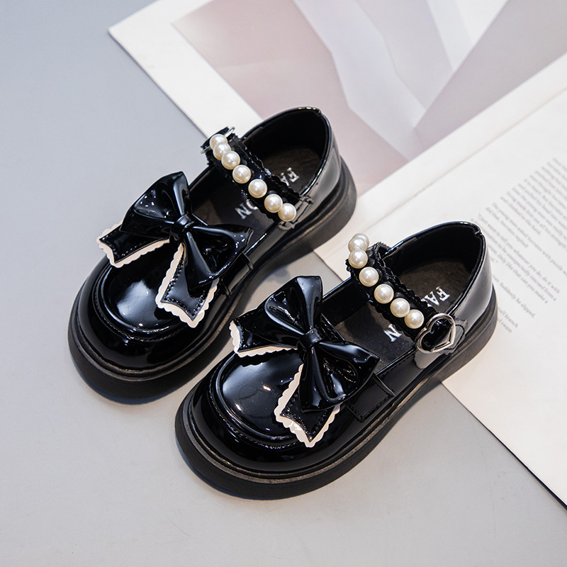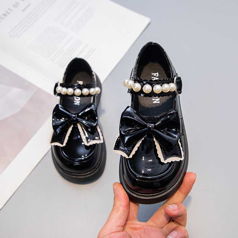 Детские кожаные туфли для девочек с жемчужным бантом, туфли принцессы, черные школьные туфли, белые нескользящие танцевальные туфли, балетки