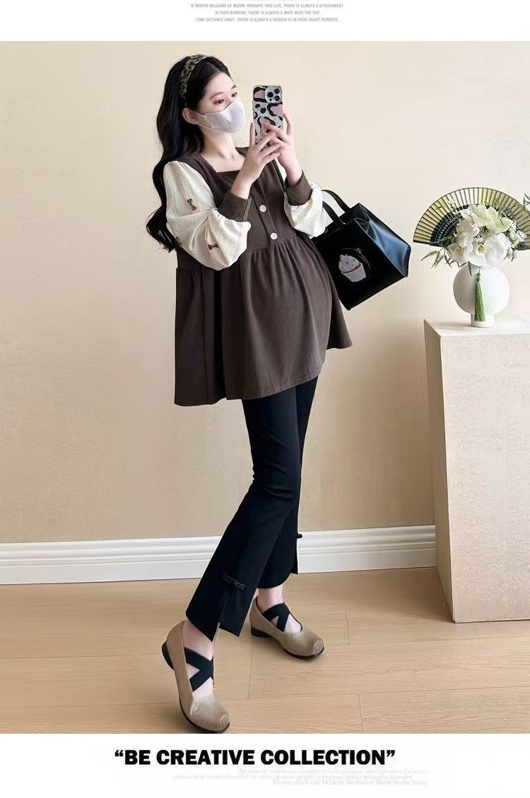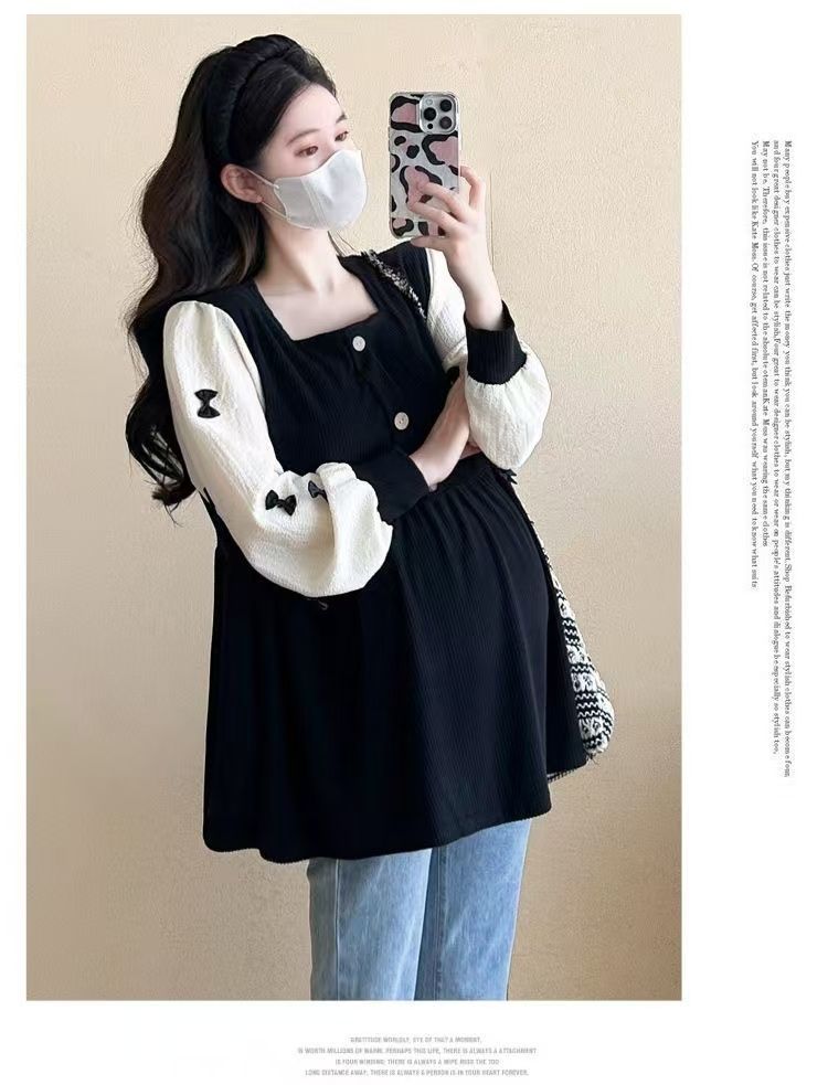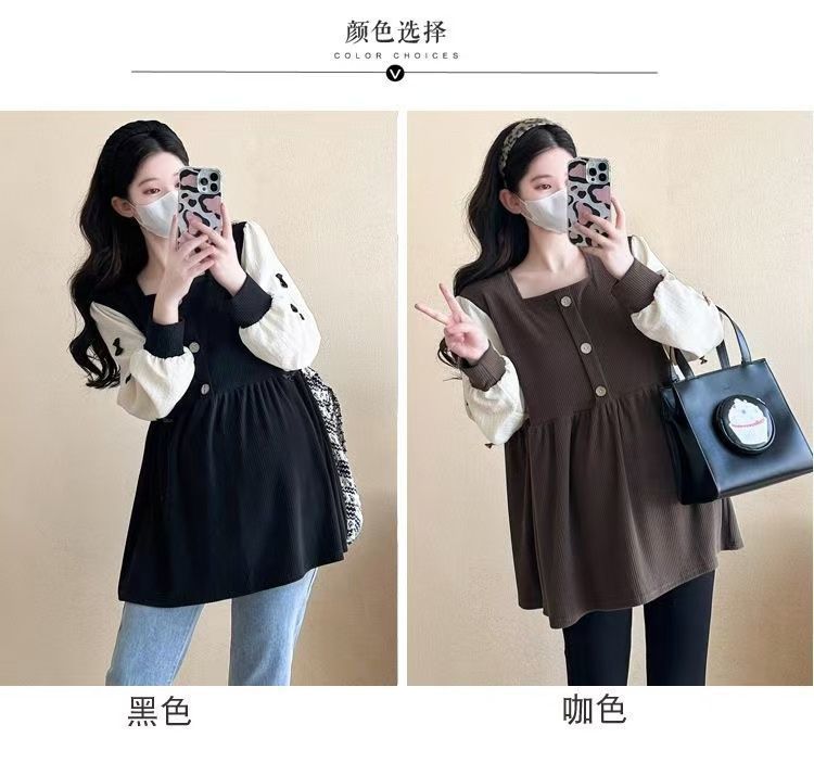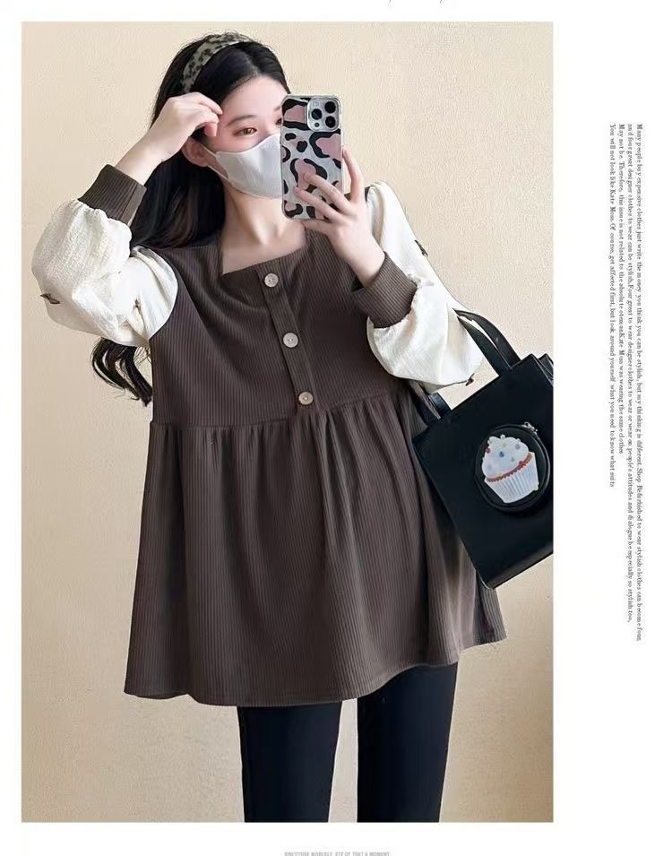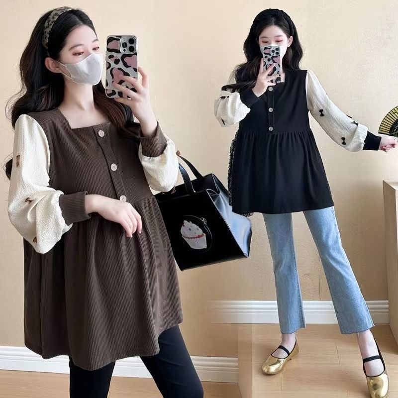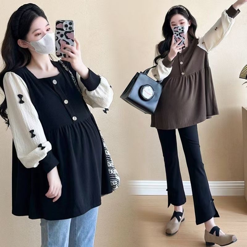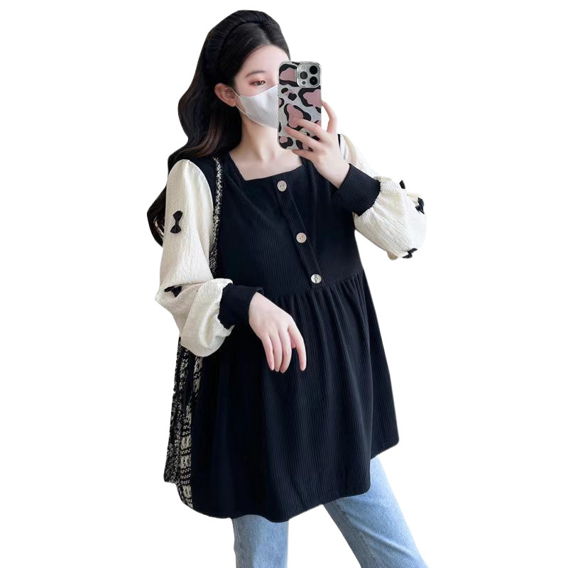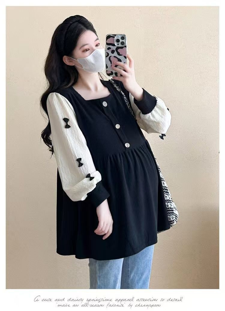 Квадратный воротник контрастный цвет топ с длинными рукавами рубашка беременная весна и осень новая свободная тонкая рубашка