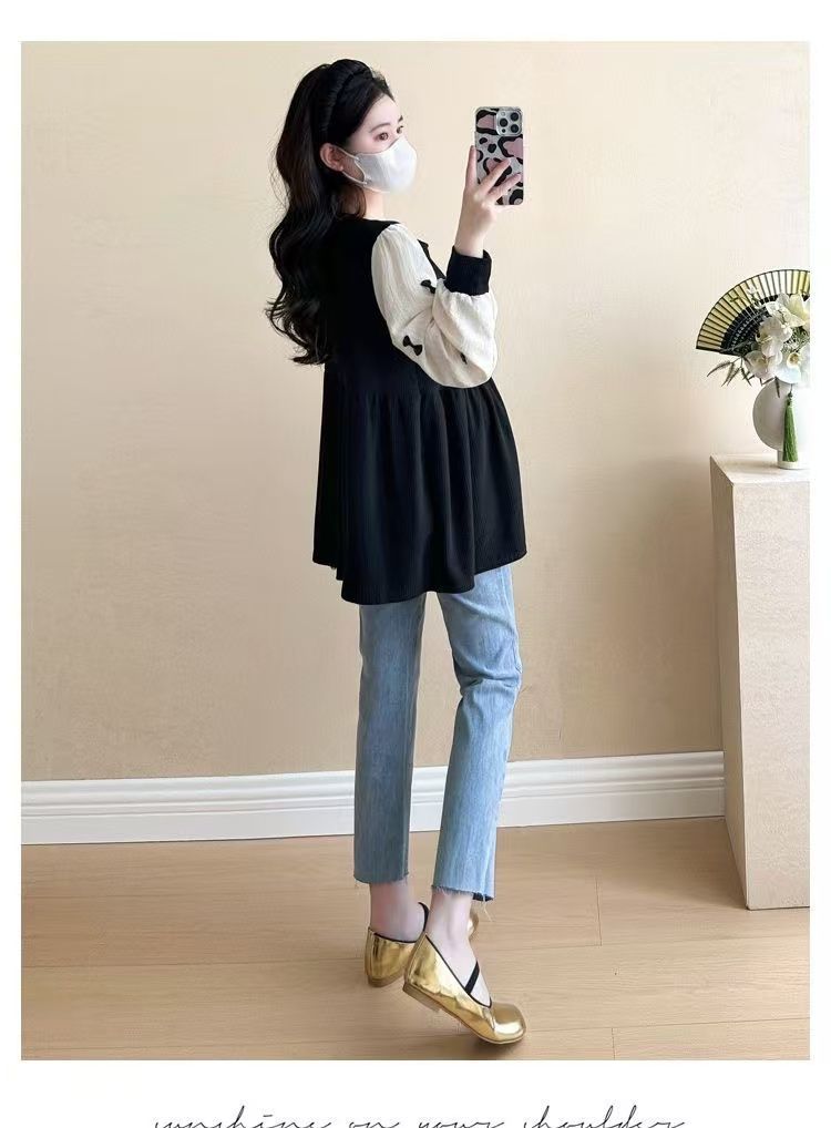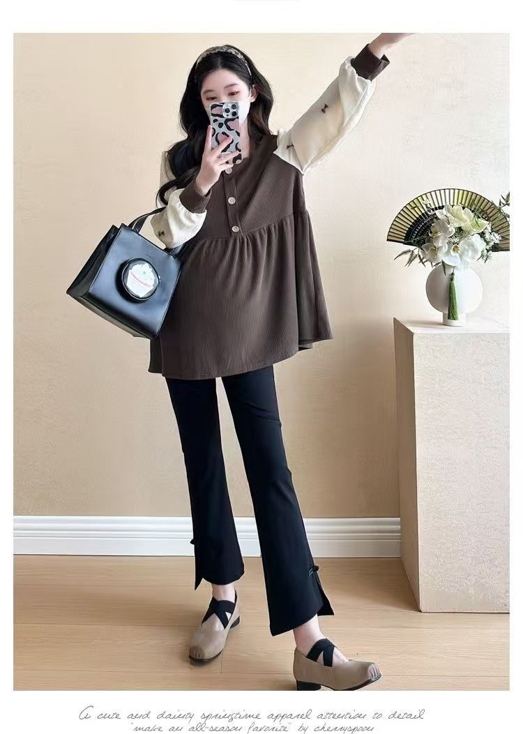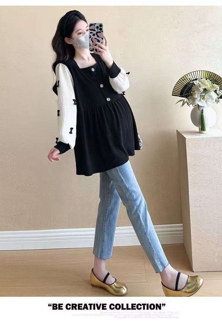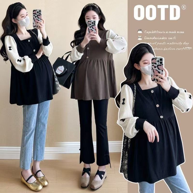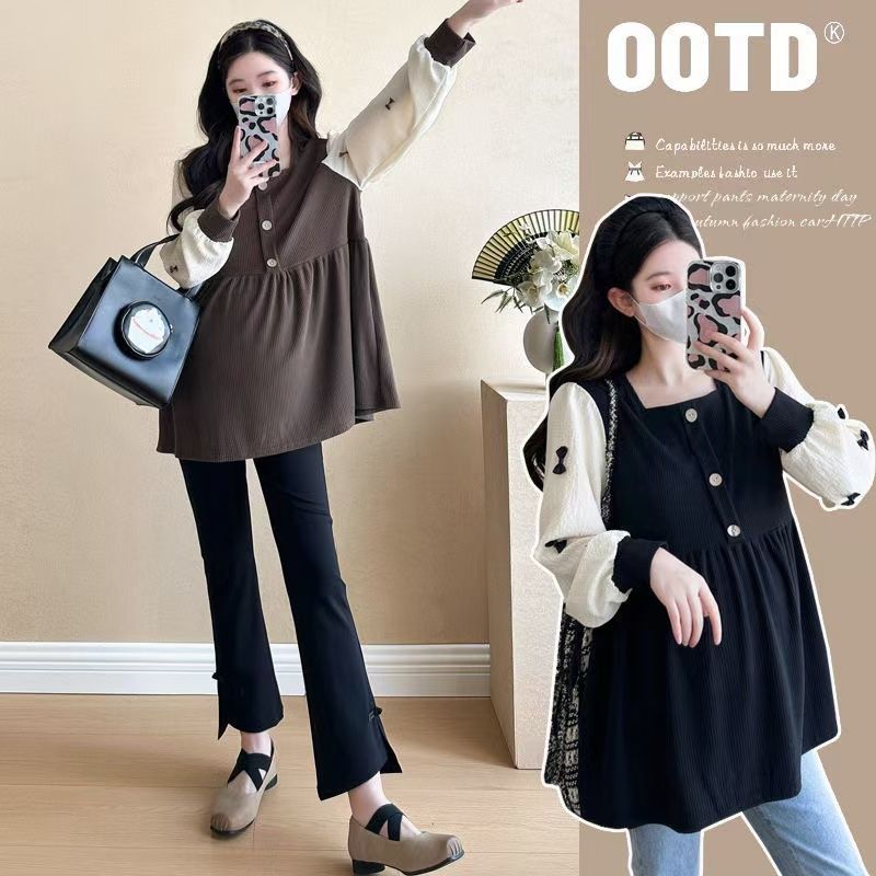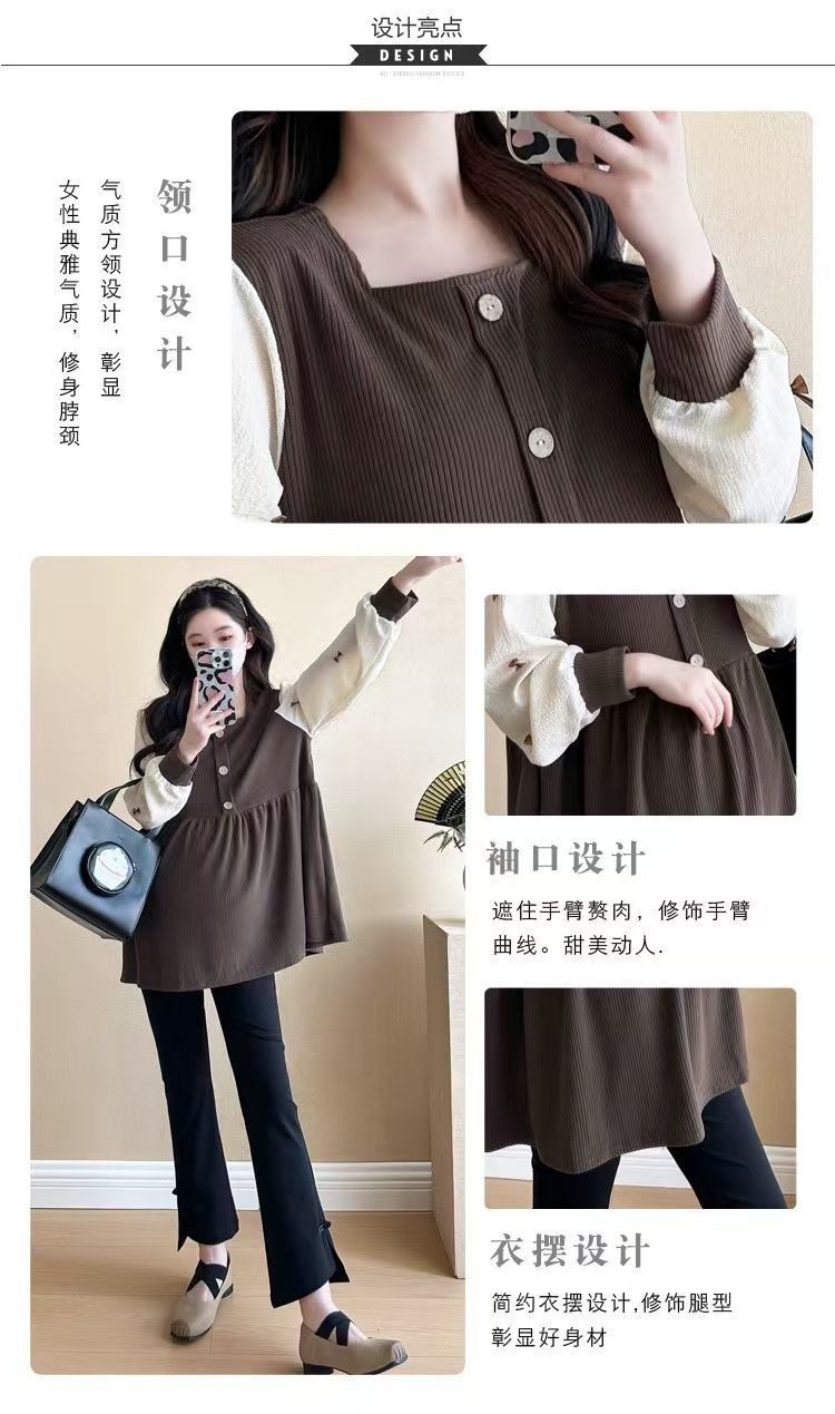 Квадратный воротник контрастный цвет топ с длинными рукавами рубашка беременная весна и осень новая свободная тонкая рубашка