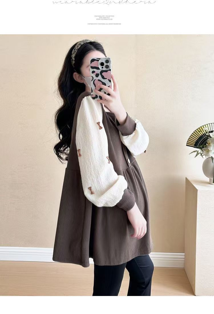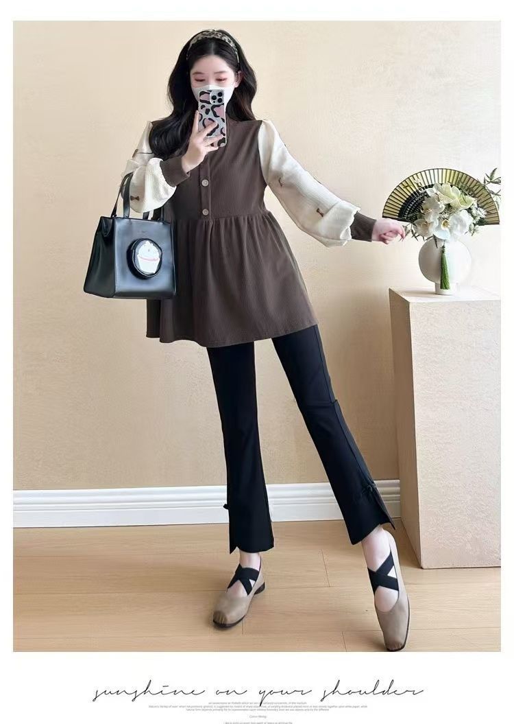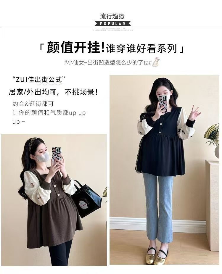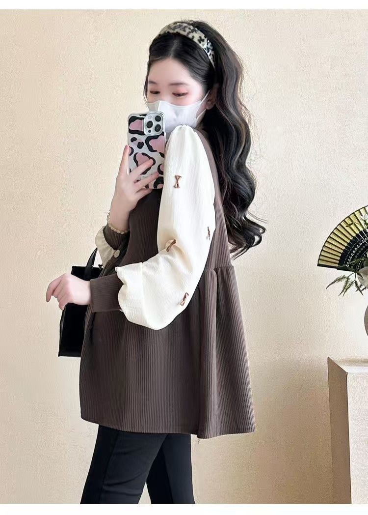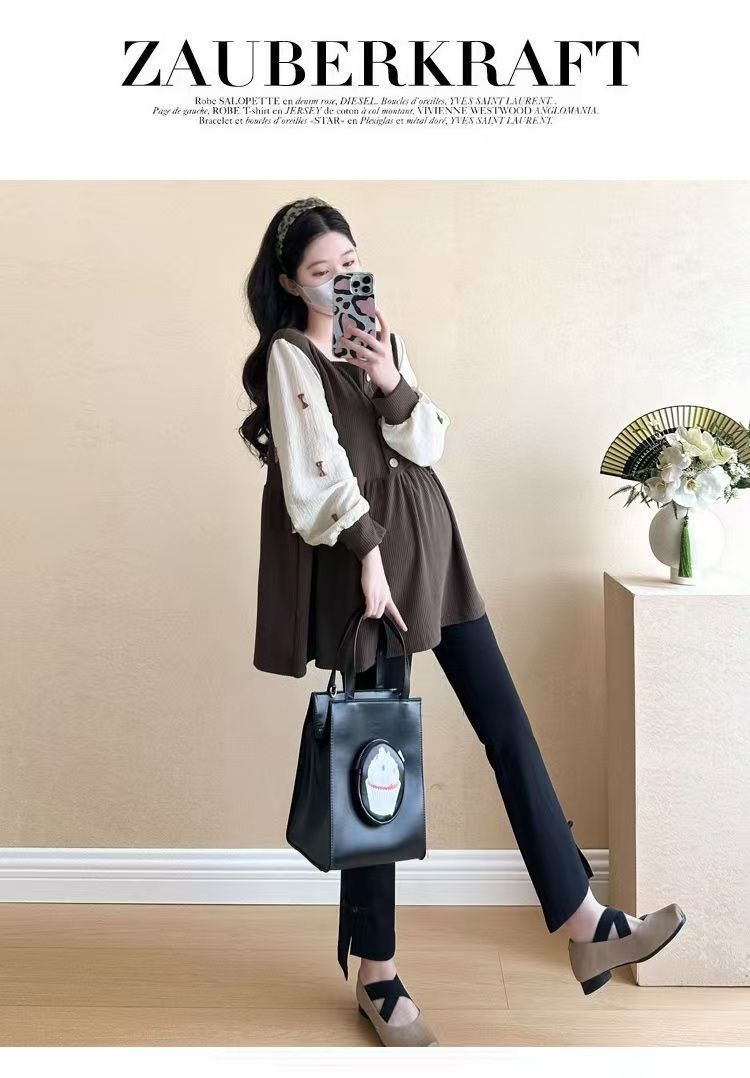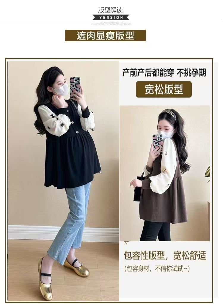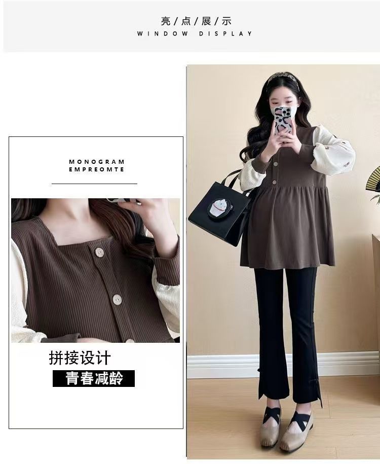 Квадратный воротник контрастный цвет топ с длинными рукавами рубашка беременная весна и осень новая свободная тонкая рубашка