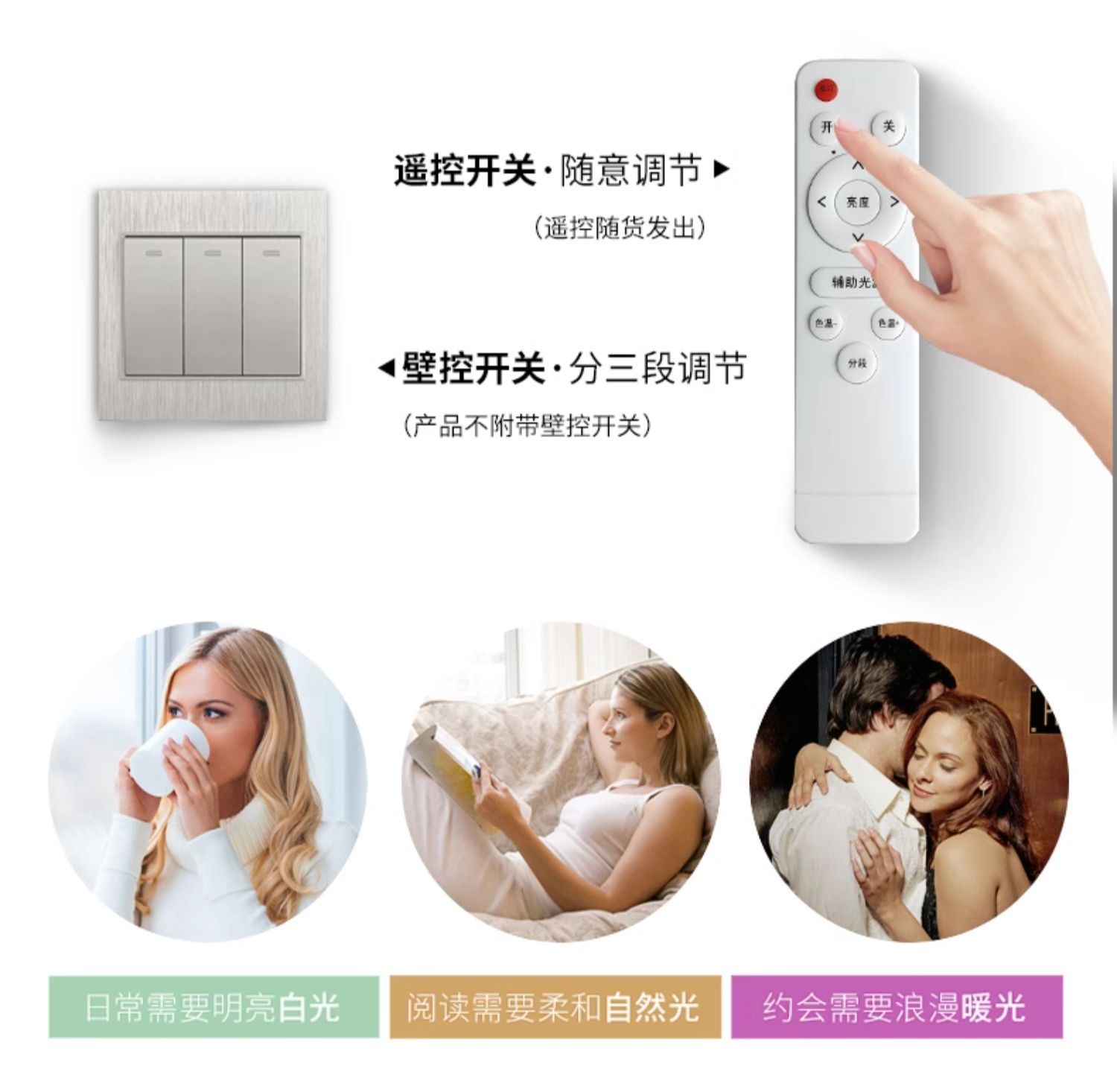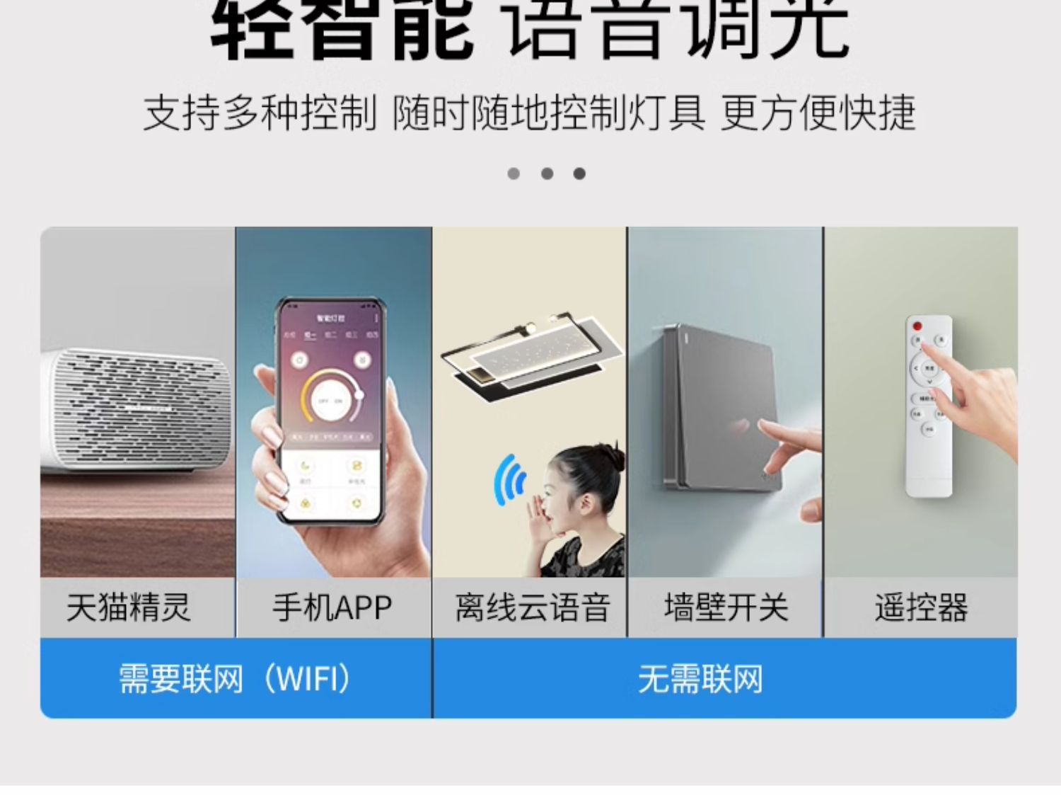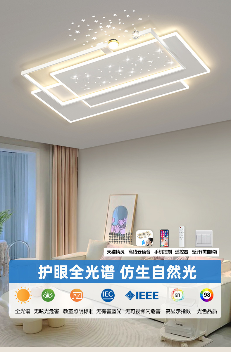 трехцветный свет ---- В гостиной идет бесступенчатый пульт дистанционного управления.; Автономное управление голосом [дистанционное управление + голосовое управление + мобильное приложение + настенный выключатель]; Tmall Elf [пульт дистанционного управления + голосовое управление + мобильное приложение + настенный выключатель]; Xiaomi Xiaoai [пульт дистанционного управления + голосовое управление + мобильное приложение + настенный выключатель]