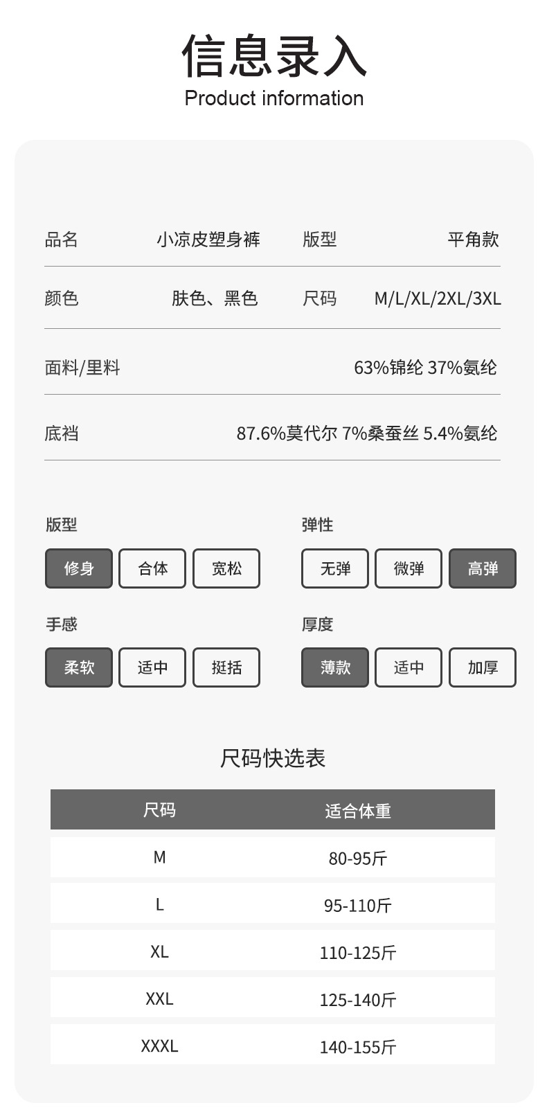 М( 40-47.5kg ); Л( 47.5-55kg ); XL( 55-62.5kg ); 2XL( 62.5-70kg ); 3XL( 70-75kg )