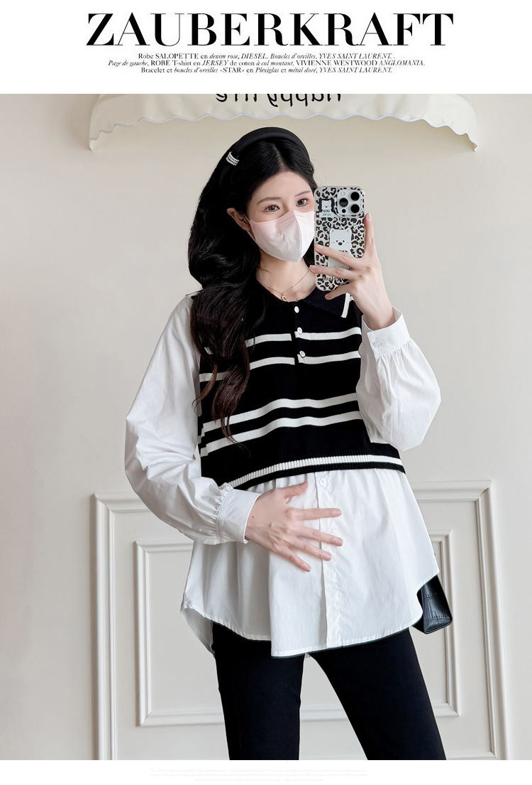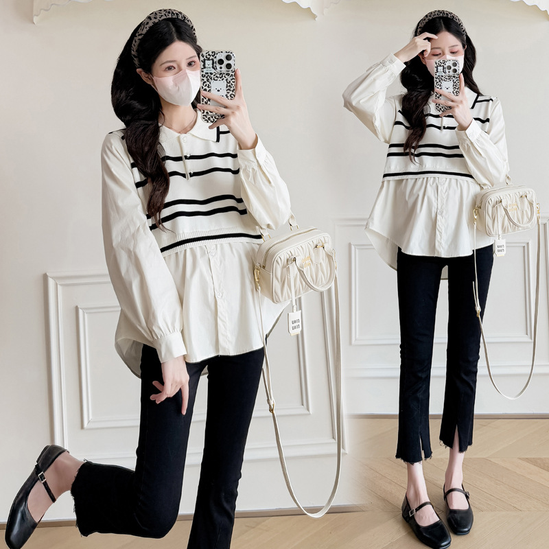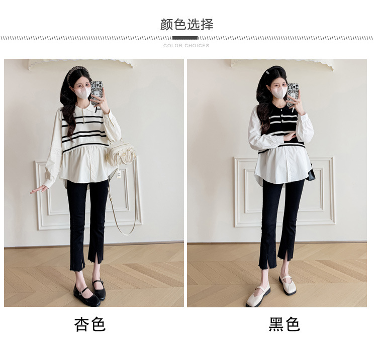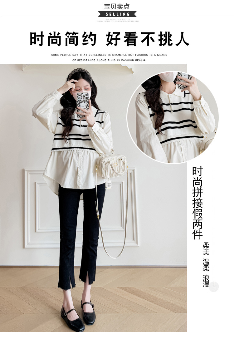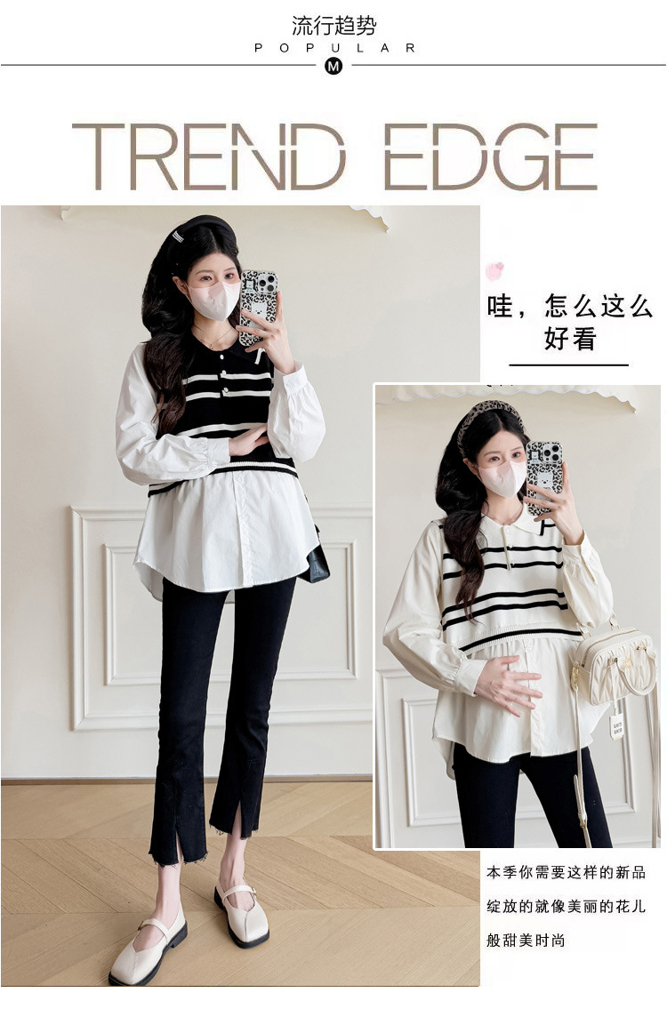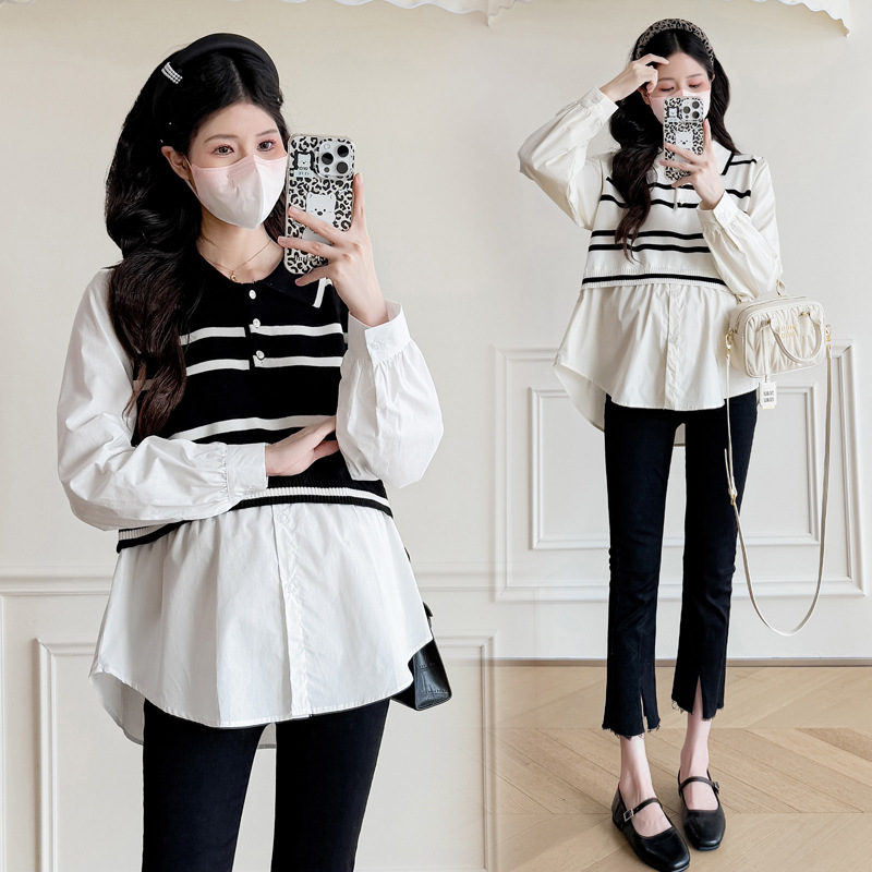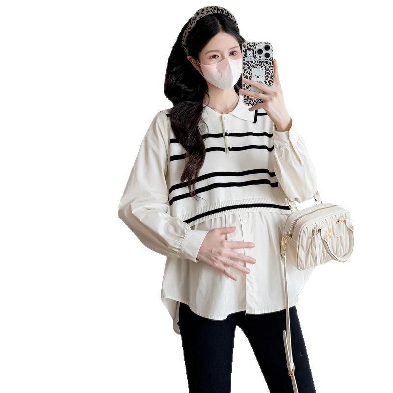 Модный топ для беременных весна 2025: полосатая рубашка-имитация двухслойного кроя, свободный крой для скрытия живота и эффекта стройности