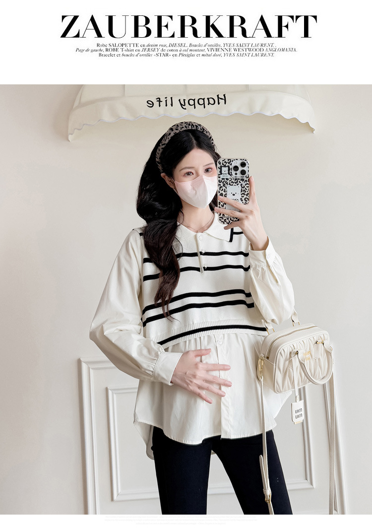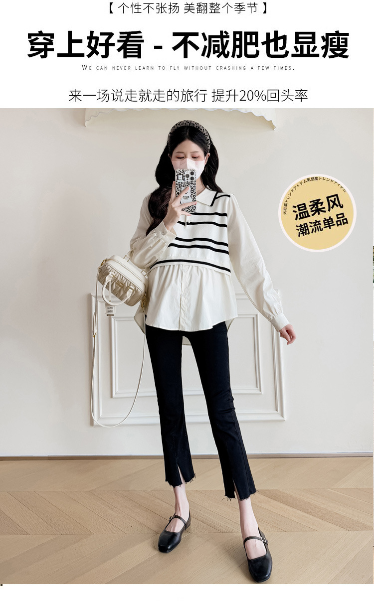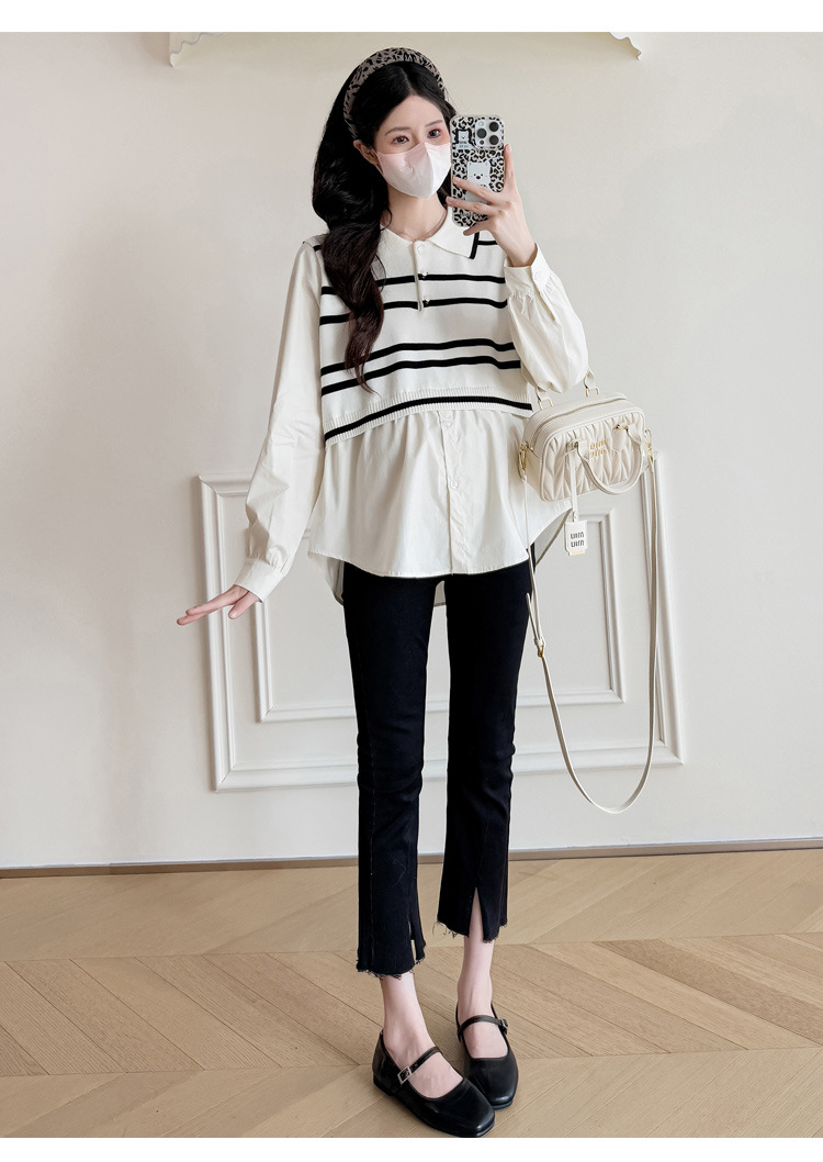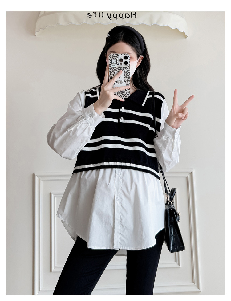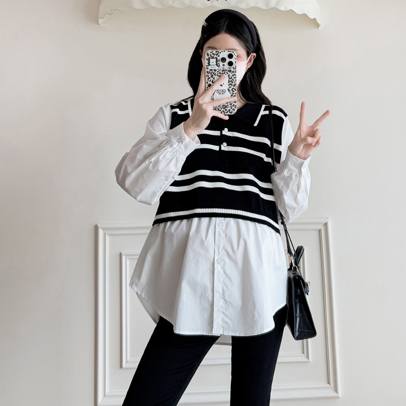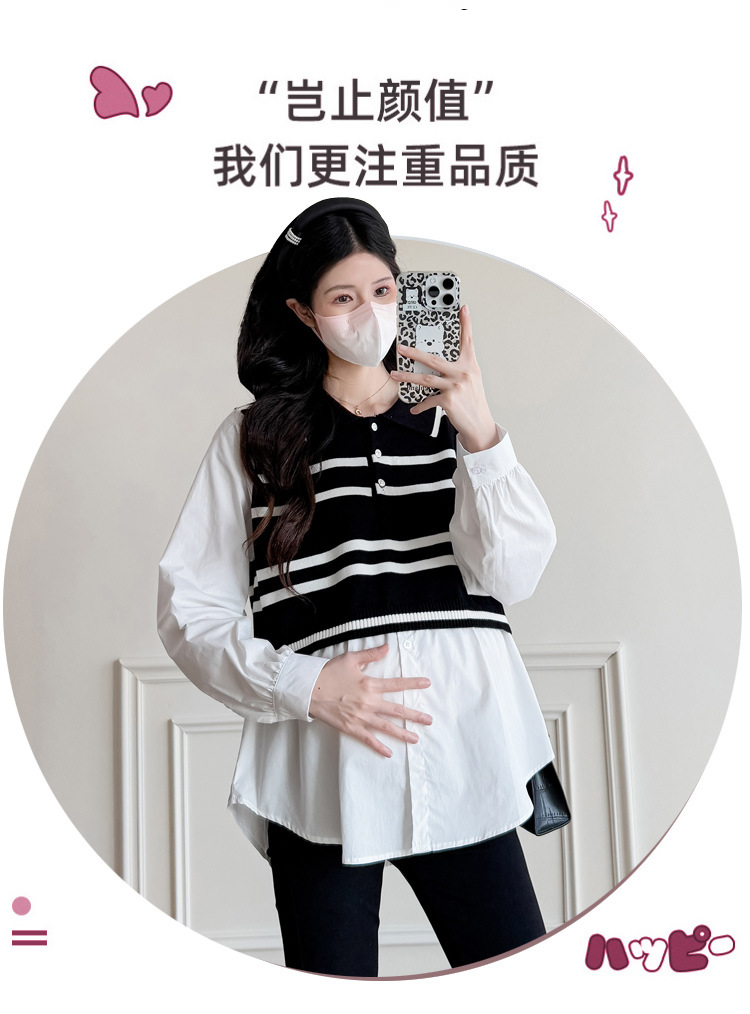 Модный топ для беременных весна 2025: полосатая рубашка-имитация двухслойного кроя, свободный крой для скрытия живота и эффекта стройности