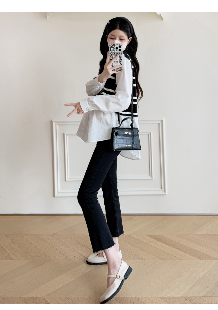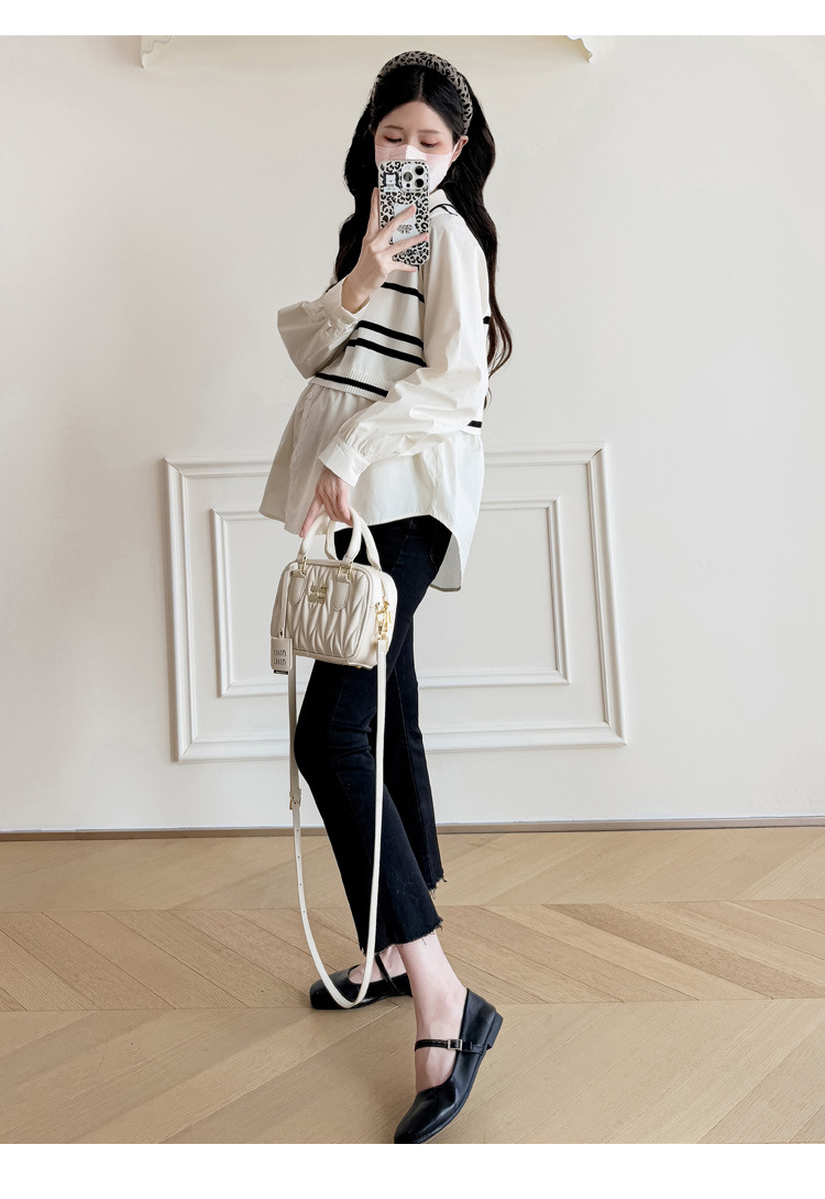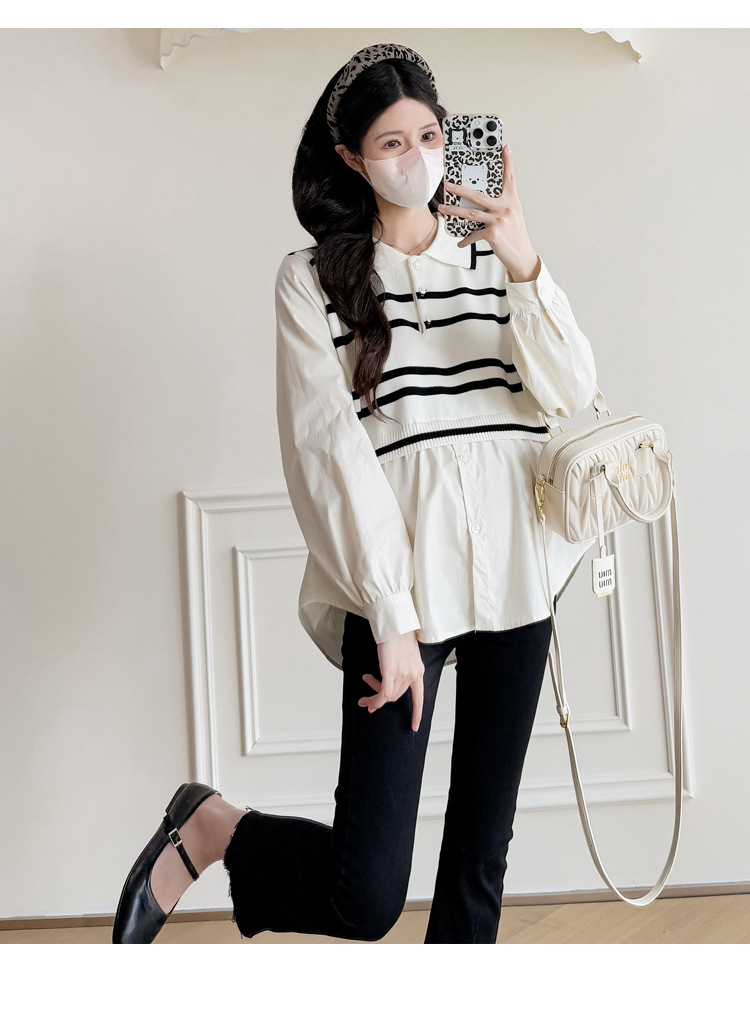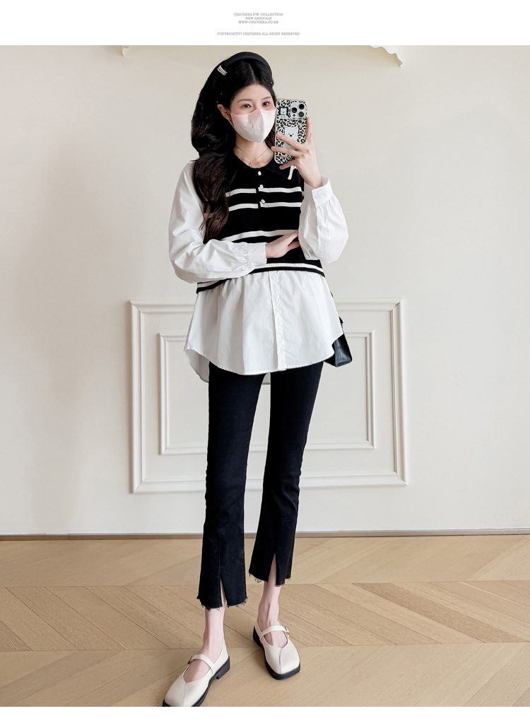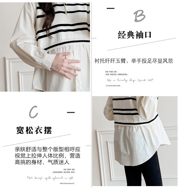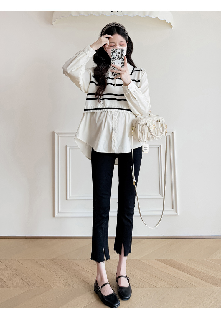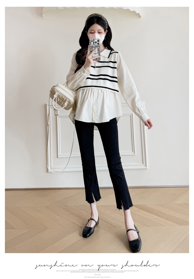 Модный топ для беременных весна 2025: полосатая рубашка-имитация двухслойного кроя, свободный крой для скрытия живота и эффекта стройности