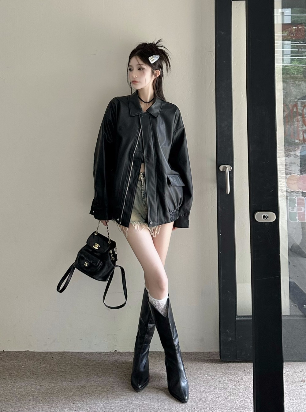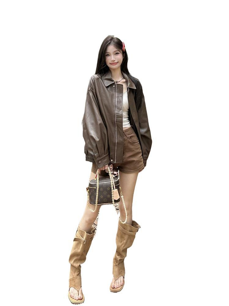 Ретро американский цвет карри кожаный пиджак женский весенний и осенний сладкий ветер