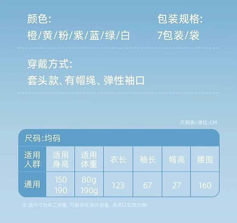 Одноразовый плащ оранжевого цвета; Одноразовый плащ желтого цвета; Одноразовый плащ розового цвета; Одноразовый плащ фиолетового цвета; Одноразовый плащ синего цвета; Одноразовый плащ зеленого цвета; Одноразовый плащ белого цвета
