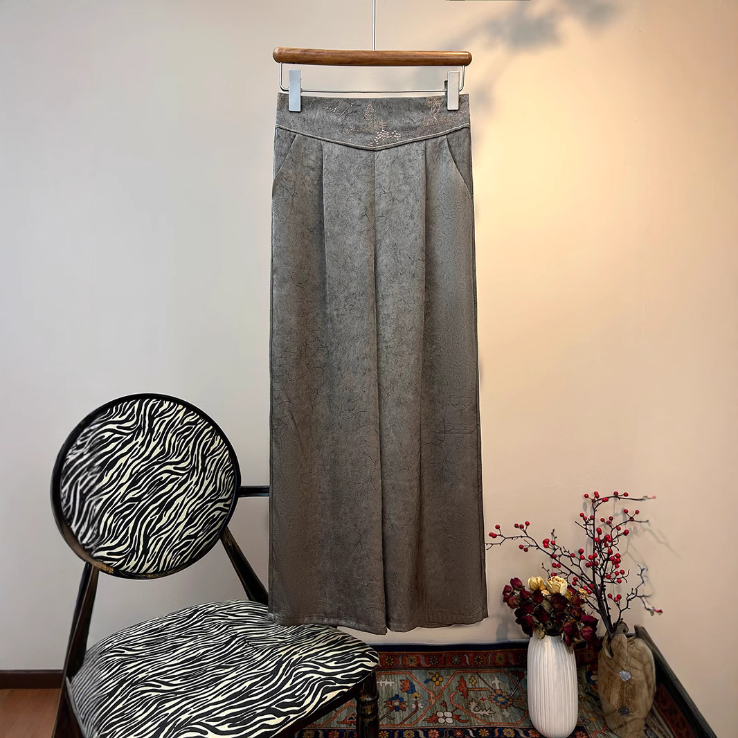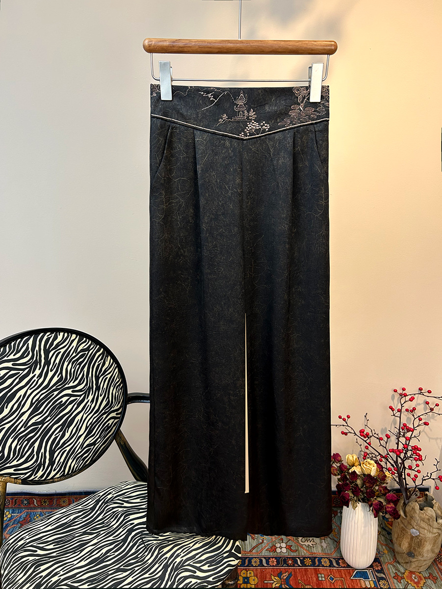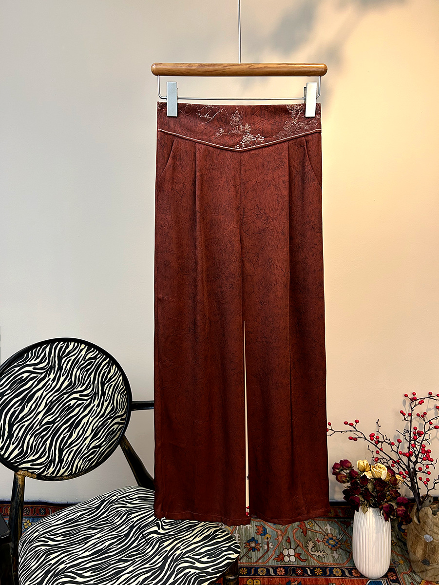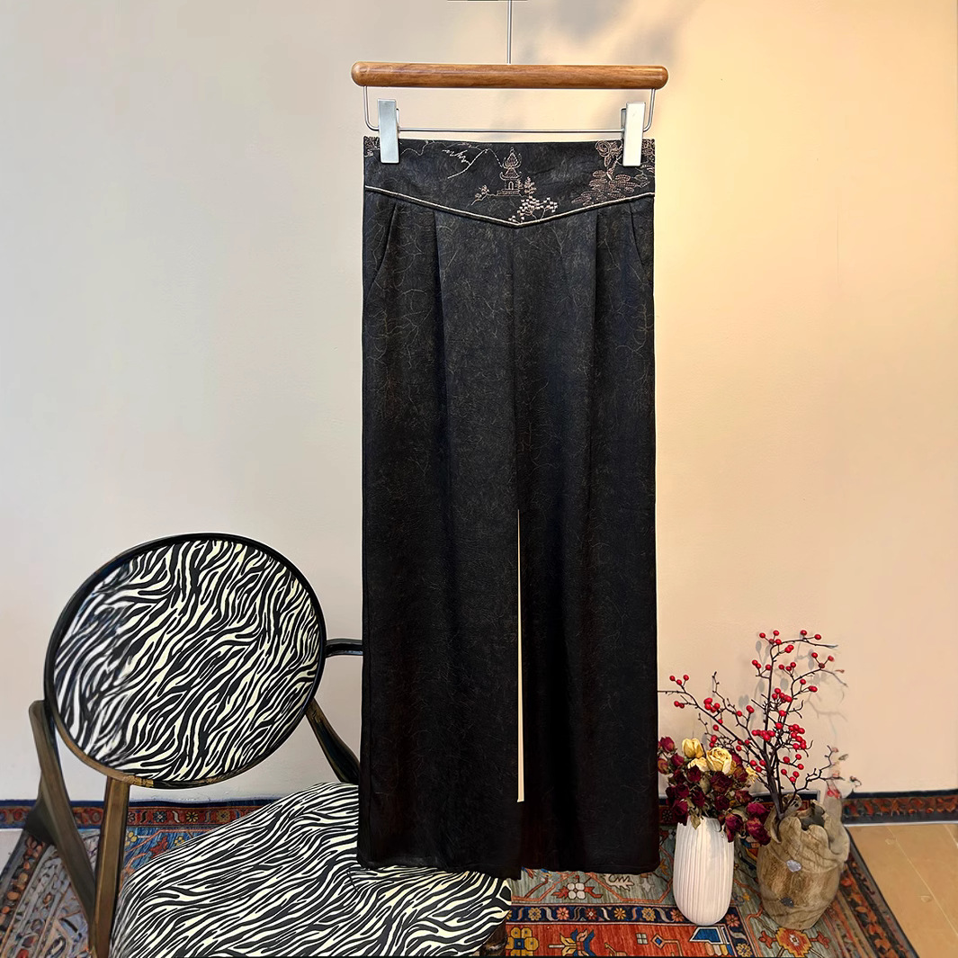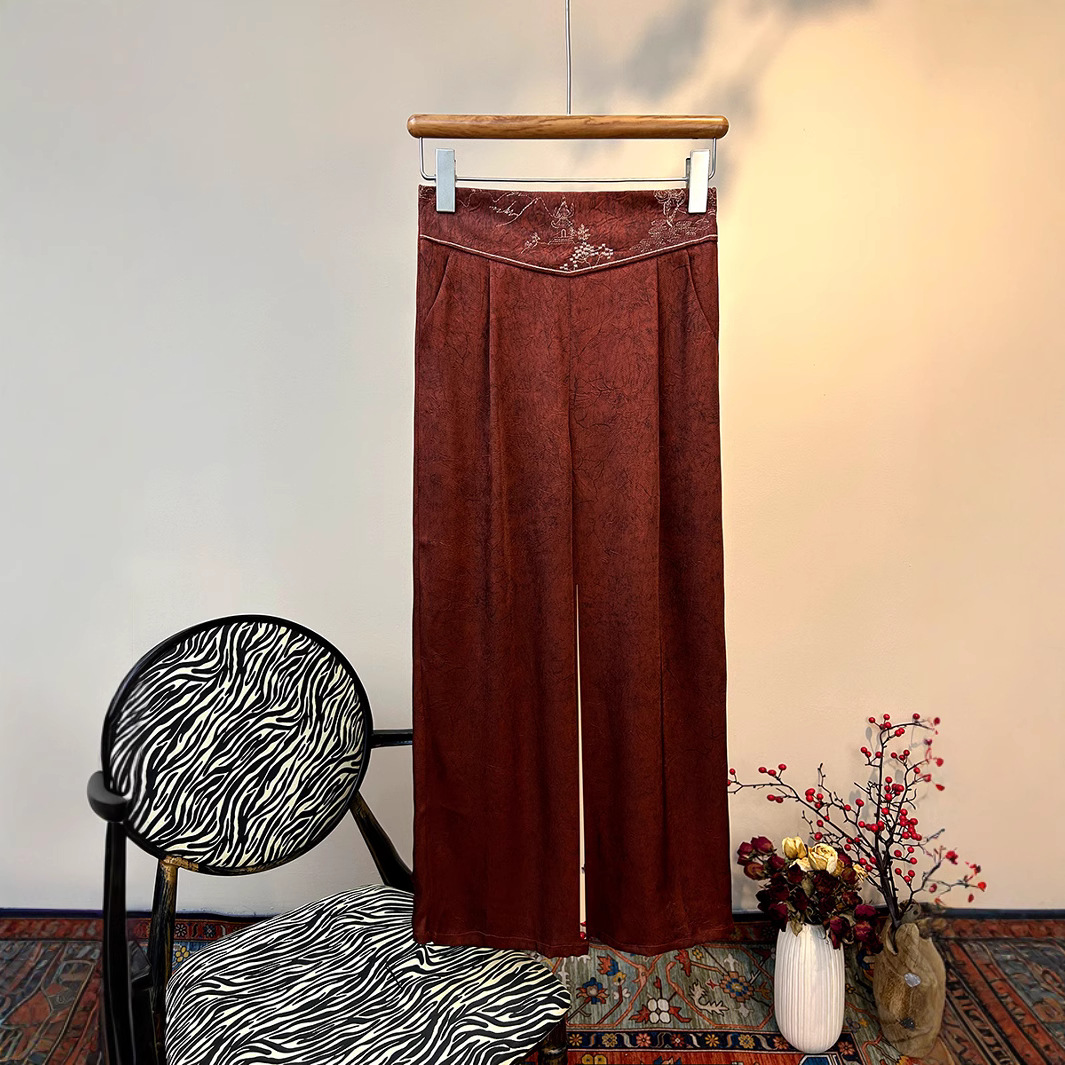 2025 новый блеск атласные широкие брюки с высокой талией вышивка легкая новая страна стиль эластические брюки повседневная женщина