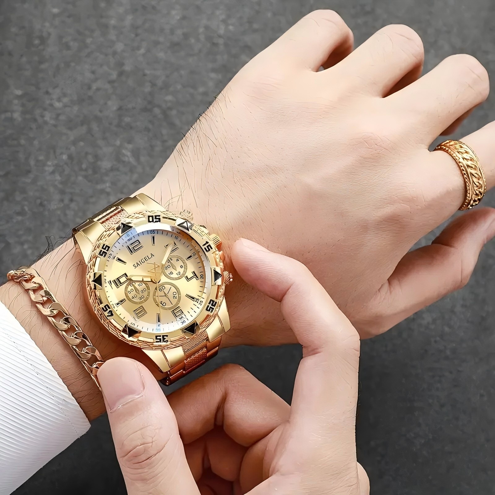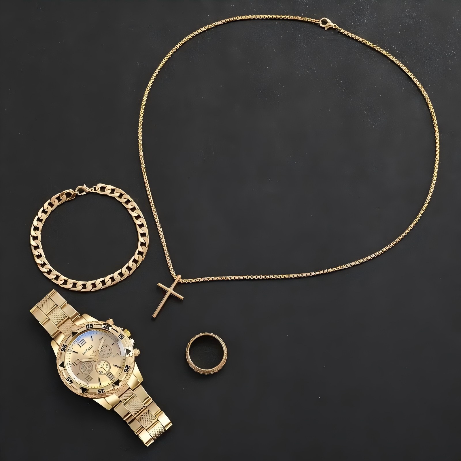 Золотые часы + золотое кольцо + золотой браслет + золотое ожерелье; Серебряные часы + серебряный браслет + серебряное кольцо + серебряное ожерелье; Золотой браслет + золотое кольцо + золотое колье; Серебряный браслет + серебряное кольцо + серебряное колье; золотые часы; серебряные часы; Золотые часы + золотой браслет; Золотые и синие часы + золотой браслет; Серебристо-синие часы + серебряный браслет; Серебряные часы + серебряный браслет; Римские золотые часы + комплект из трех предметов; Римские золотые и синие часы + комплект из трех предметов; Римские синие часы + комплект из трех предметов
