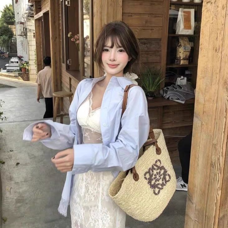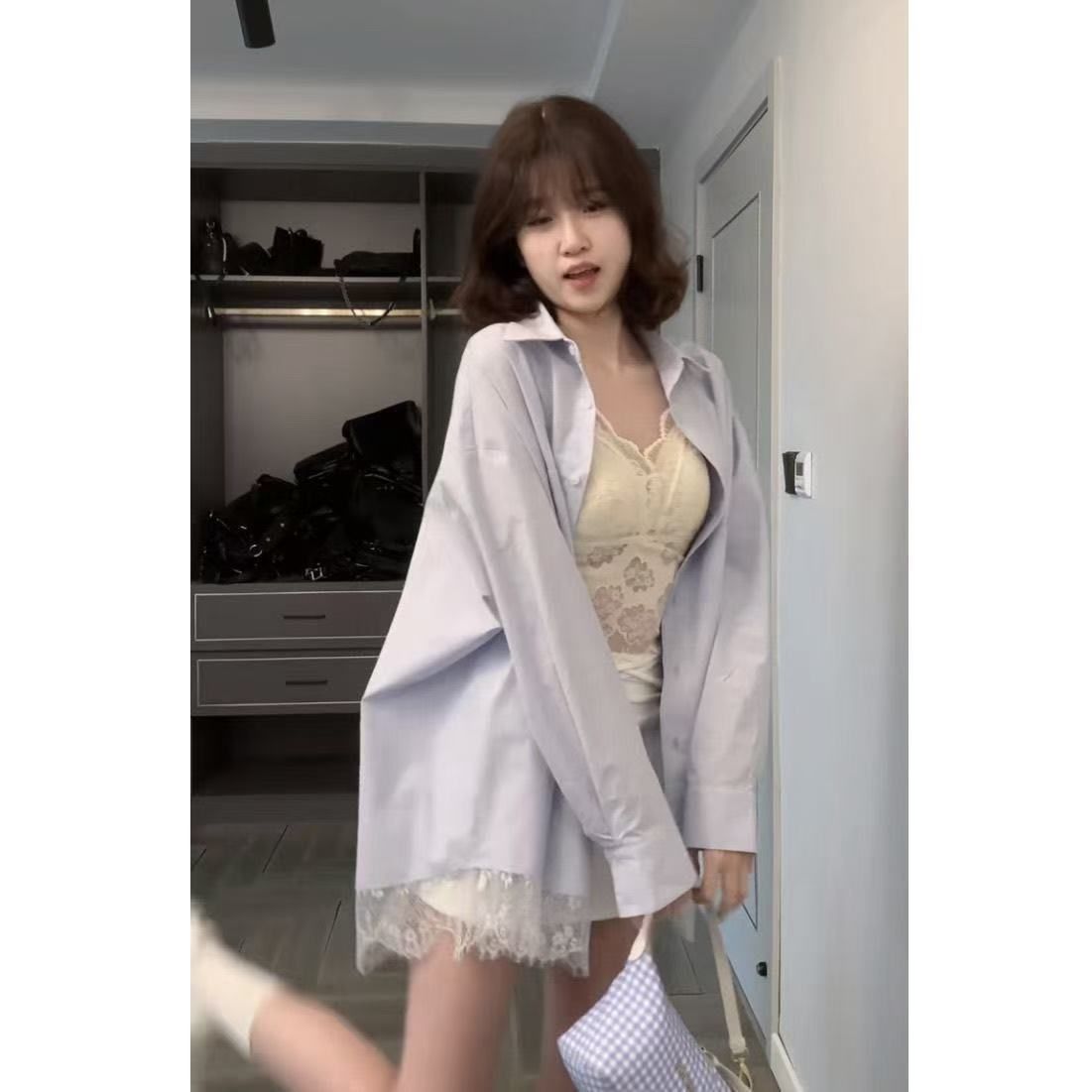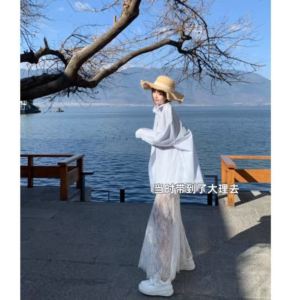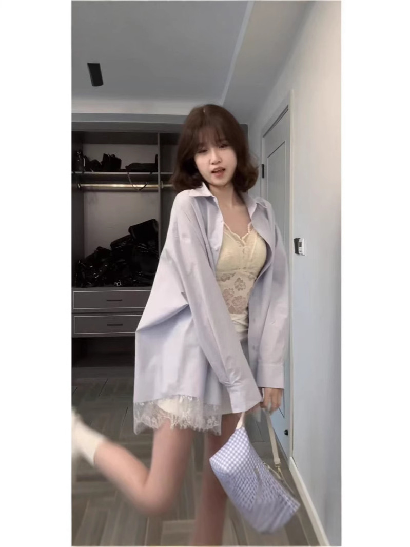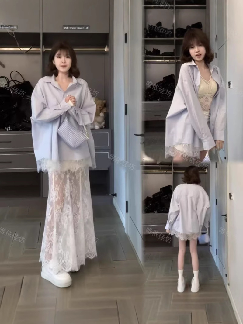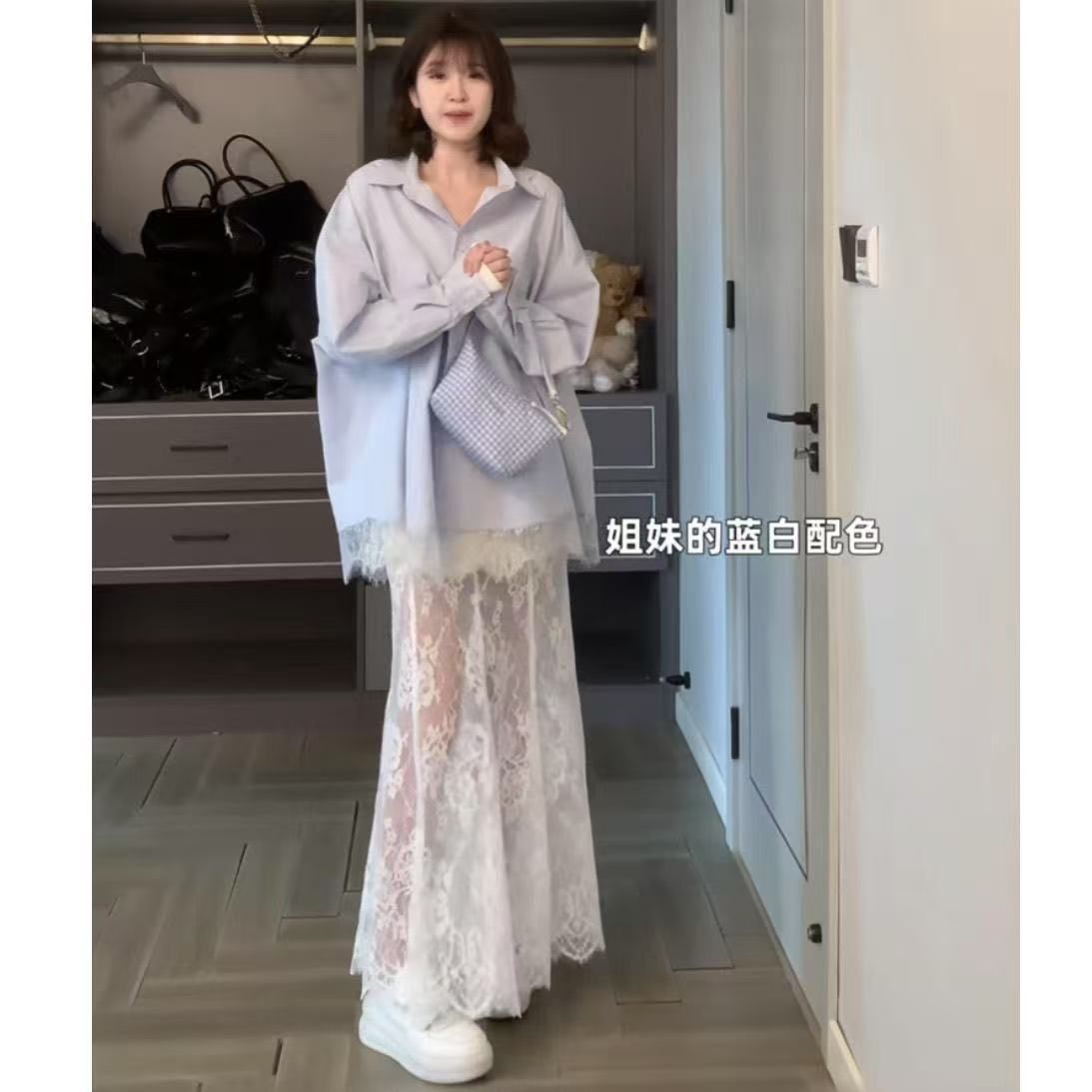 Ранней весной носите набор иностранных синих рубашек, чтобы сшить кружевное корейское кружевное платье из двух частей