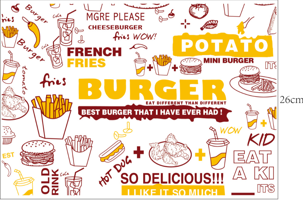 Специально для бумажно-пластиковой упаковки.; Пакет для картофеля фри 10*11+1,5см.; Пакет для картофеля фри 11*16+2см.; Пакет для картофеля фри 14*18+3см.; Английская бумага 38*28см.; Бумага для картофеля фри 36*26см.; Бумага для гамбургеров 30*28см.; Пакет из крафт-бумаги 15*16см.; Красная клетчатая бумага 18*18; Красная клетчатая бумага 22*22