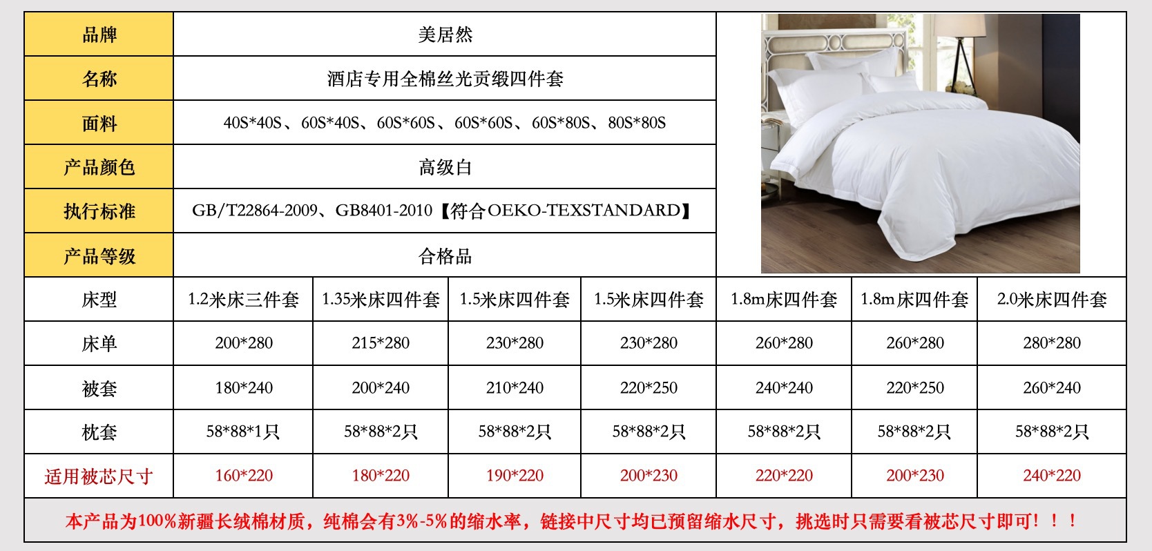 1m комплект постельного белья из трех предметов, подходит для одеяла размером 140*225.; Комплект из трех частей кровати длиной 1,2 м, подходит для одеяла размером 150*200.; 1.2m комплект постельного белья из трех предметов, подходит для одеяла размером 160*220.; Комплект из четырех предметов на 1.35m кровати, подходит для одеяла размером 180*220.; 1.5m комплект постельного белья из четырех предметов, подходит для одеяла размером 190*220.; Комплект из четырех частей кровати длиной 1,5 м, подходит для одеяла размером 200*230.; 1.8m комплект постельного белья из четырех предметов, подходит для одеяла 200*230.; 1.8m комплект постельного белья из четырех предметов, подходит для одеяла размером 220*225.; 2.0m комплект постельного белья из четырех предметов, подходит для одеяла размером 220*240.; Пятисекционный комплект кровати длиной 1,2 м [комплект из трех предметов + основание подушки + основание одеяла]; Комплект постельного белья для двуспальной кровати (7 предметов): [комплект из четырех предметов + наполнитель для подушки + наполнитель для одеяла 190*220]; Комплект постельного белья 1,8 м, семь предметов [набор из четырех предметов + наполнитель для подушек + наполнитель для одеяла 220*220]; Комплект постельного белья для кровати 1,2 м, шесть предметов [комплект из трех предметов + наполнитель для подушки + наполнитель для одеяла + наматрасник]; Комплект для кровати 1.5 [набор из четырех предметов + наполнитель для подушек + наполнитель для одеяла 190*220 + наматрасник]; Комплект постельного белья для кровати 1,8 м, 8 предметов [набор из 4 предметов + наполнитель для подушек + наполнитель для одеяла 220*220 + наматрасник]; Односпальные простыни: 180*280 (применимо к кровати 1,0 м); Односпальные простыни: 200*280 (применимо к кровати длиной 1,2 м); Простыни на односпальную кровать: 215*280 (применимо к кровати длиной 1,35 м); Односпальные простыни: 230*280 (применимо к кровати длиной 1,5 м); Односпальные простыни: 260*280 (применимо к кровати 1,8 м); Односпальные простыни: 280*280 (применимо к кровати длиной 2,0 м); Комплект постельного белья для двуспальной кровати (7 предметов): [комплект из четырех предметов + наполнитель для подушки + наполнитель для одеяла 200*230]; Комплект постельного белья 1,8 м, семь предметов [набор из четырех предметов + наполнитель для подушек + наполнитель для одеяла 200*230]; Комплект постельного белья для двуспальной кровати (8 предметов): [комплект из 4 предметов + наполнитель для подушки + наполнитель для одеяла 200*230 + наматрасник]; Комплект постельного белья для кровати 1,8 м, 8 предметов [набор из 4 предметов + наполнитель для подушек + наполнитель для одеяла 200*230 + наматрасник]