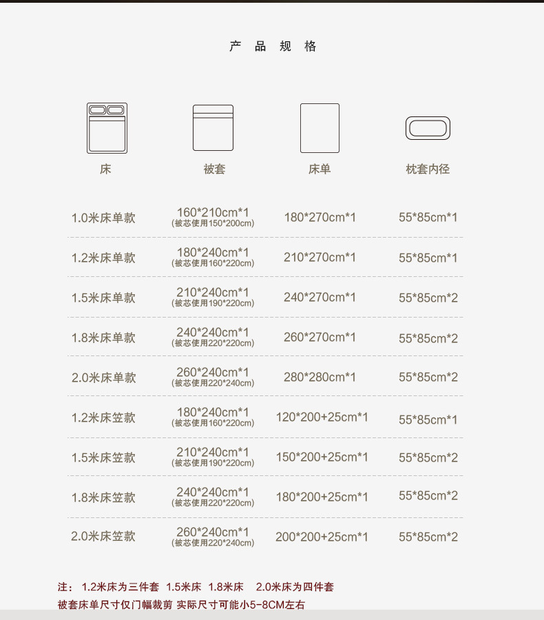 0.9m комплект постельного белья из трех предметов (пододеяльник 170*215см+простыни 180*280см+наволочка 58*88см); 1.2m комплект постельного белья из трех предметов (пододеяльник 180*240см+простыни 210*280см+наволочка 58*88см); 1.5m комплект постельного белья из четырех предметов (пододеяльник 210*240см+простыни 240*280см+наволочка 58*88см); 1.8m комплект постельного белья из четырех предметов (пододеяльник 240*240см+простыни 260*280см+наволочка 58*88см); 2m комплект постельного белья из четырех предметов (пододеяльник 240*260см+простыни 280*280см+наволочка 58*88см)