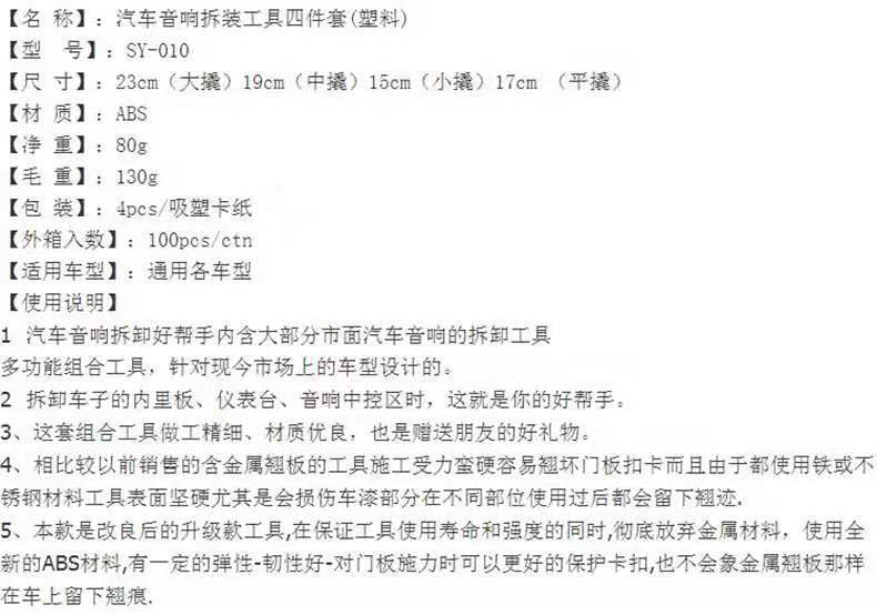 6 种类非常全,包括拆卸门板和内饰用的翘板, 各种音响钥匙等等 ,光滑且有一定弹性 ,最大限度的保护车上的零件完整的拆卸
