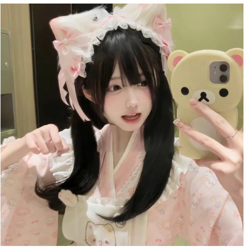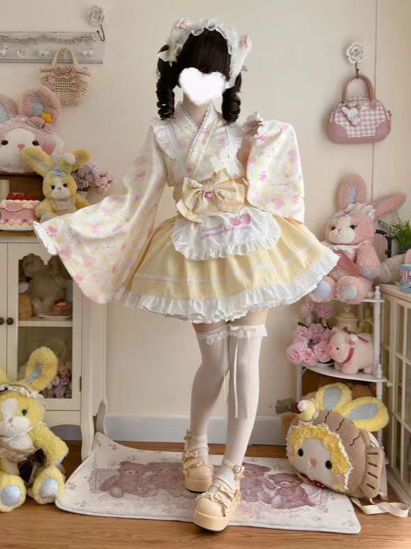 Розовый топ + юбка + фартук + бант на поясе; Синий топ + юбка + фартук + бант на поясе; Розовый топ + юбка + фартук + бант на поясе + головной убор + белые носки + коробка-самолет; Синий топ + юбка + фартук + бант на поясе + головной убор + белые чулки + коробка-самолет; Одинарная повязка на голову с кошачьими ушками розового цвета, один размер подходит всем; Синяя повязка на голову с одним кошачьим ухом, один размер подходит всем; Желтый топ + юбка + фартук + пояс с бантом