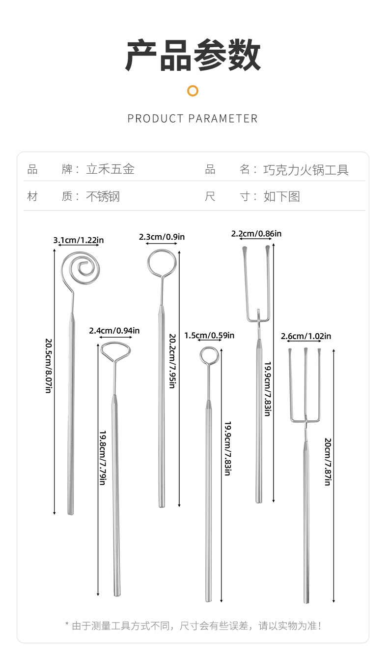 Шоколадная вилка из нержавеющей стали 21,4 г (две вилки); Шоколадная вилка из нержавеющей стали, 22,7 г (три зубца); Шоколадная вилка из нержавеющей стали 24г (треугольник); Шоколадная вилка из нержавеющей стали, 23,7 г (маленькая круглая); Шоколадная вилка из нержавеющей стали, 24,2 г (большая круглая); Шоколадная вилка из нержавеющей стали 26,2 г (спиральная); HQ6-480 Инструменты для шоколадного горячего горшка