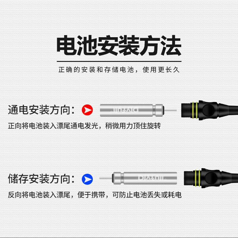 置于阴凉干燥处保存。电子漂在下水使用过后,请分解开来收藏保存,以便让侵入浮漂内的潮气、水份挥发,延长电子浮漂使用寿命。锂电池在高温环境下,容量会降低,并可能发生爆裂,请不要存放车内。