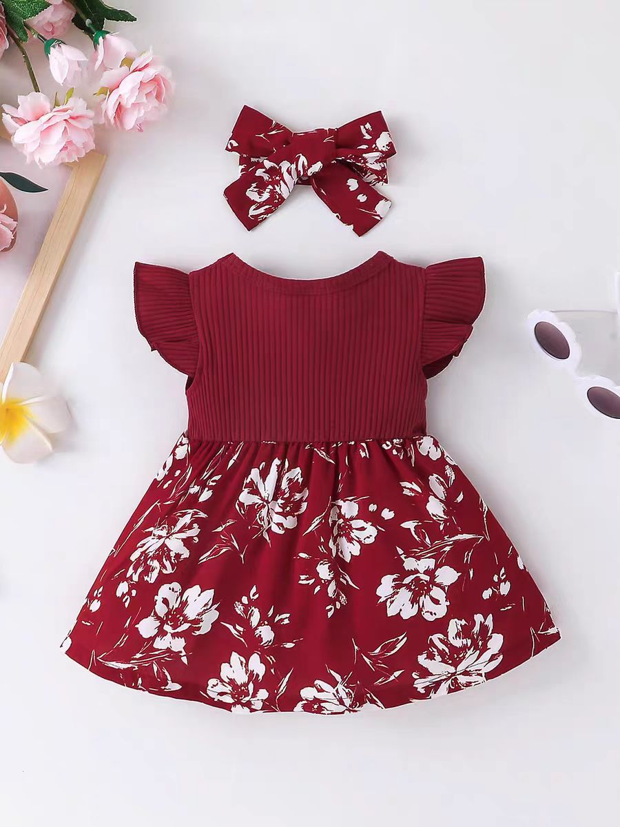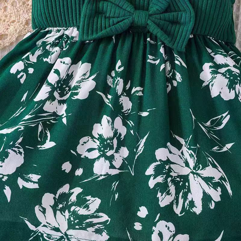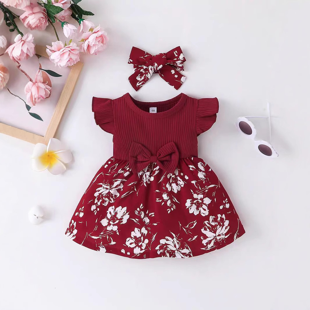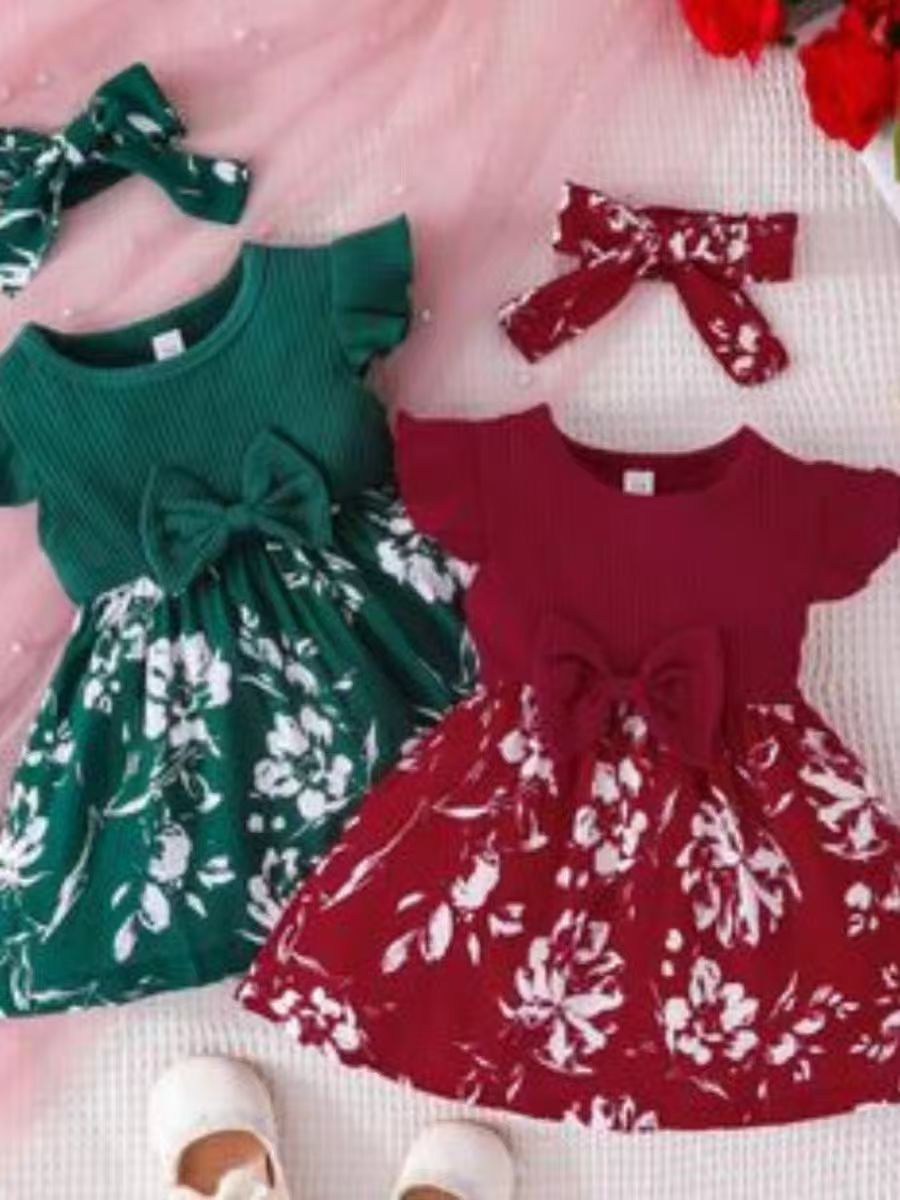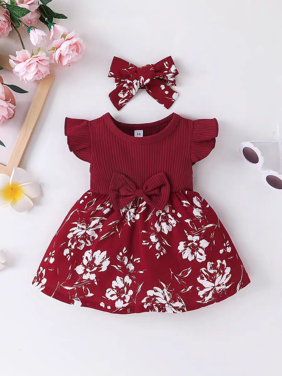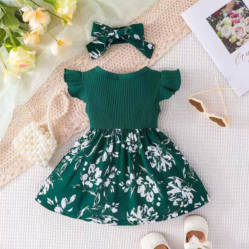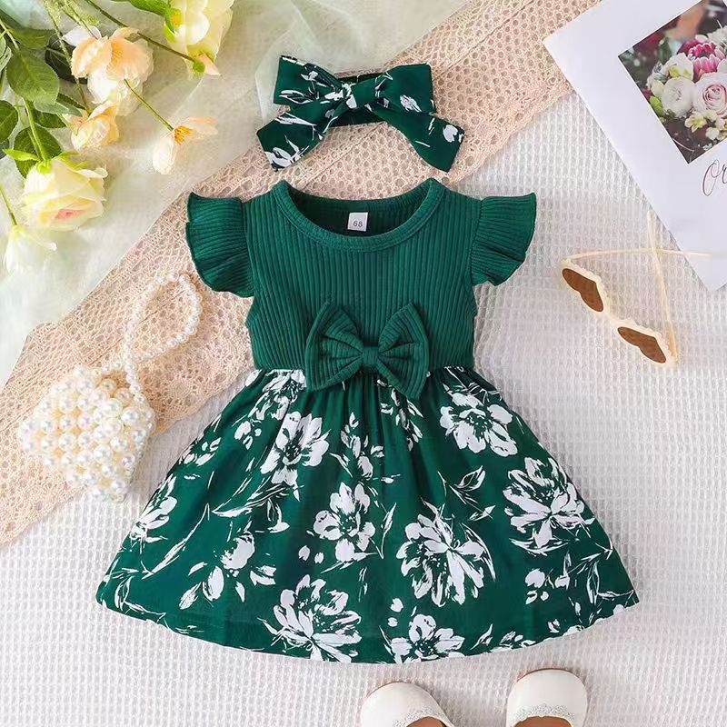 Трансграничные пятно маленькая девочка ins сладкий бант летающий рукав платье милый цветочный юбка тюрбан набор из двух частей