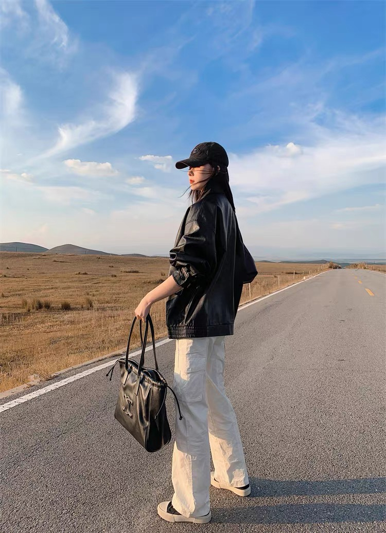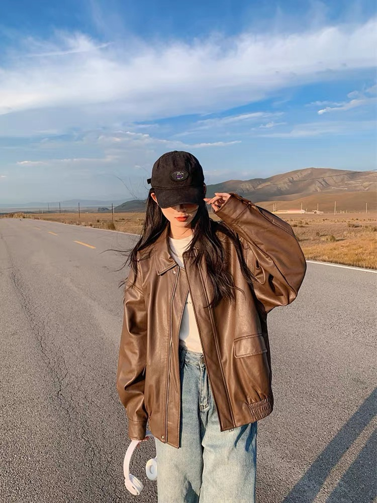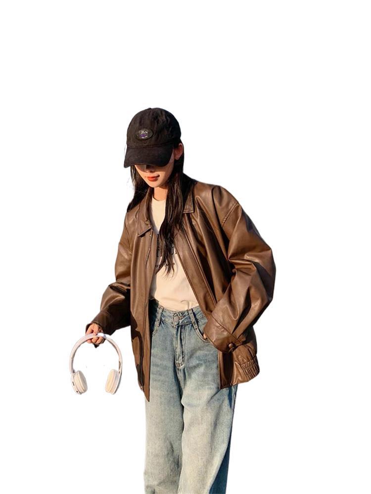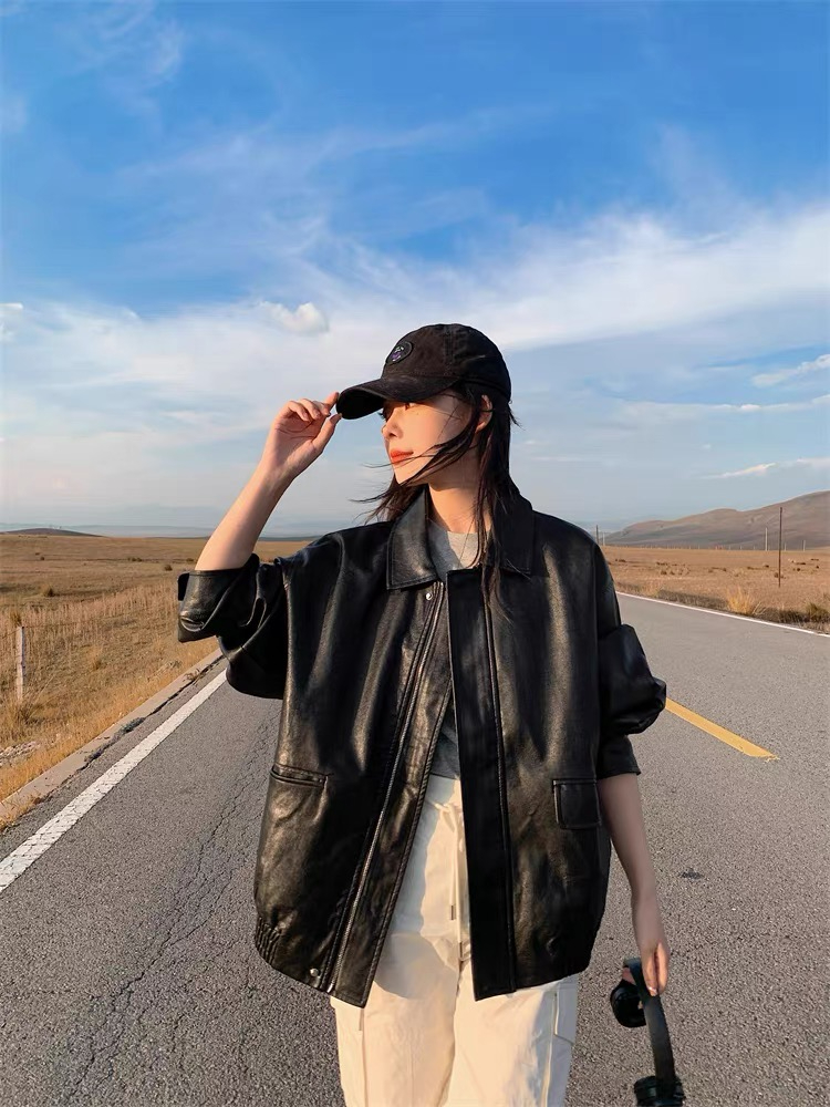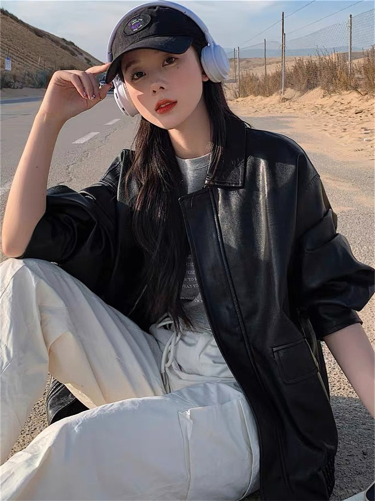 Кожаное пальто женский короткий 2024 осень новый гонконгский ветер черный pu маленький американский ретро автомобиль костюм куртка