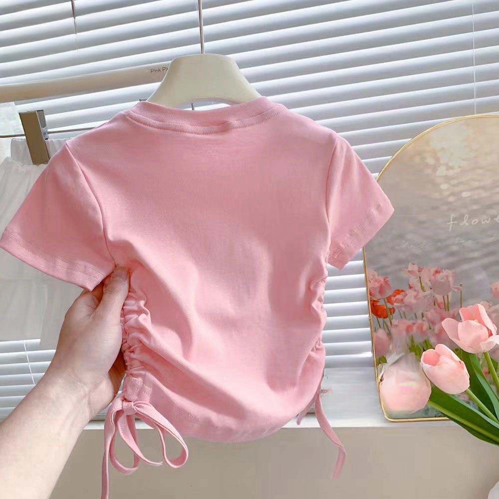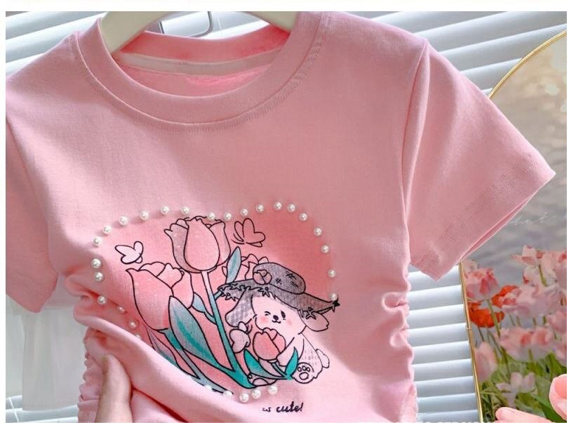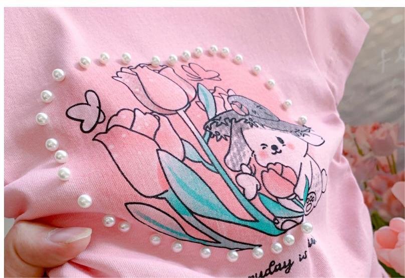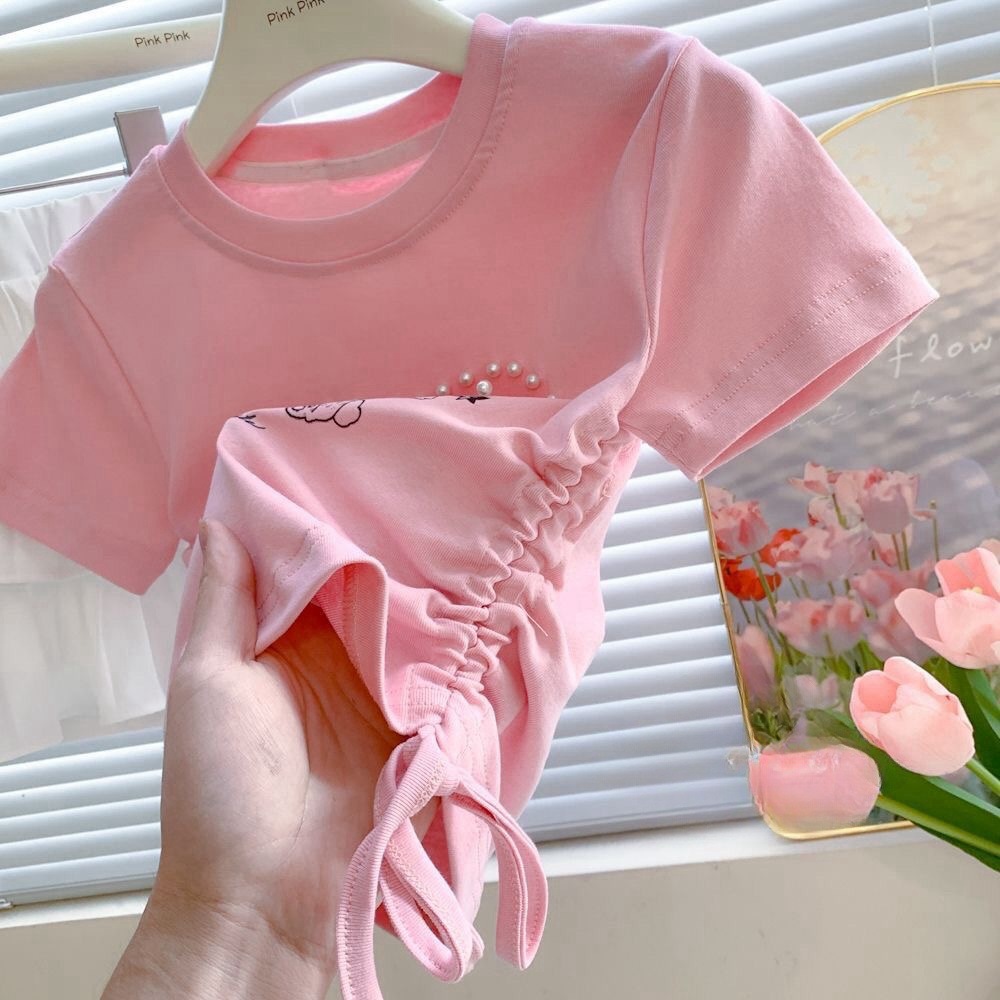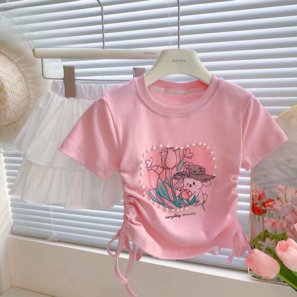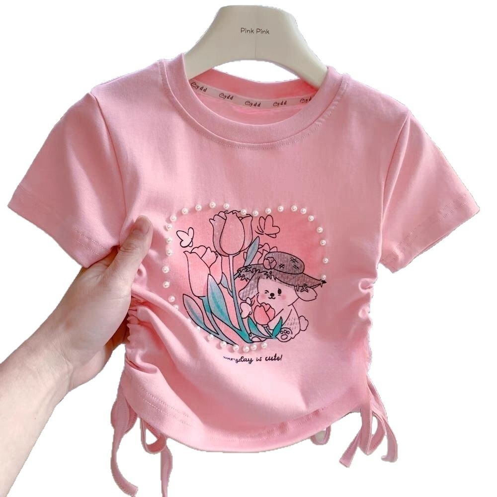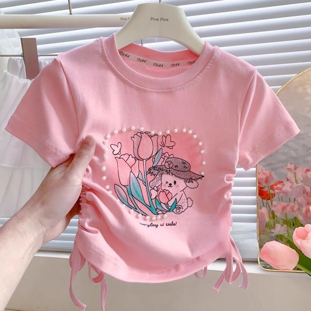 Веревка с коротким рукавом блузка 2025 летняя новая девушка ребенок жемчуг любовь сладкая мультяшная футболка с короткими рукавами летом