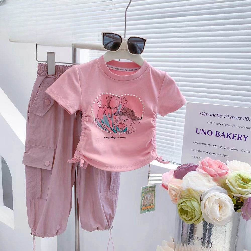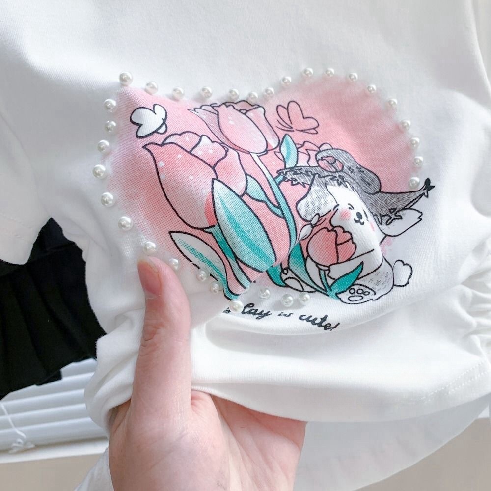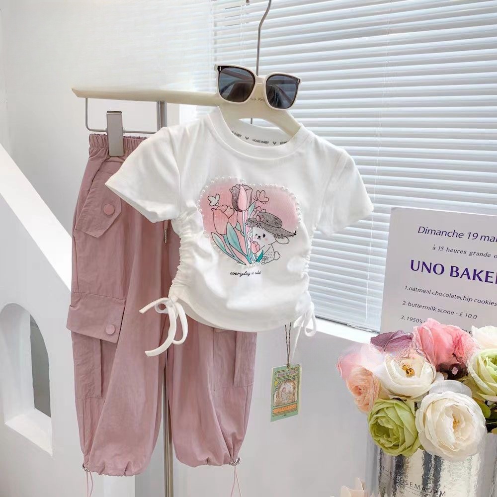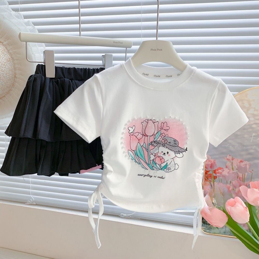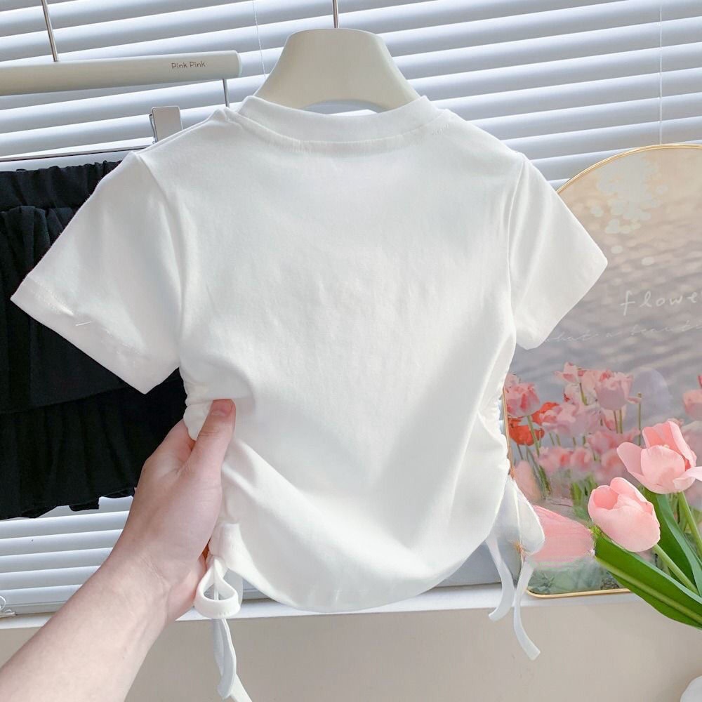 Веревка с коротким рукавом блузка 2025 летняя новая девушка ребенок жемчуг любовь сладкая мультяшная футболка с короткими рукавами летом