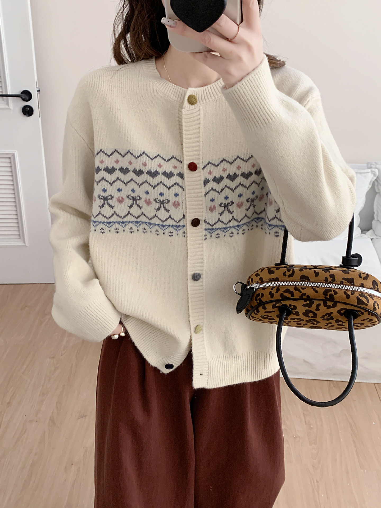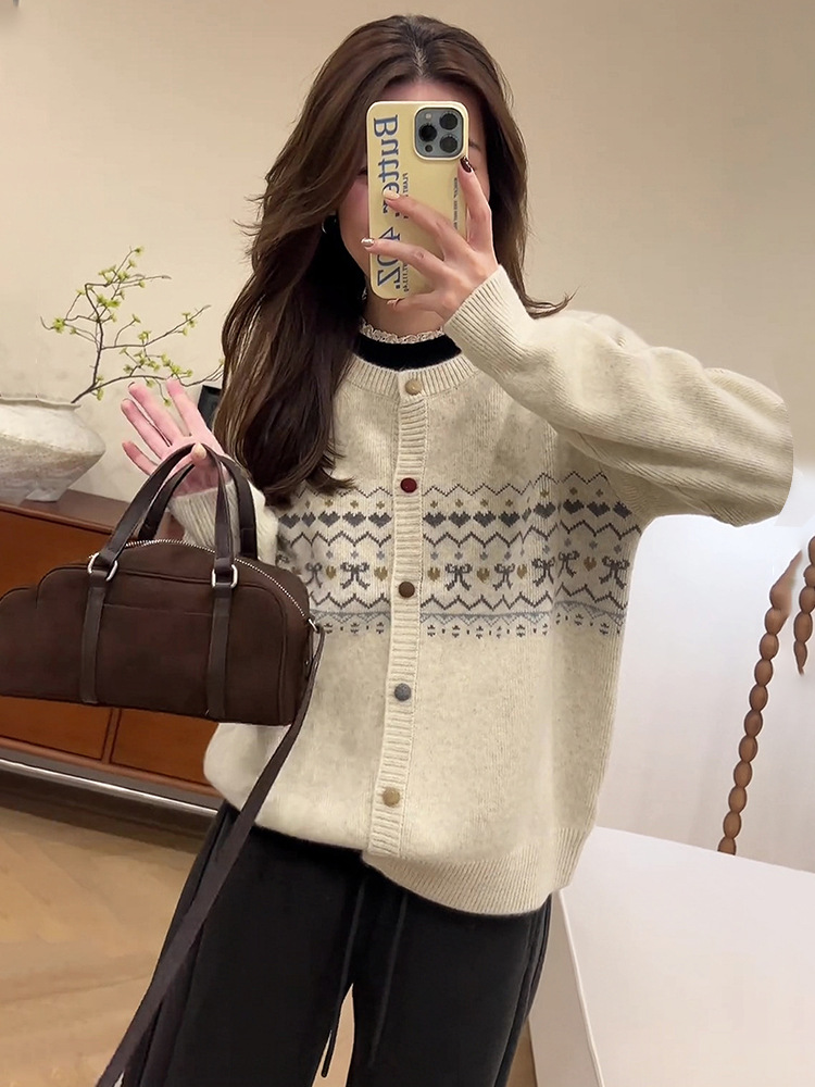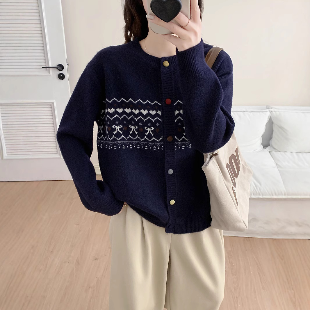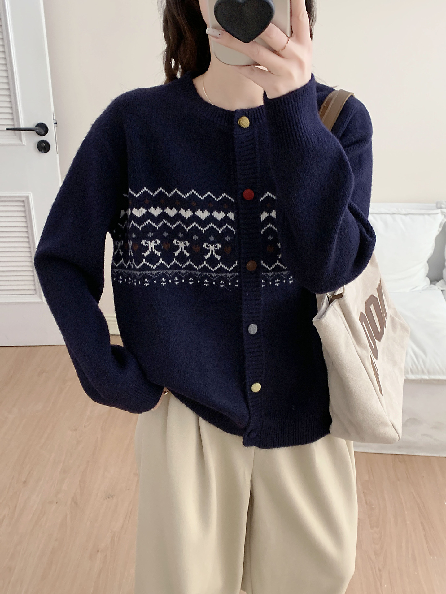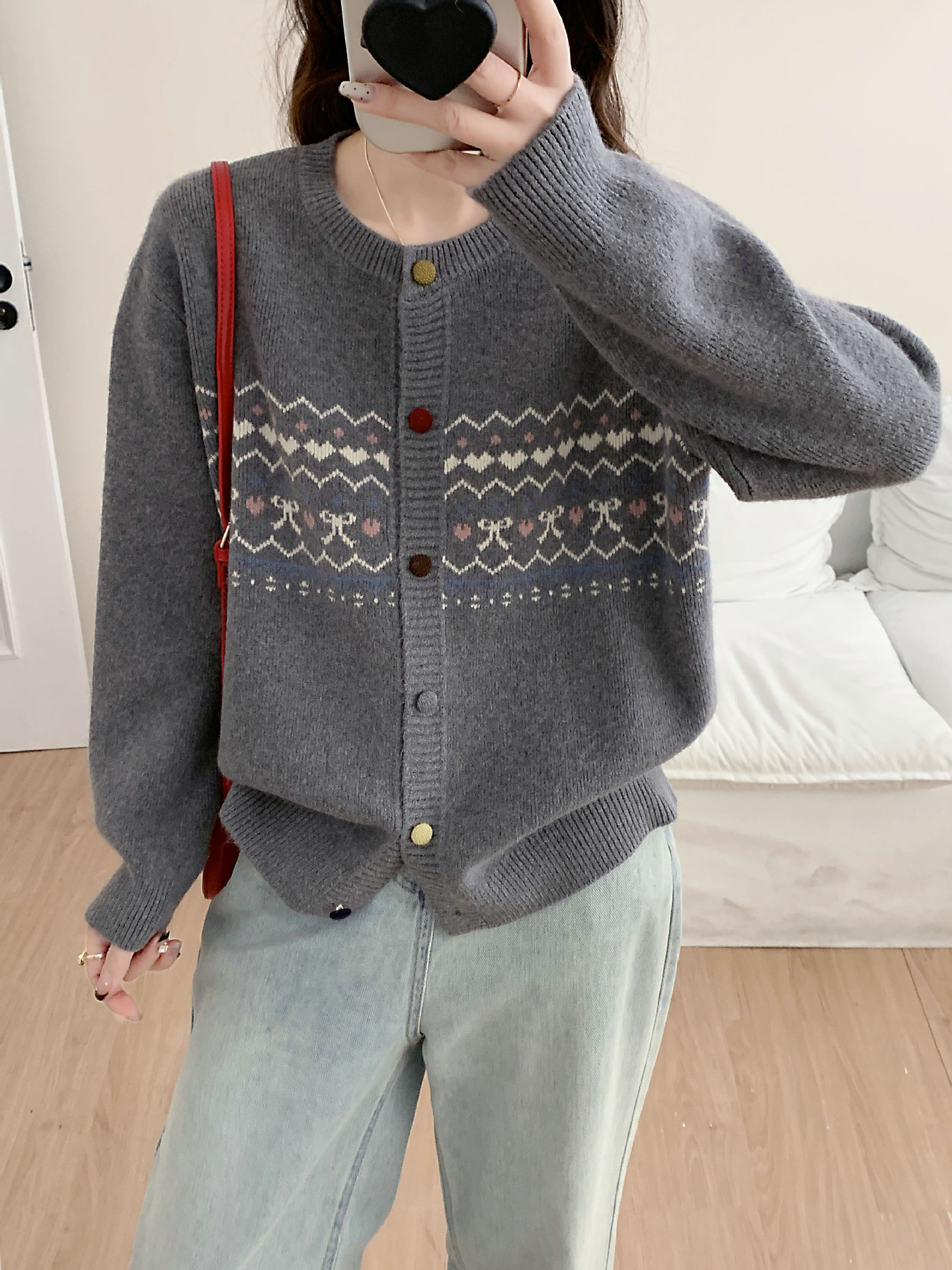 Большой размер женская весна и осень корейская версия контрастного жаккарда вязаный кардиган ленивый ветер свободный топ свитер с круглым вырезом