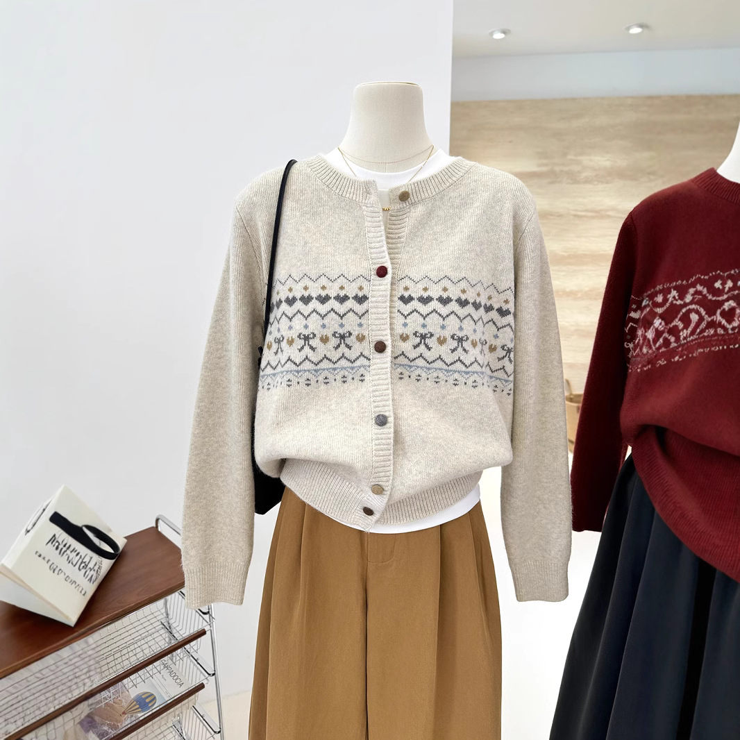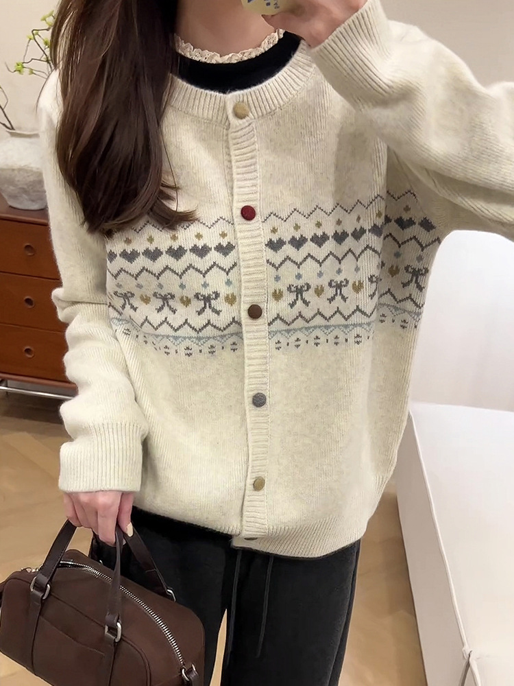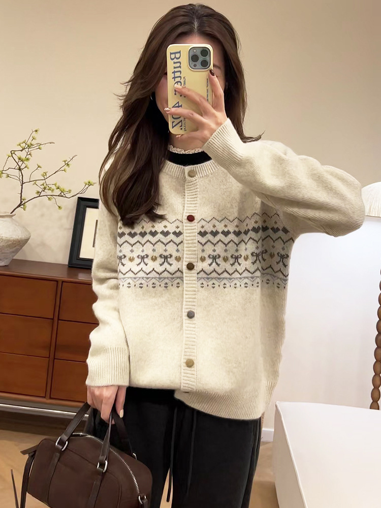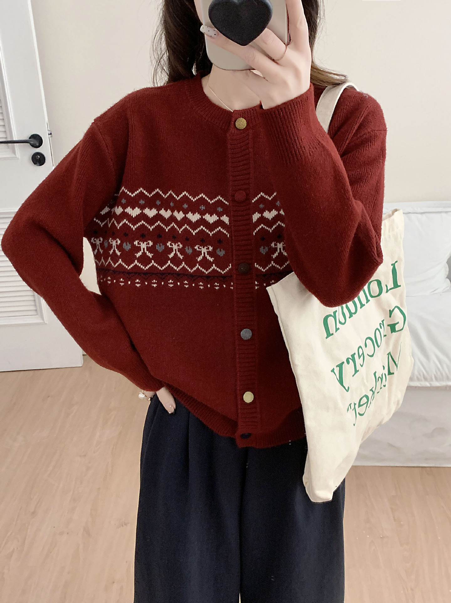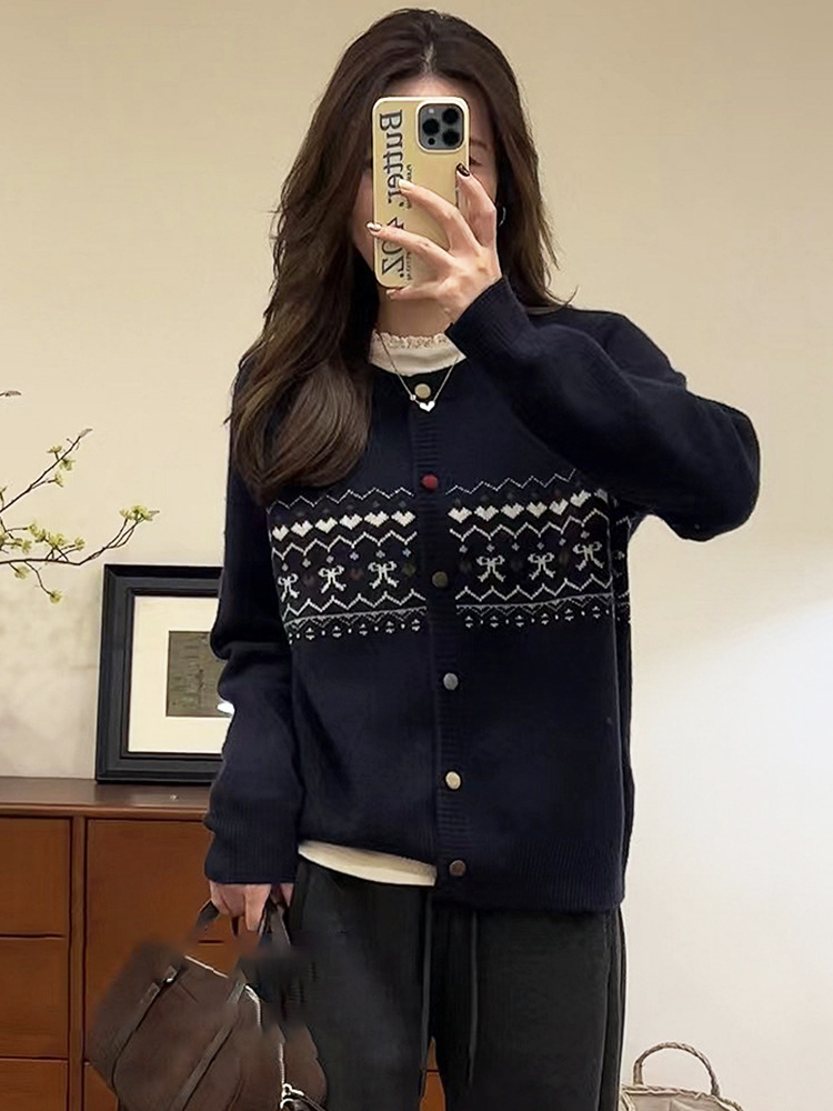 Большой размер женская весна и осень корейская версия контрастного жаккарда вязаный кардиган ленивый ветер свободный топ свитер с круглым вырезом