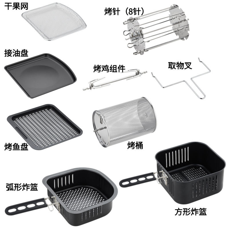 RC001; Полный комплект RC001 поставляется напрямую со склада.; Сеть сухофруктов; Масляный поддон; Компоненты жареной курицы; клетка для гриля; Кебабы (10 игл); вилка; Тарелка с рыбой на гриле; квадратный жареный синий; Изогнутая жареная синька